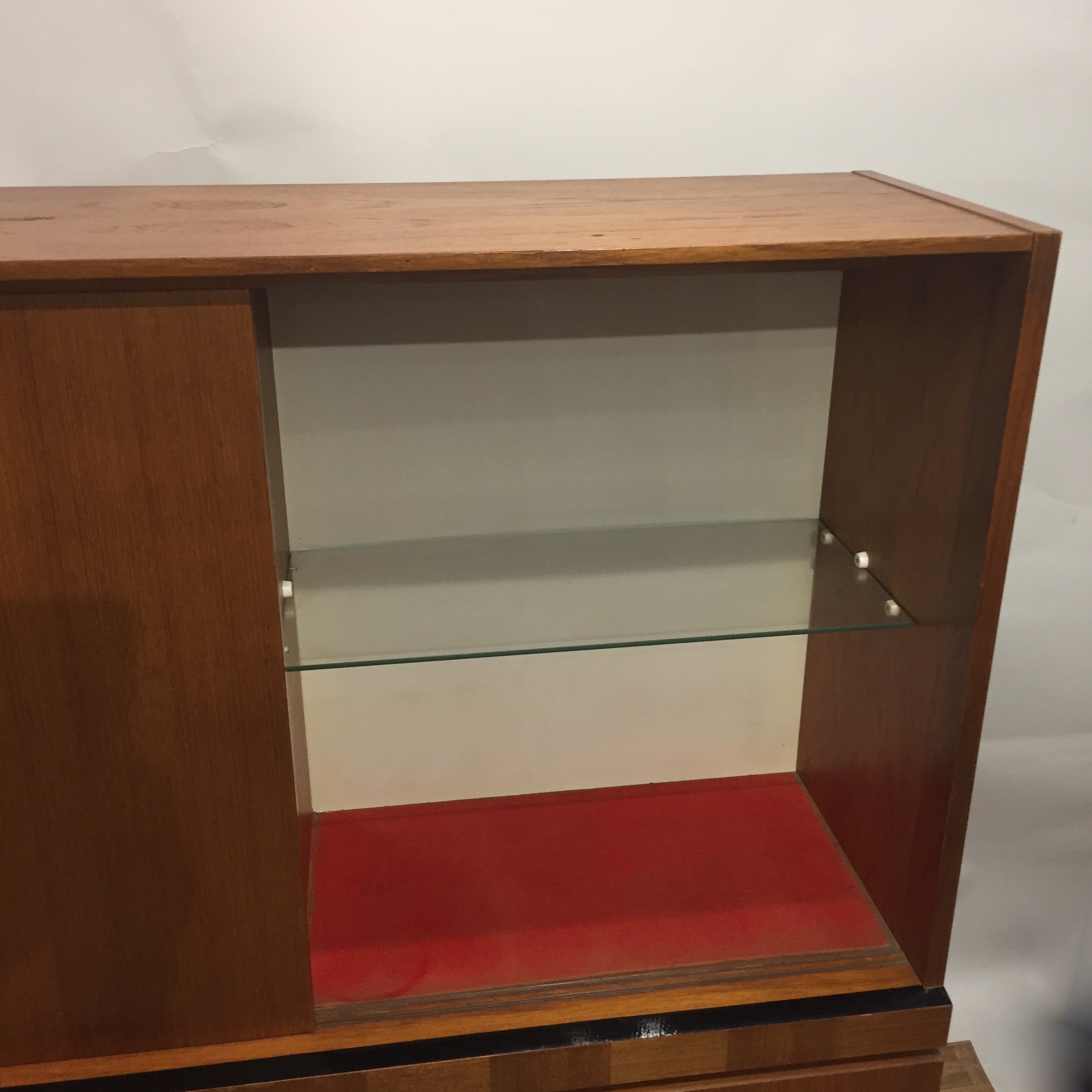 Très joli buffet de style scandinave, des années 60, en teck. Il est pratique avec sa porte coulissante, ses étagères et son compartiment de rangement en bas. A l »origine, on y rangeait la vaisselle, mais on peut en faire aussi une petite bibliothèque dans le salon ou le bureau.