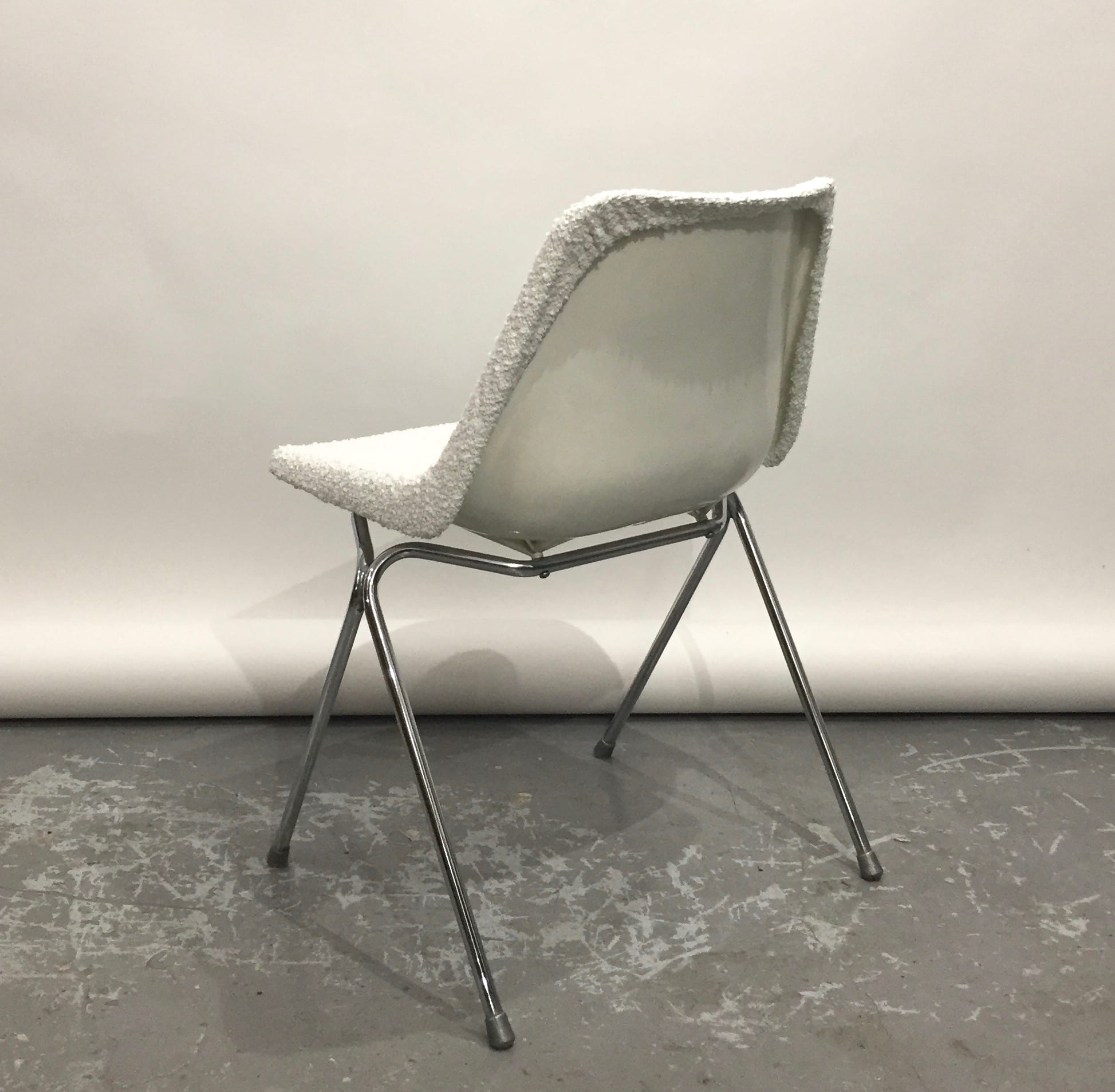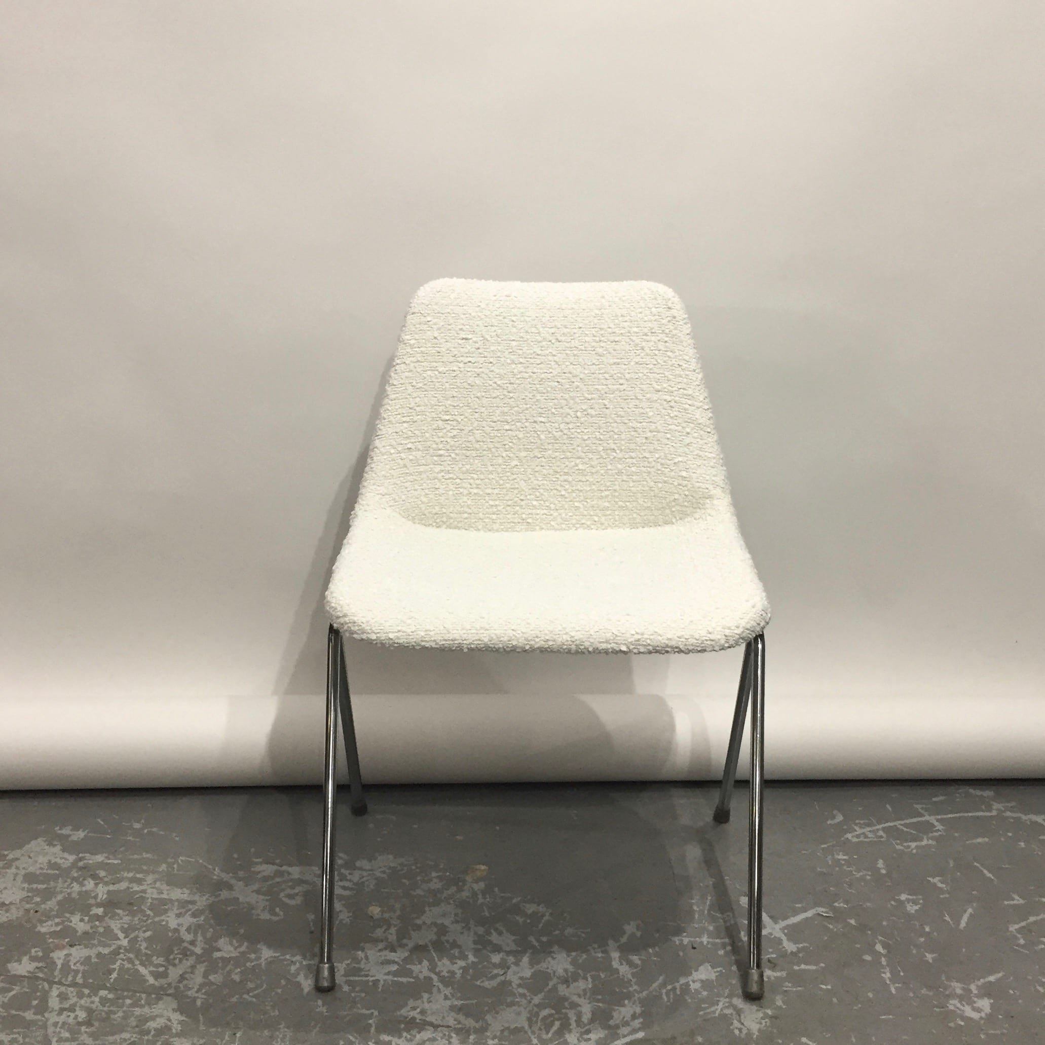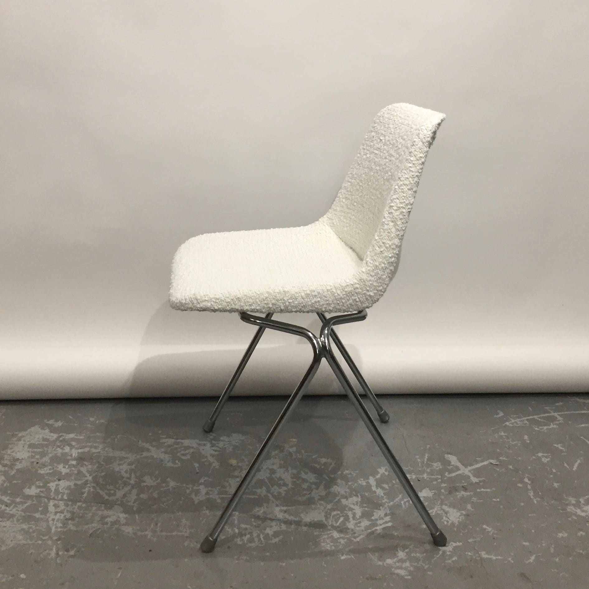 Superbe chaise des années 70 du designer anglais Robin Day pour l’éditeur Hill. Coque en plastique blanc, recouverte d’une housse en bouclette blanc sur un piètement en métal chromé, elle est très confortable et toute légère, parfaite pour accompagner votre bureau, non?