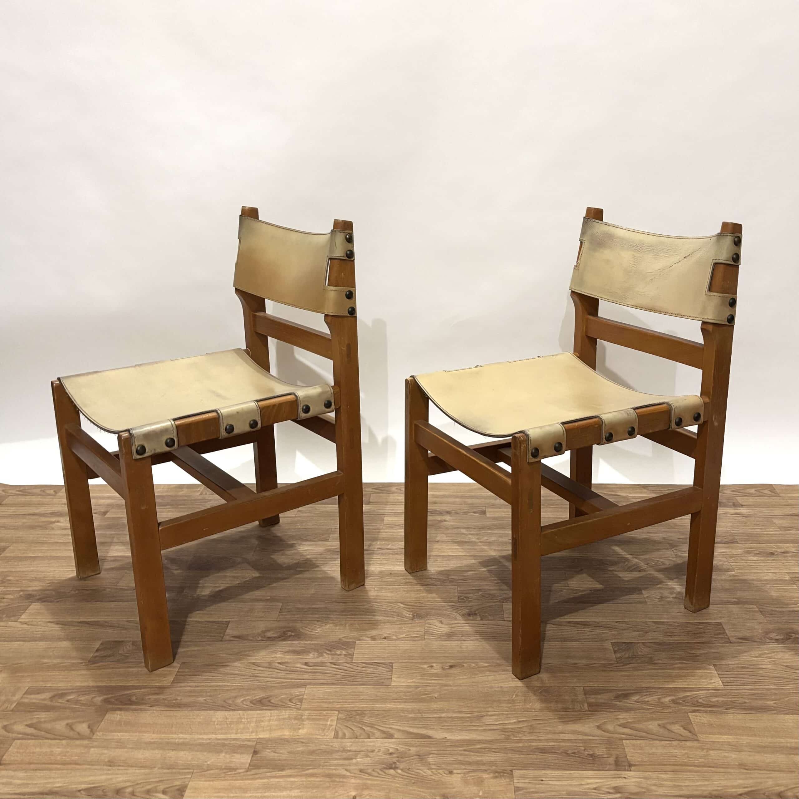 Dans leur jus en bon état, quelques traces d’usure normale du temps sur le bois visibles sur les photos, le cuir d’origine est un peu abîmé mais ça leur donne beaucoup de cachet.