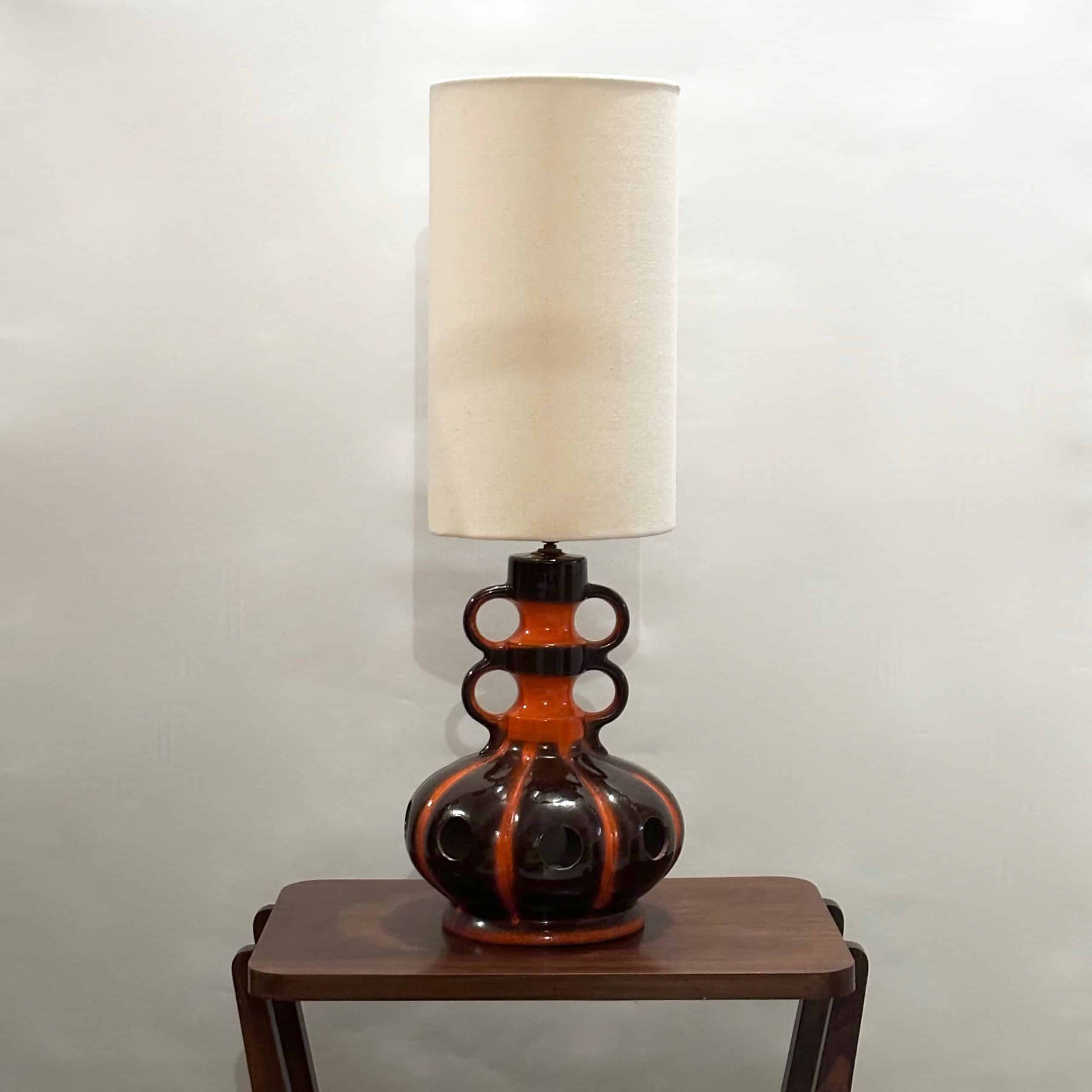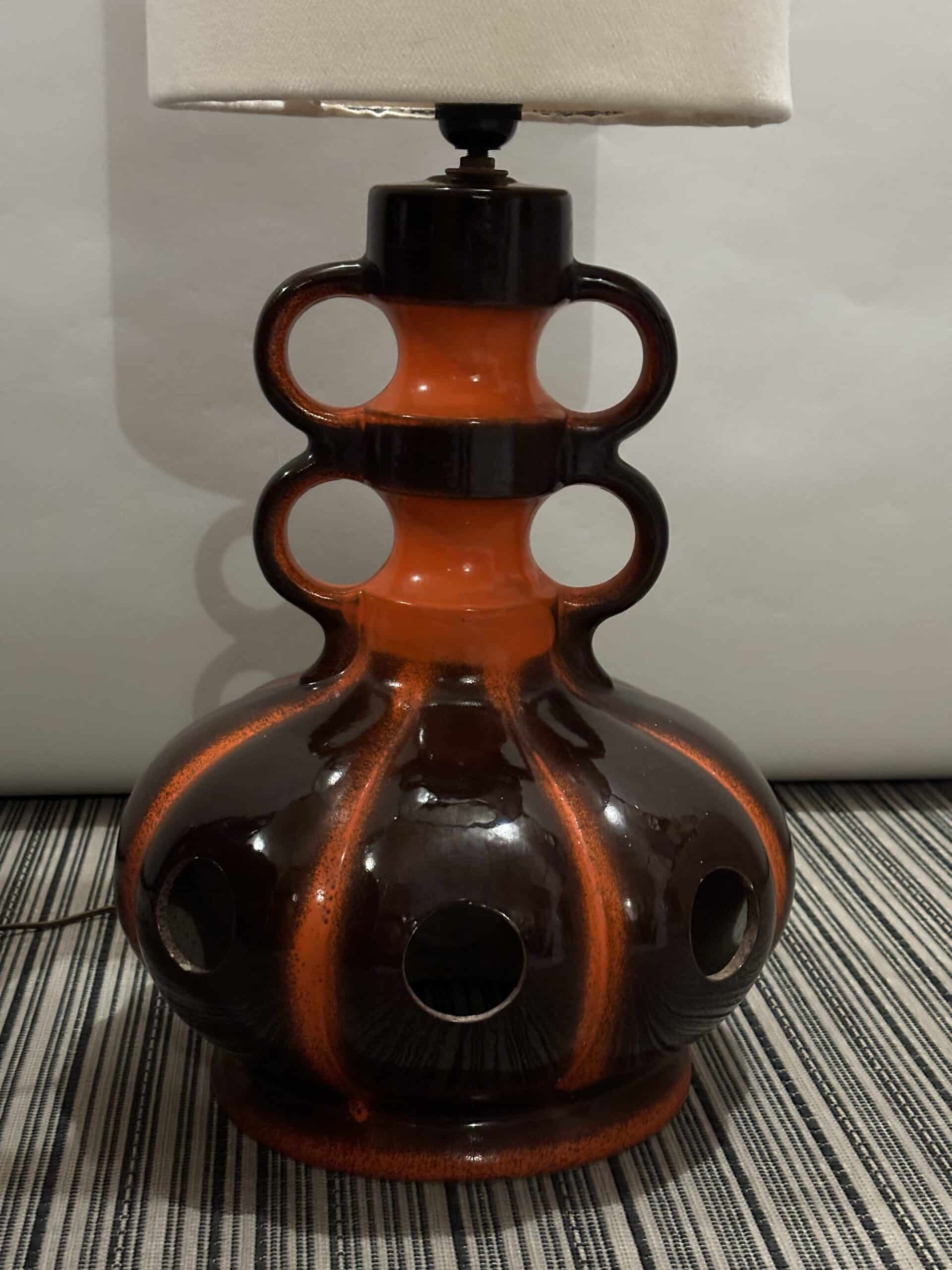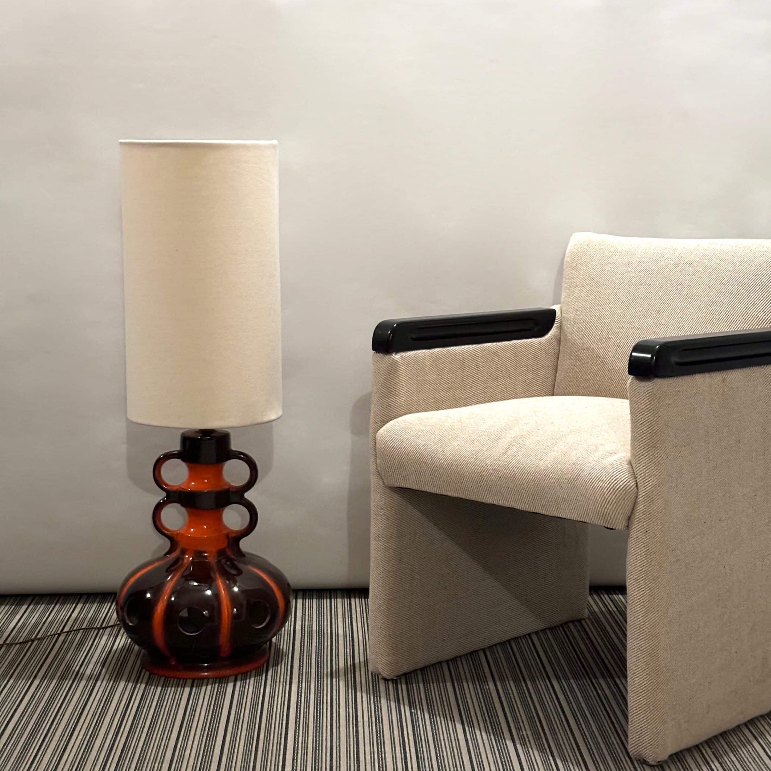 Très belle lampe de sol des années 70 avec un pied en céramique orange et marron et un abat-jour en tissu crème. Il offre un double éclairage, par l’abat-jour et par le socle percé. Design et coloris typiques des seventies, pour une lumière d’appoint dans le salon ou la chambre.