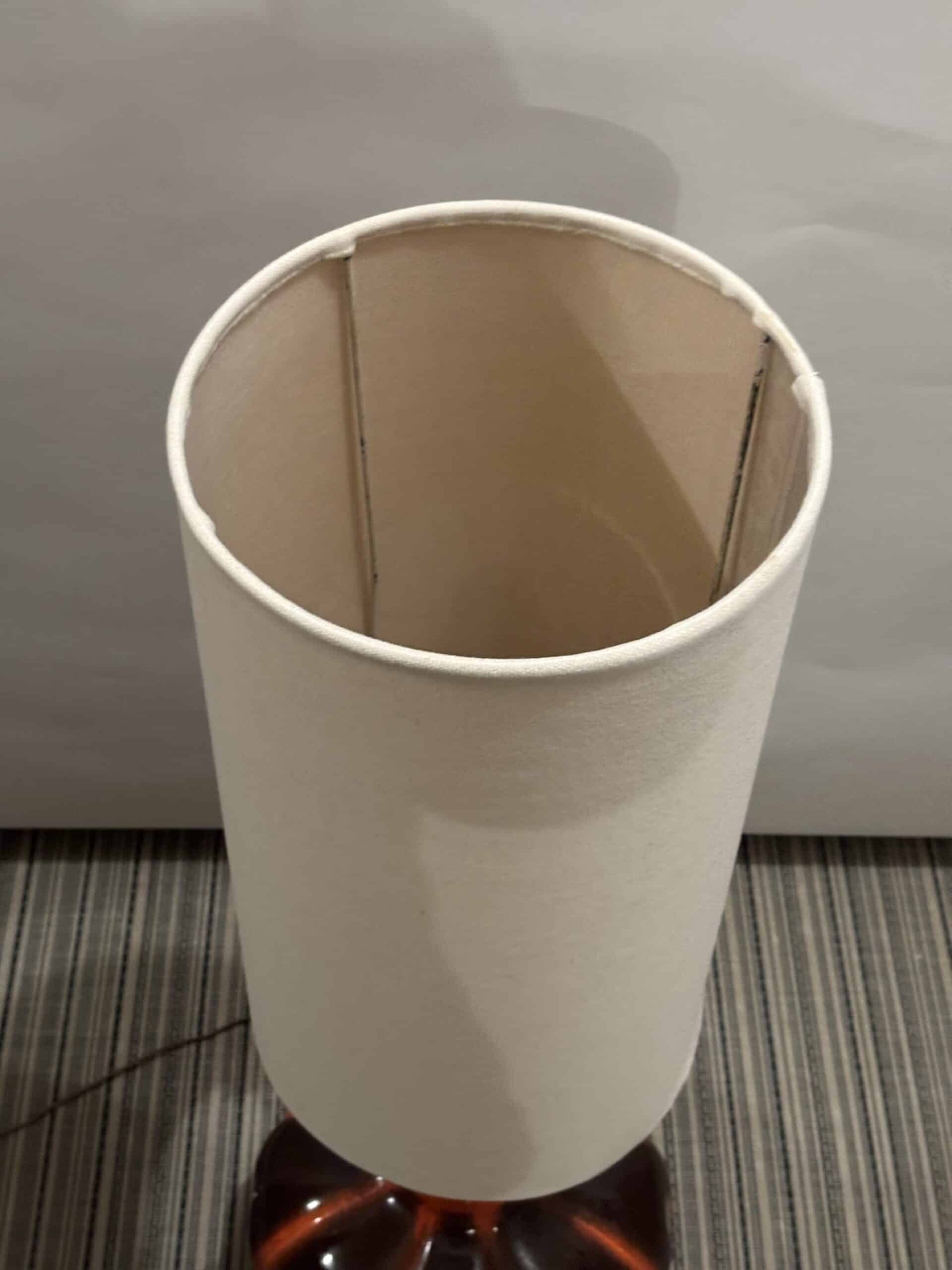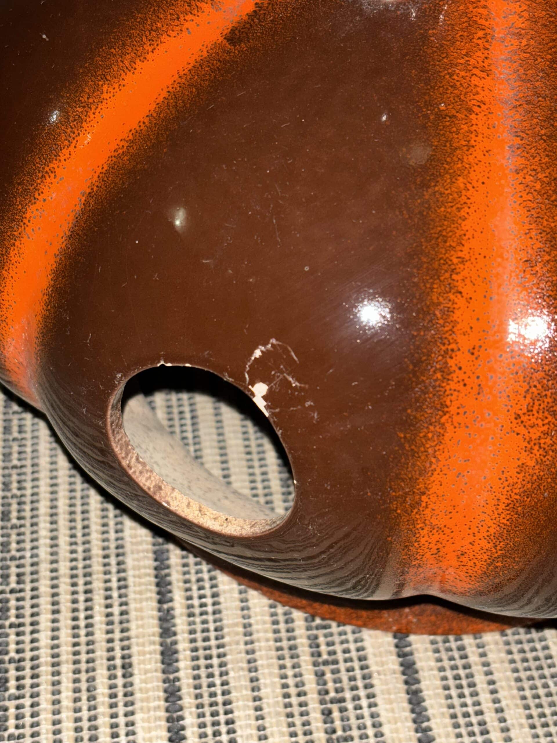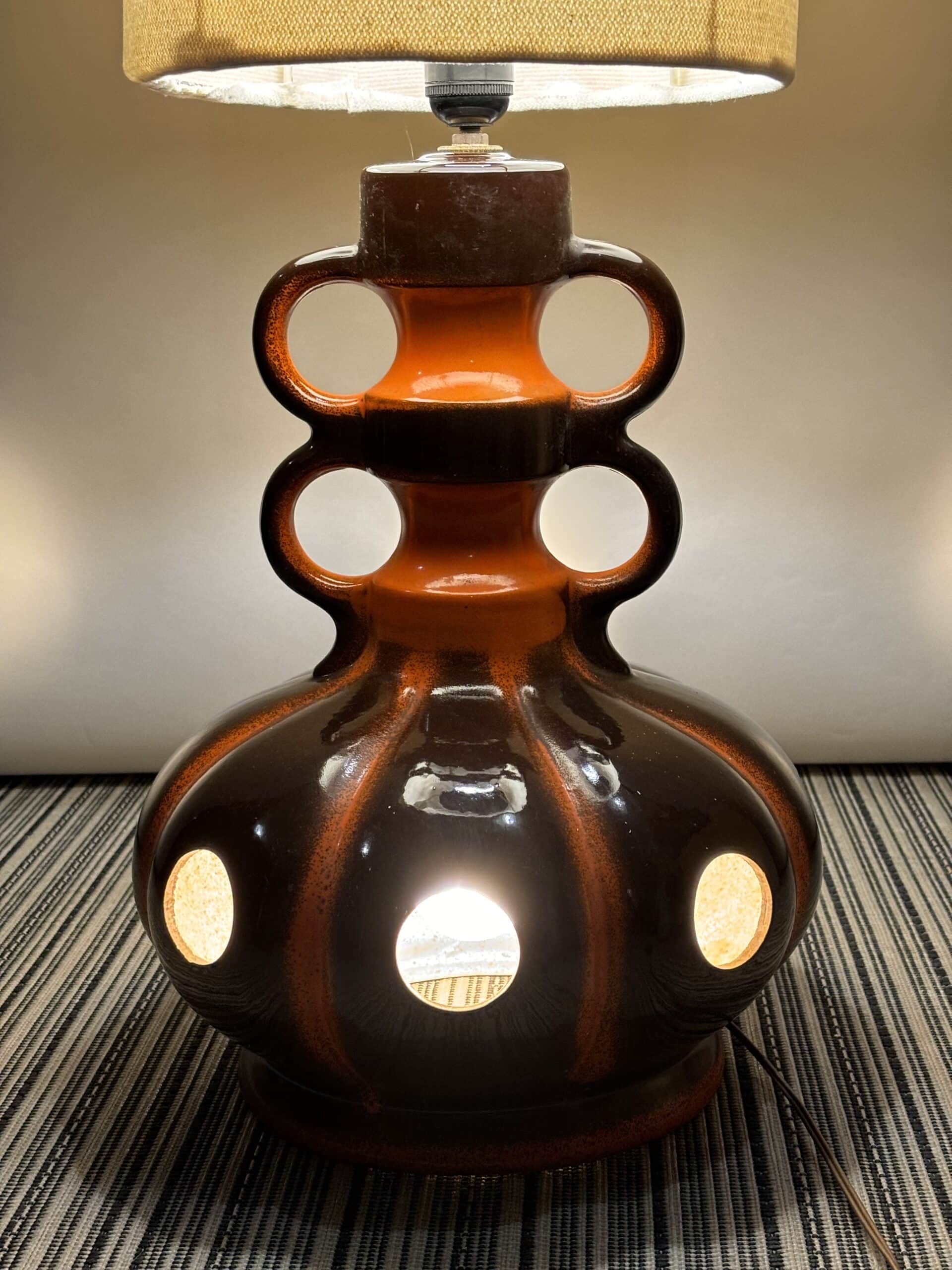 Très belle lampe de sol des années 70 avec un pied en céramique orange et marron et un abat-jour en tissu crème. Il offre un double éclairage, par l’abat-jour et par le socle percé. Design et coloris typiques des seventies, pour une lumière d’appoint dans le salon ou la chambre.