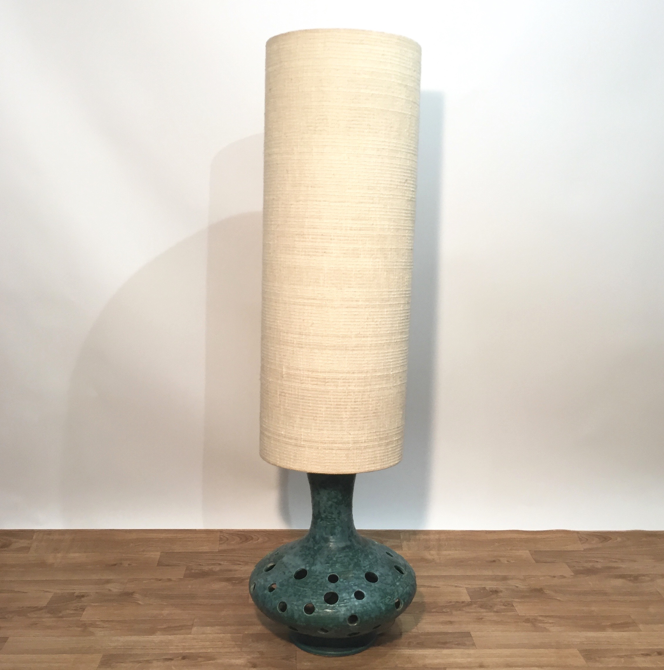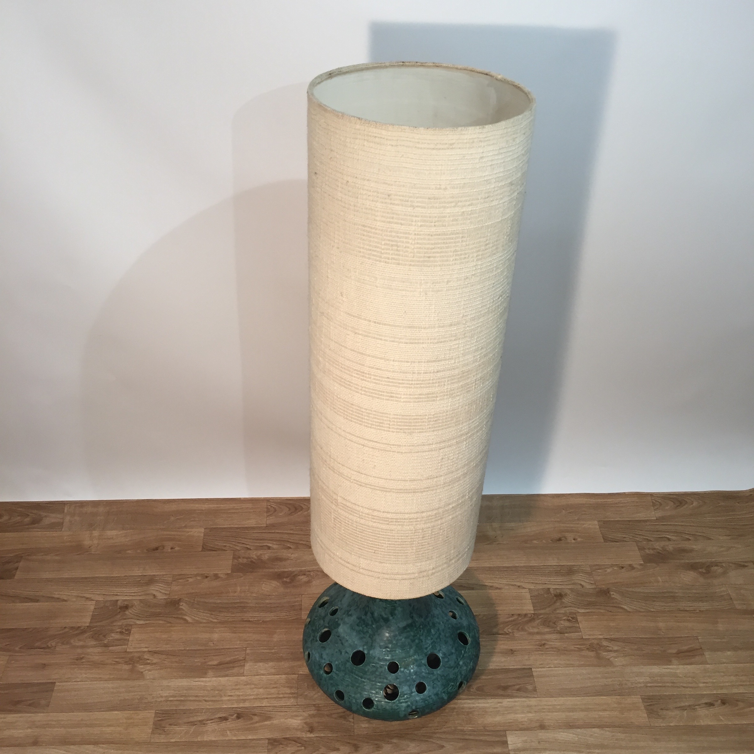 Jolie lampe de sol des années 70 avec un pied céramique bleue et un abat-jour en cône brodé. Elle offre un bel éclairage et constitue une pièce élégante pour le séjour ou la chambre.