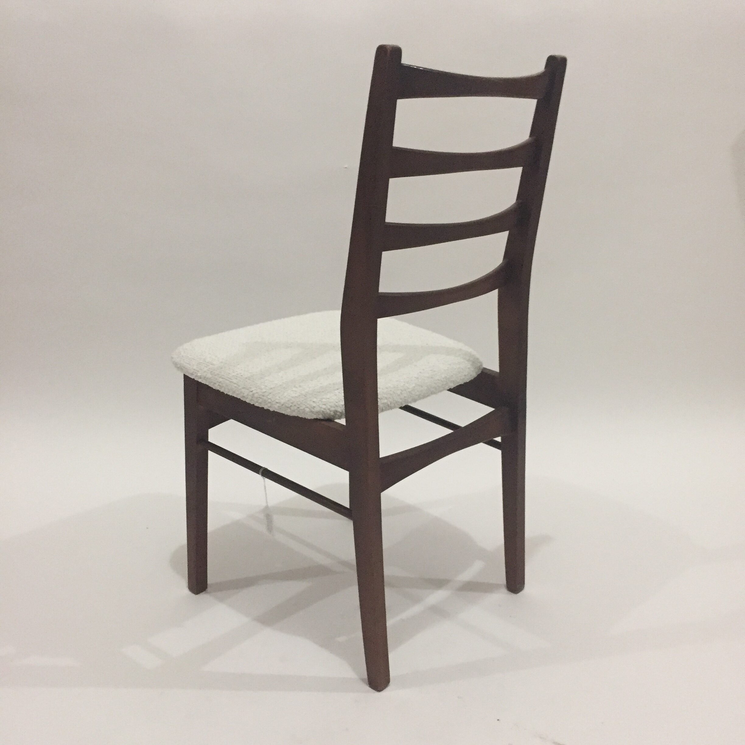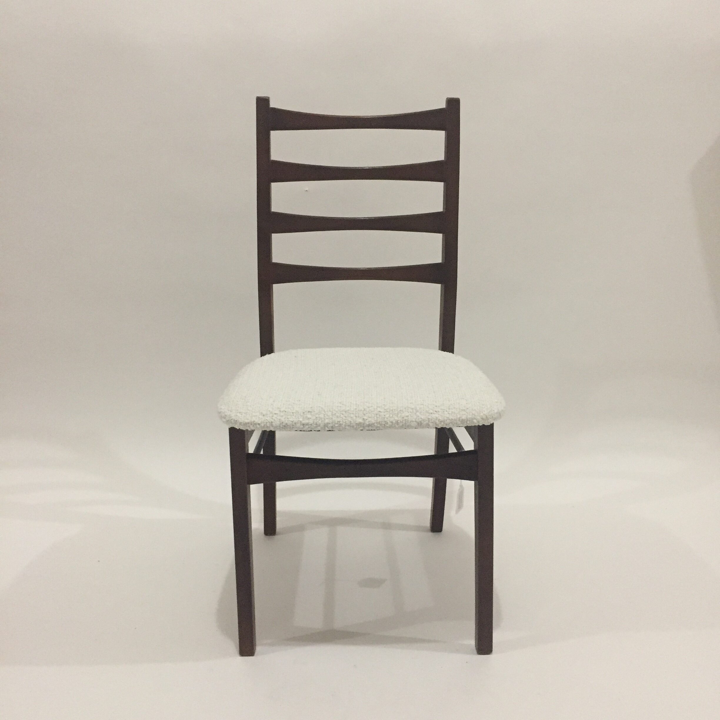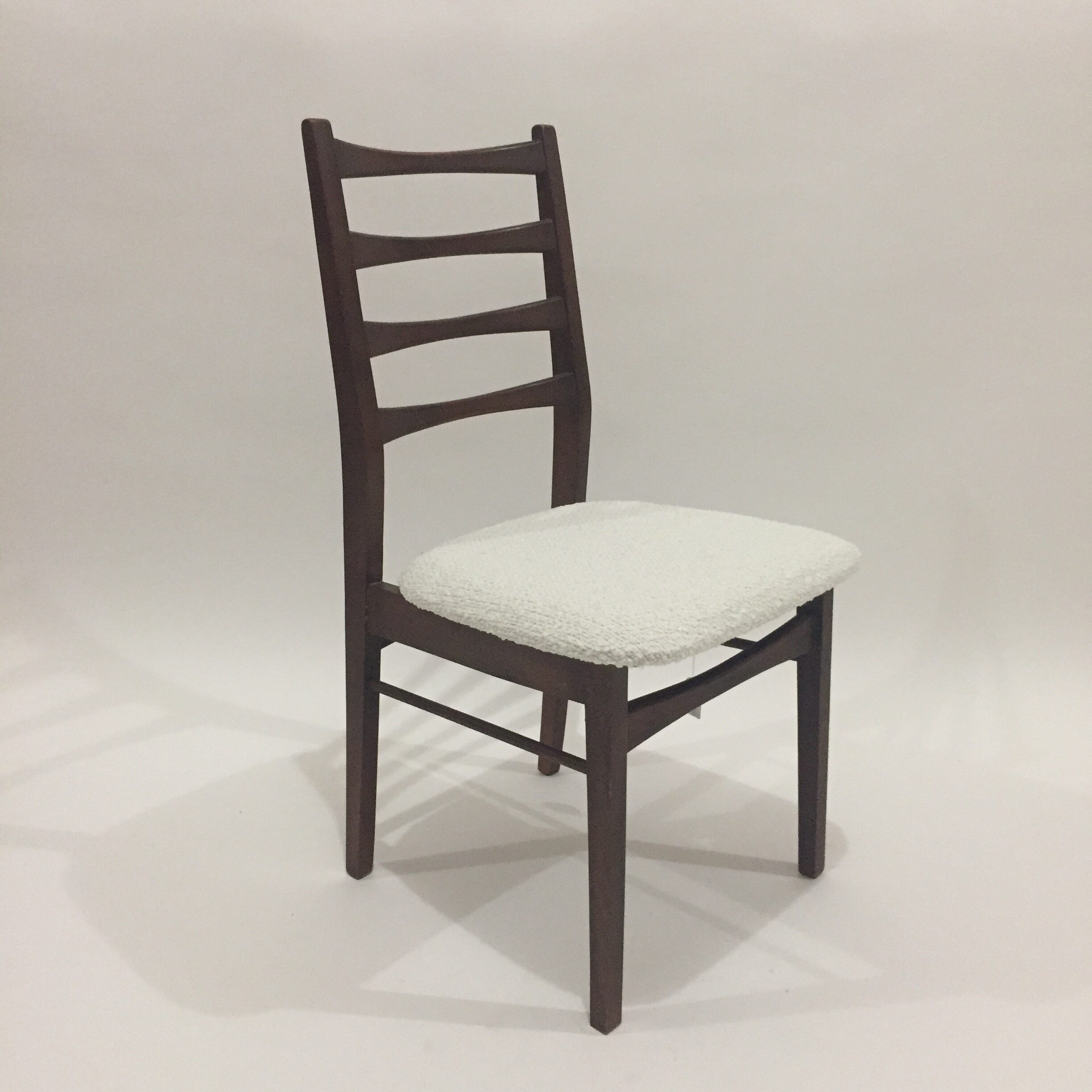 Jolie chaise des années 60 de style scandinave avec un dossier à barreaux et une assise que nous avons retapissée en bouclette écru doux et lumineux. Légère et élégante, elle accompagnera facilement tout style de bureau.
