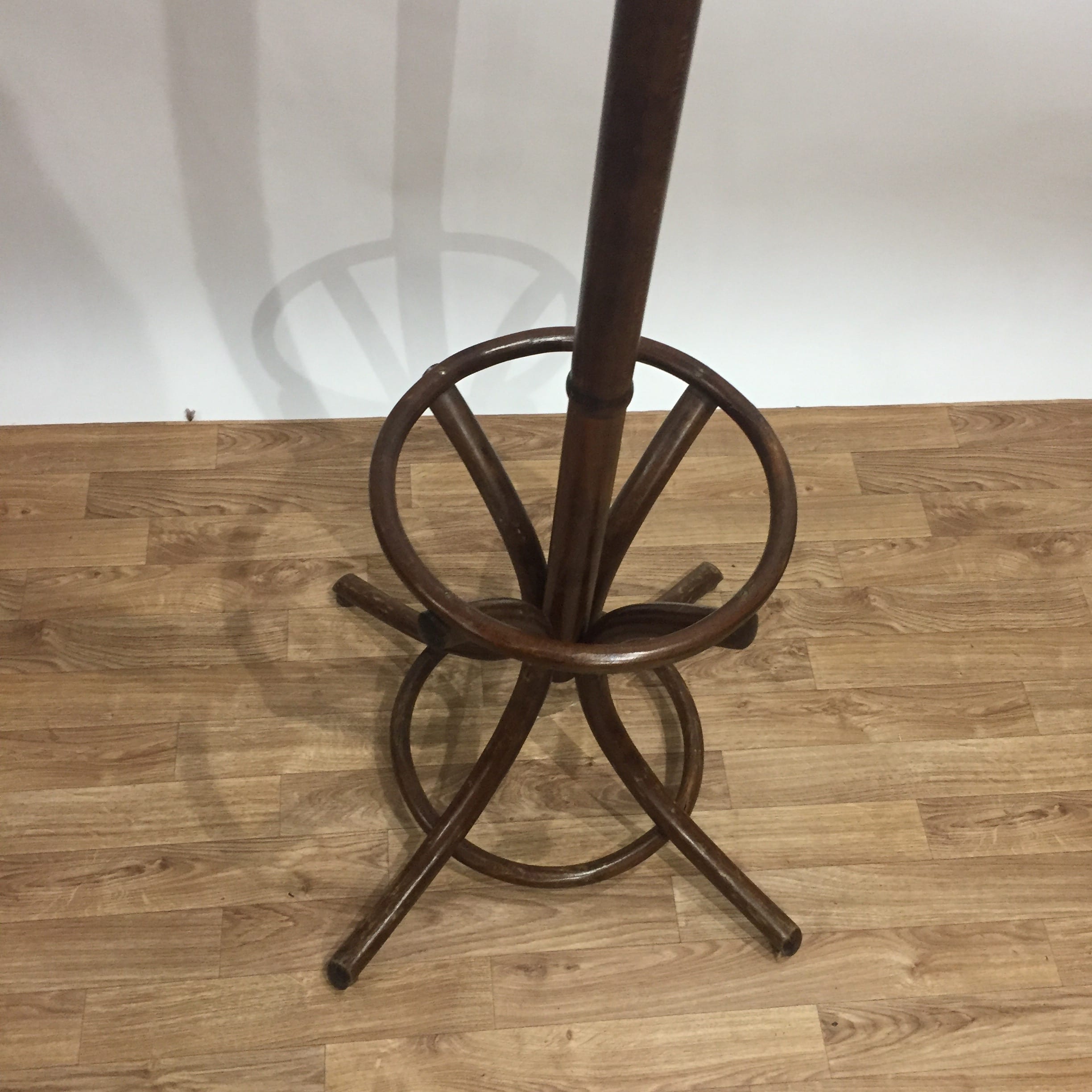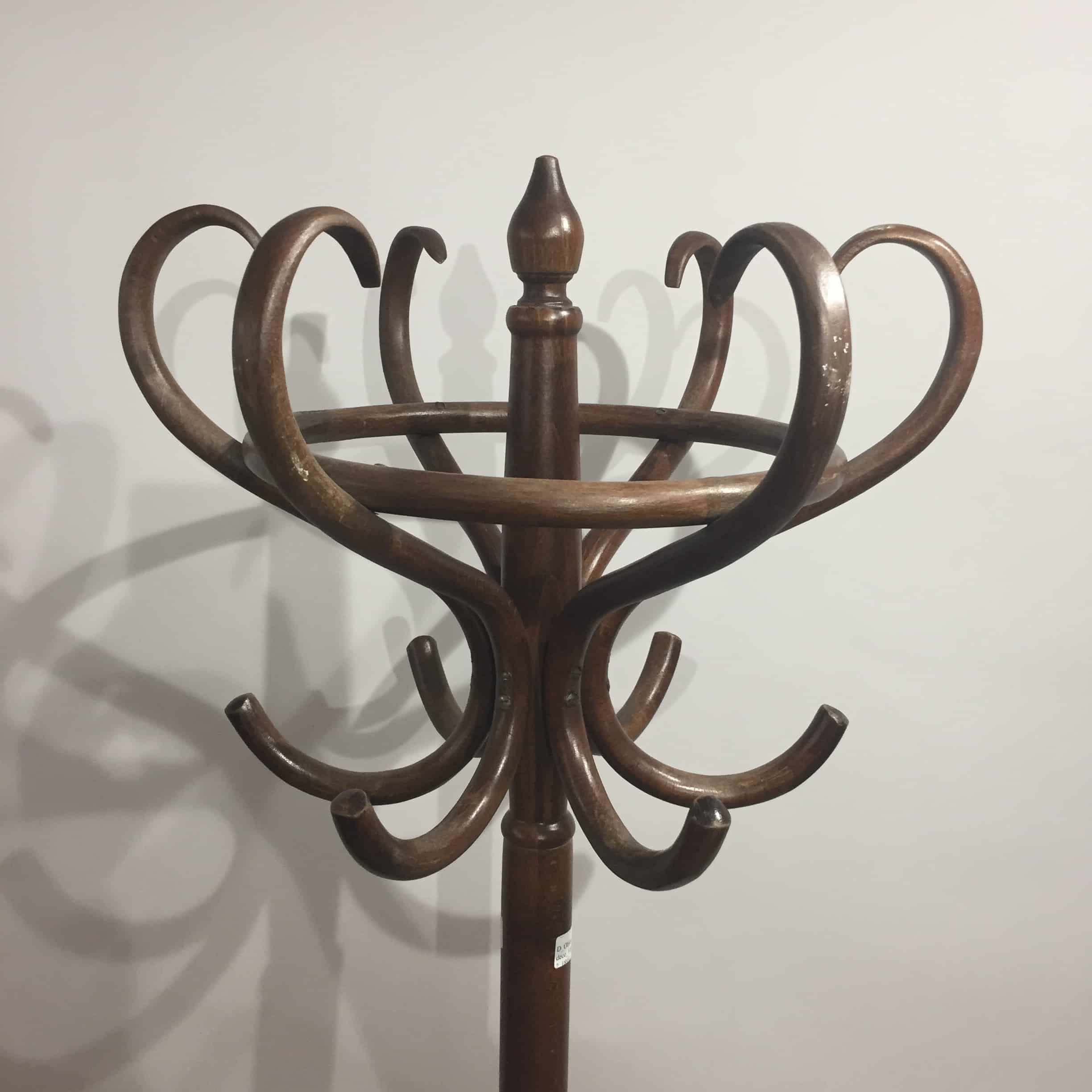 Porte-manteaux sur pied perroquet de bistrot des années 60, tout en bois massif foncé. Il est solide et pratique car la corolle tourne sur elle-même.