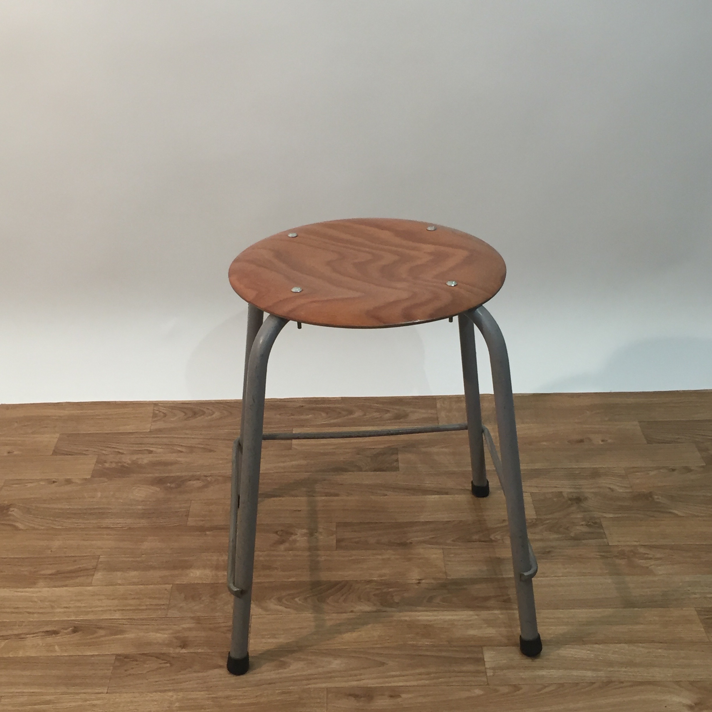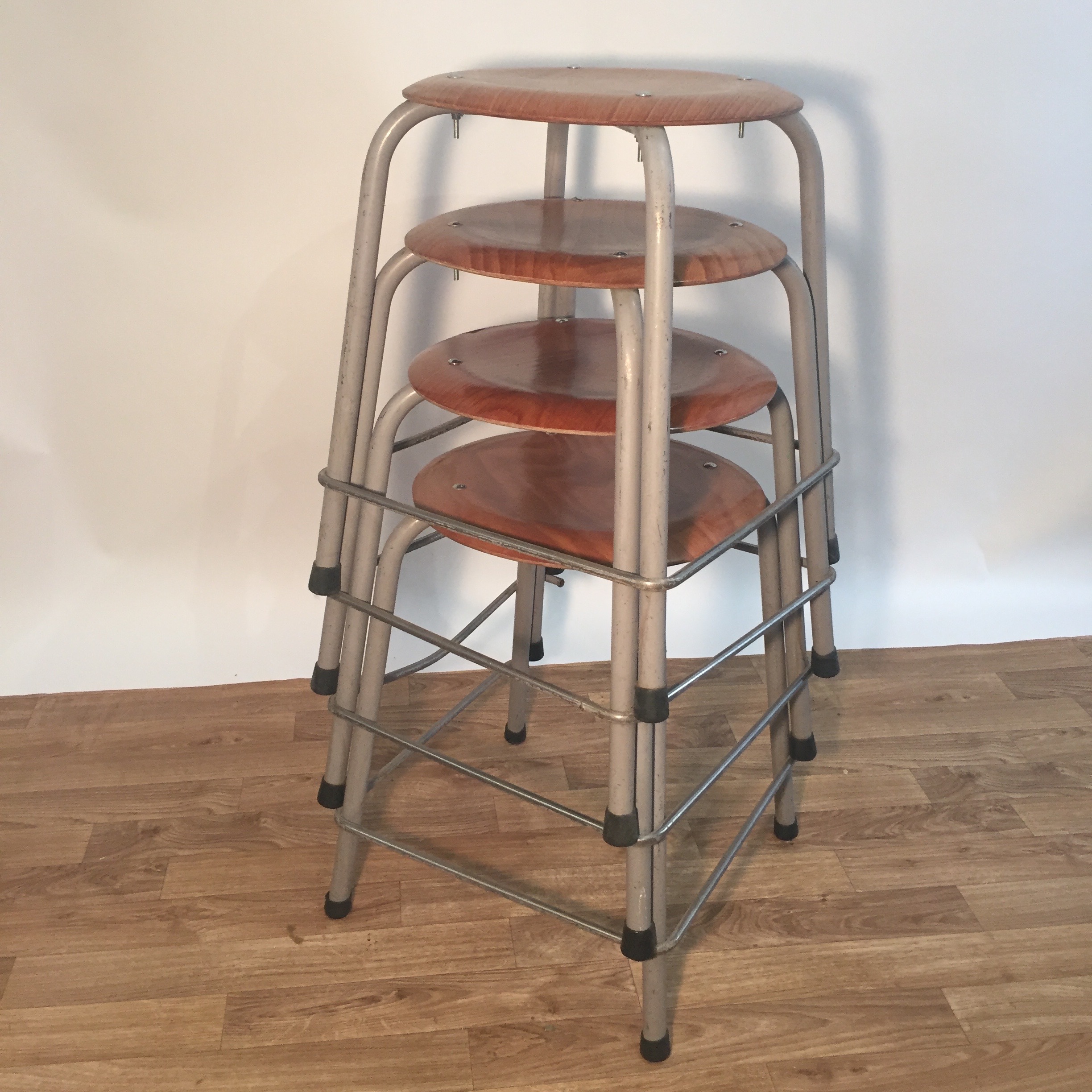 Série de 4 tabourets hollandais des années 60 en pagholz sur un piètement en métal. De style industriel, ils sont pratiques car empilables et on peut les utiliser comme assises ou bien tables d’appoint. Vendus en lot de 4 uniquement, prix indiqué pour le lot.