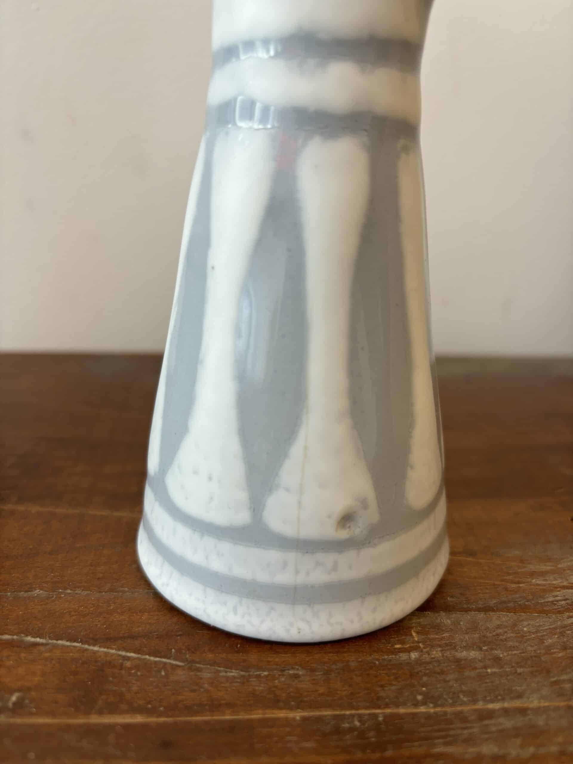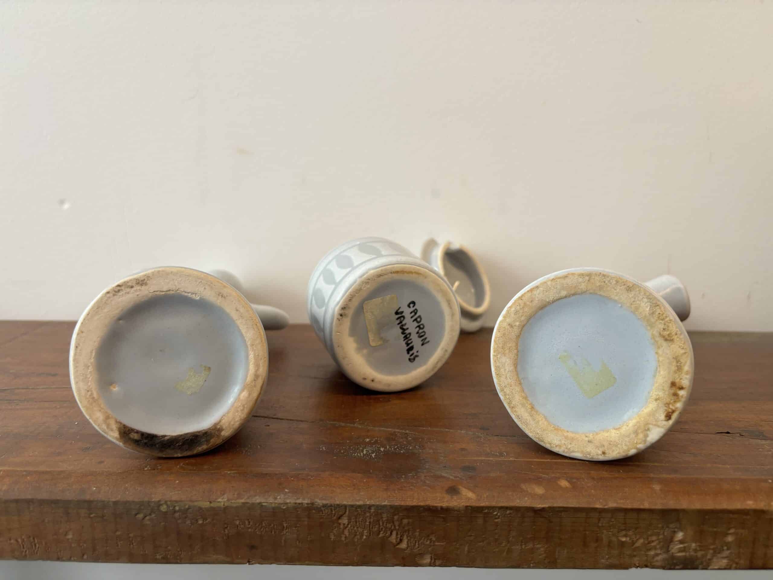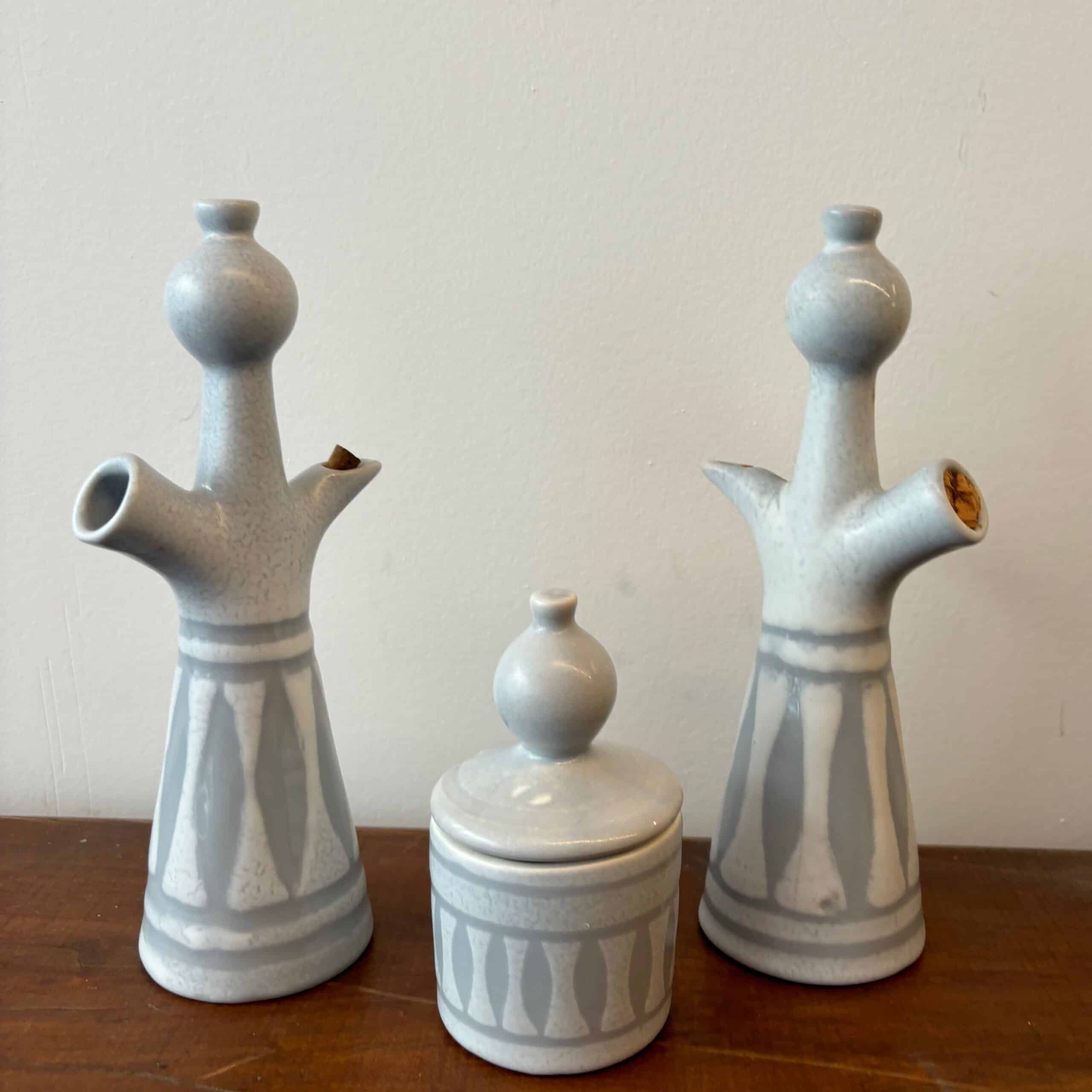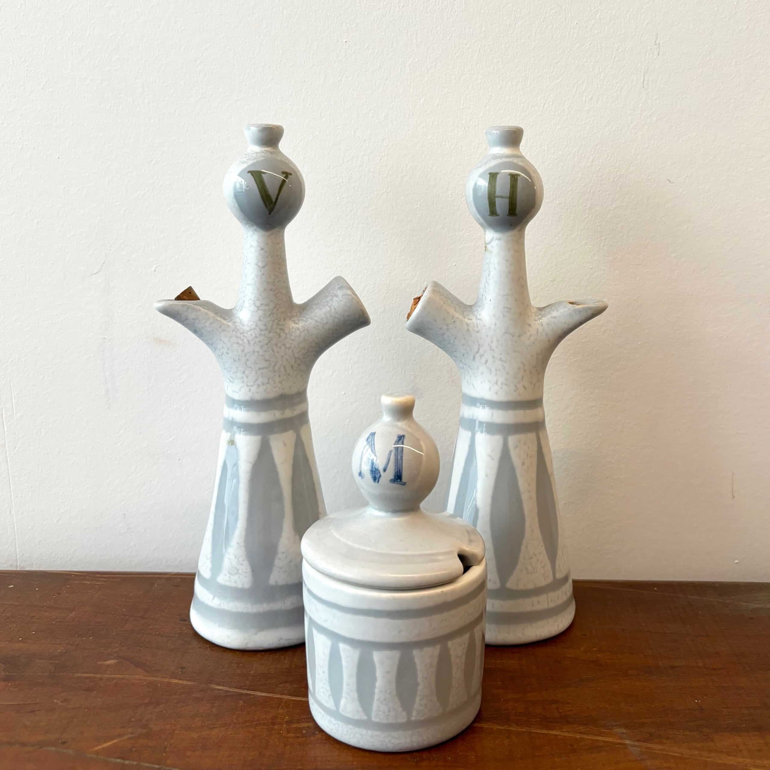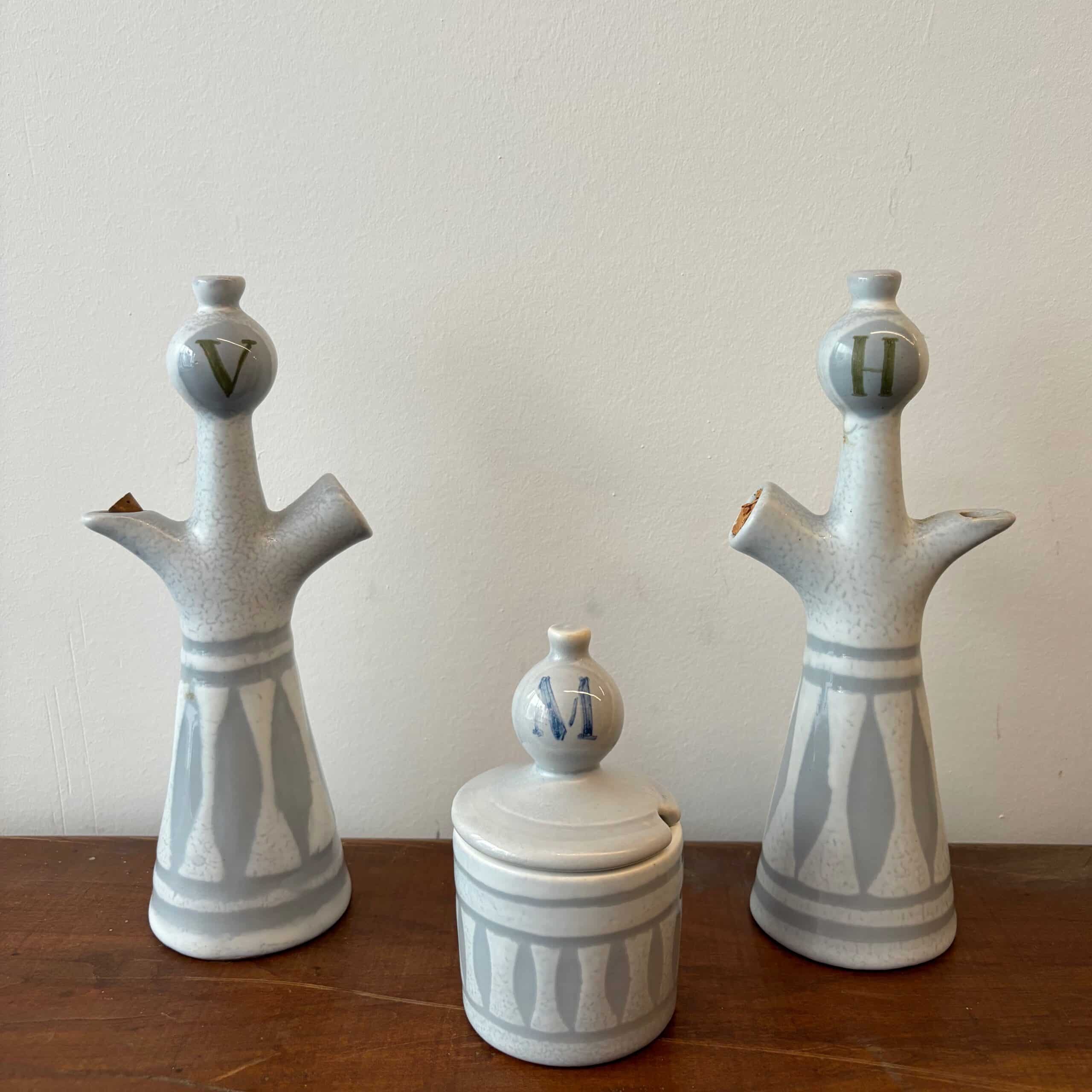 Bel ensemble composé d’une bouteille à huile, d’une bouteille à vinaigre et d’un moutardier du céramiste français Roger Capron (1922-2006)  à Vallauris. Ces pièces avec un émaillage blanc décoré de losanges gris sont recherchées pour leur silhouette anthropomorphe. Seul le moutardier est signé au revers. Trio rare, avis aux collectionneurs!