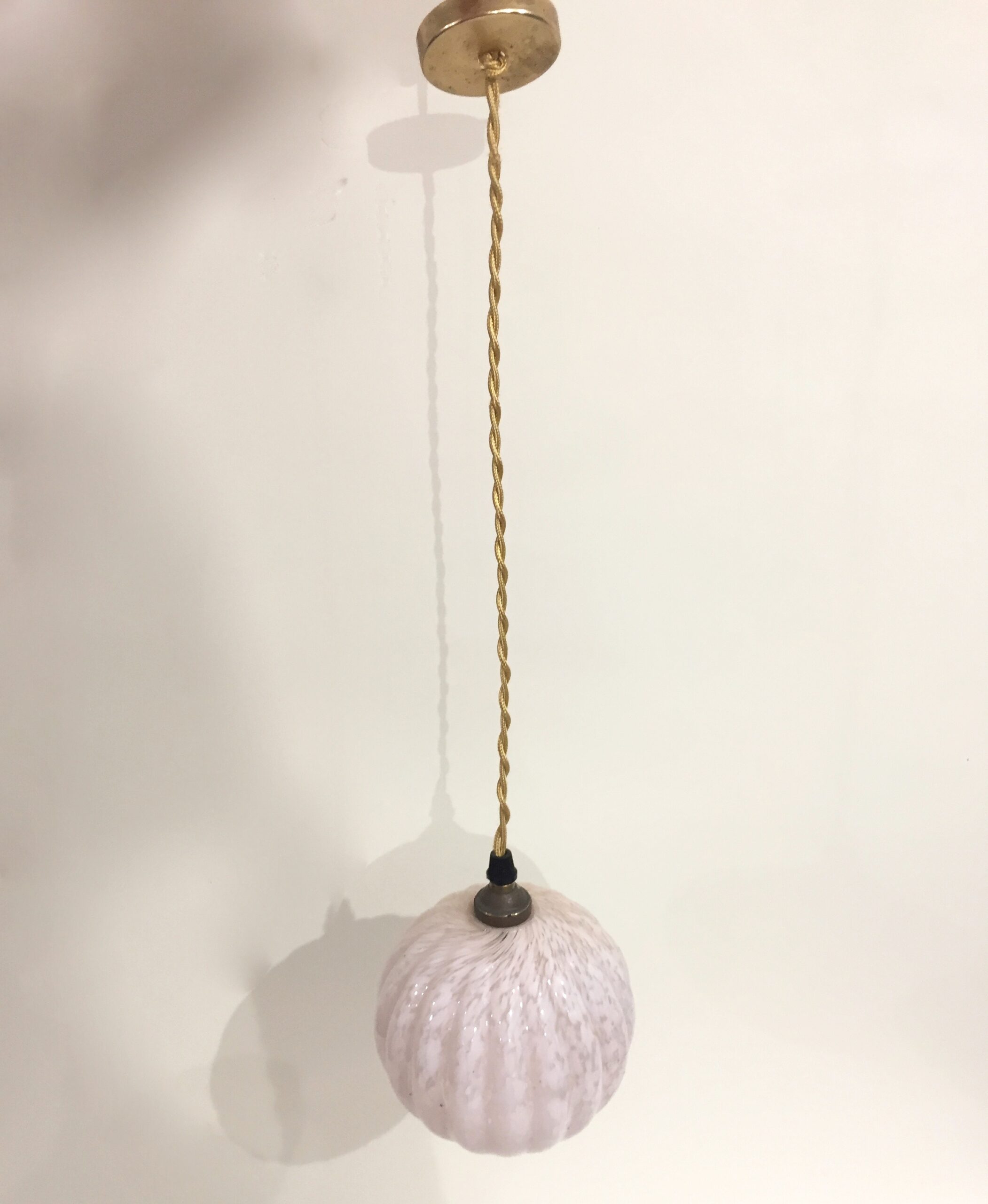 Très bon état. Globe en verre et douille d’origine, fil et cache neufs. Longueur de suspension sur-mesure à la commande.