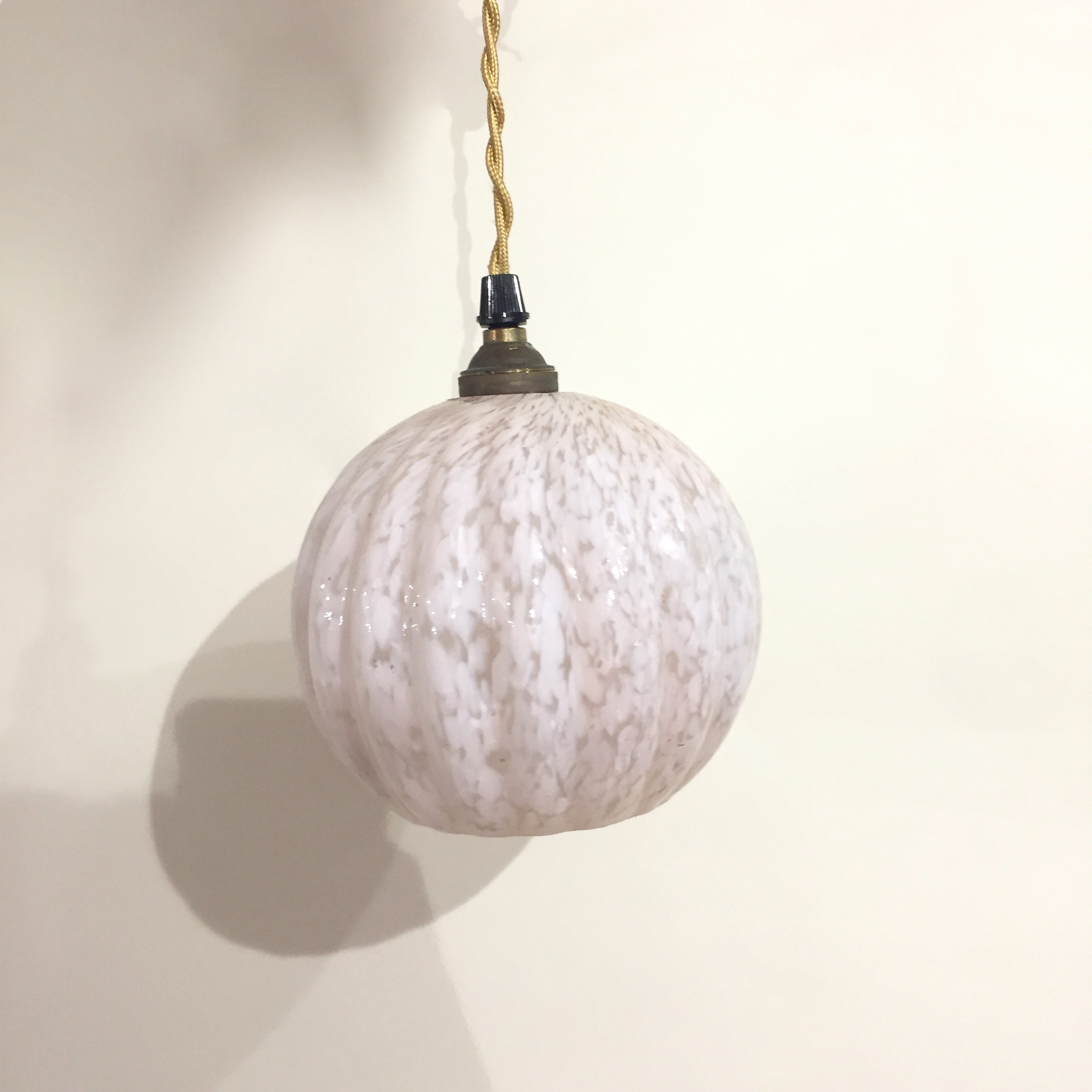 Joli globe ancien en verre de Clichy pour créer une suspension ou une baladeuse, avec du fil torsadé doré. Il ira parfaitement dans une petite pièce comme l’entrée ou la chambre; à 2, 3 ou 4, on les imagine au dessus d’un comptoir ou d’un bar comme en pêle-mêle au dessus de la table du séjour.