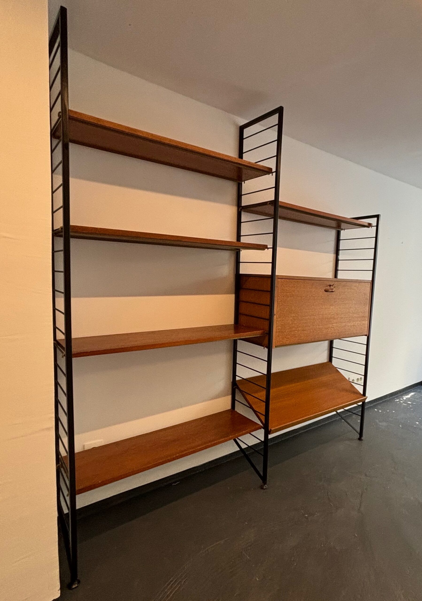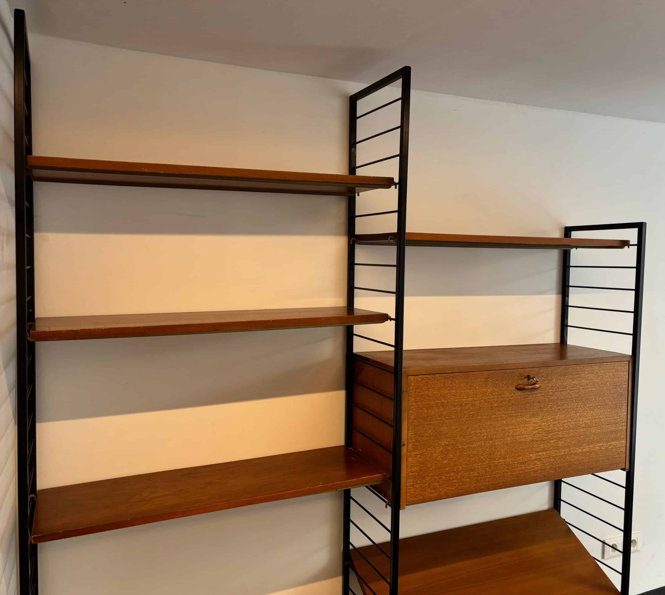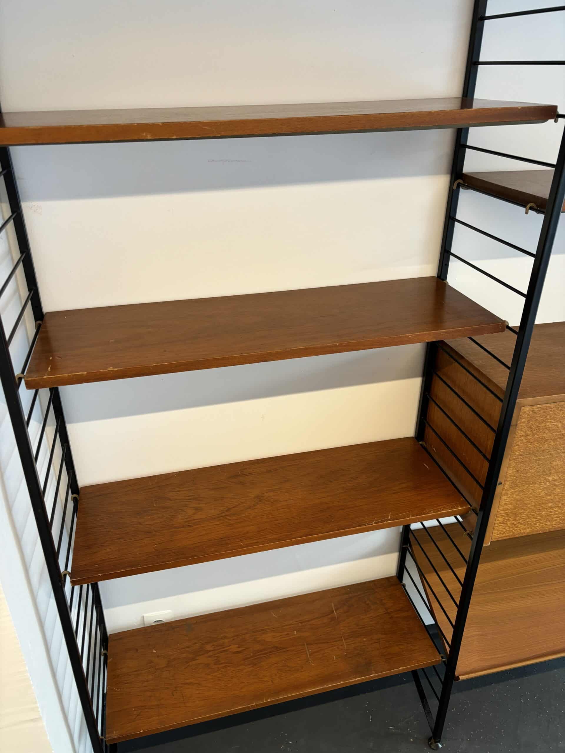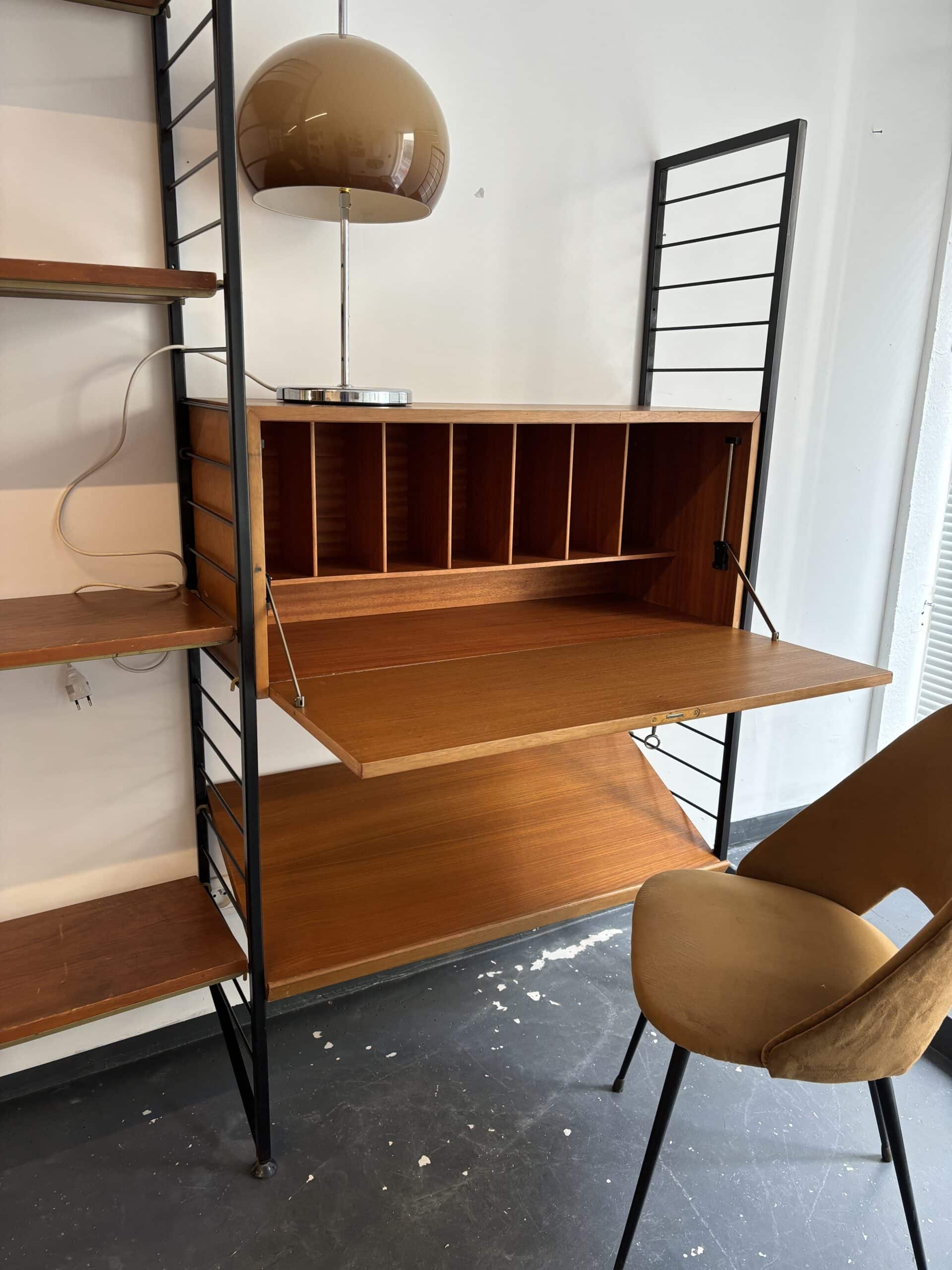 Superbe bibliothèque murale modulable des années 60 en métal noir et en teck. Composée de trois montants, de cinq planches, d’une planche inclinée et d’un caisson secrétaire, vous pouvez créer la combinaison de votre choix et régler toutes les hauteurs selon vos envies et vos besoins. Signé Ladderax, cet ensemble est très élégant et de belle qualité.