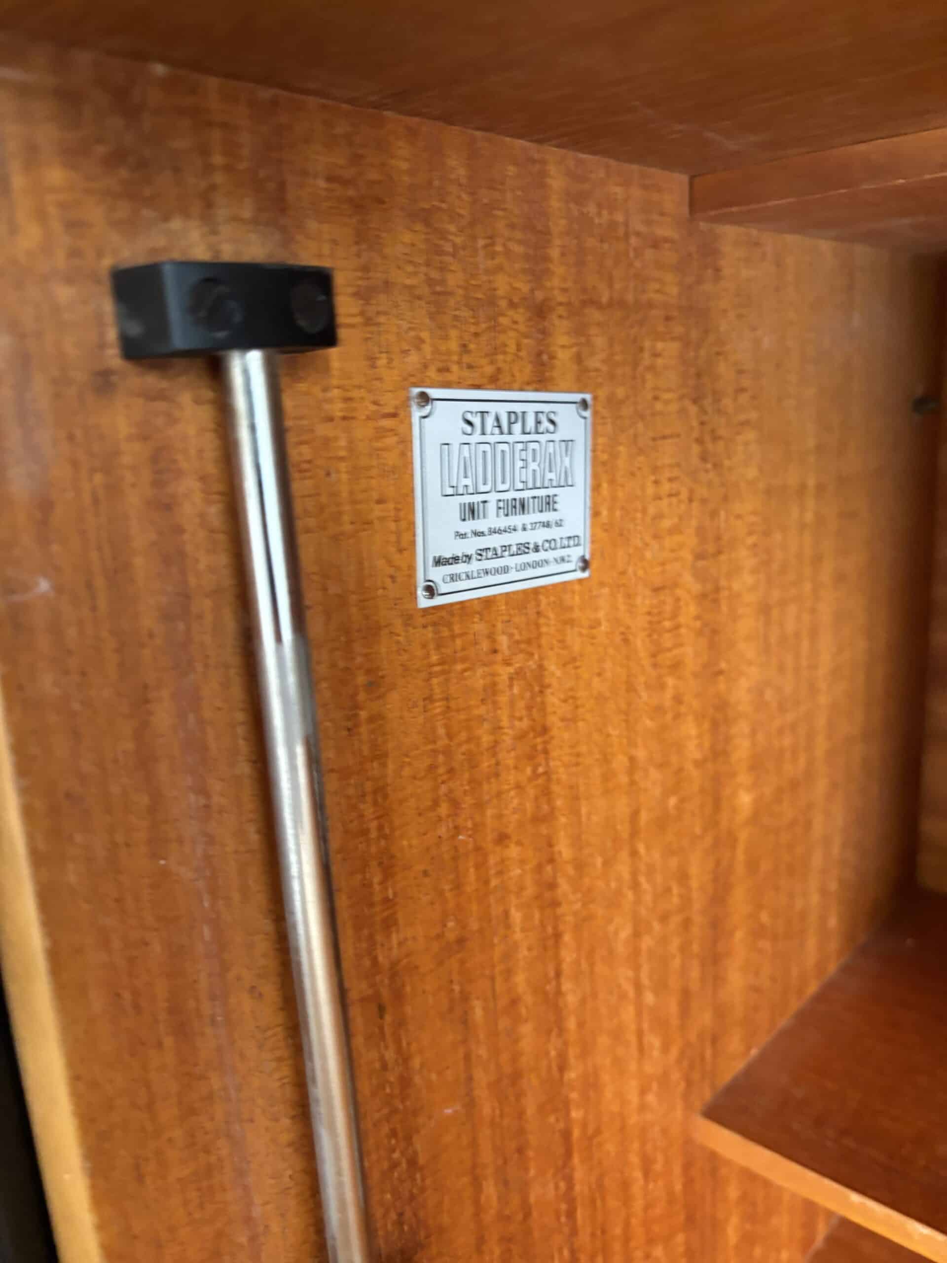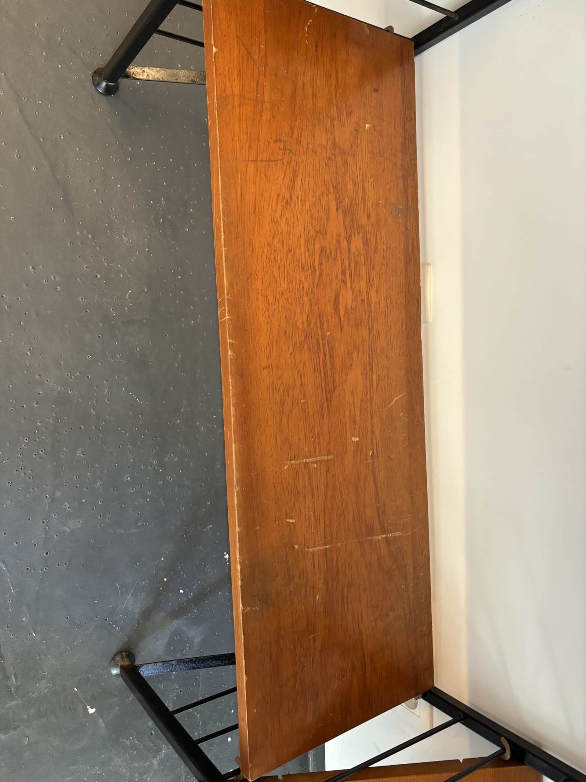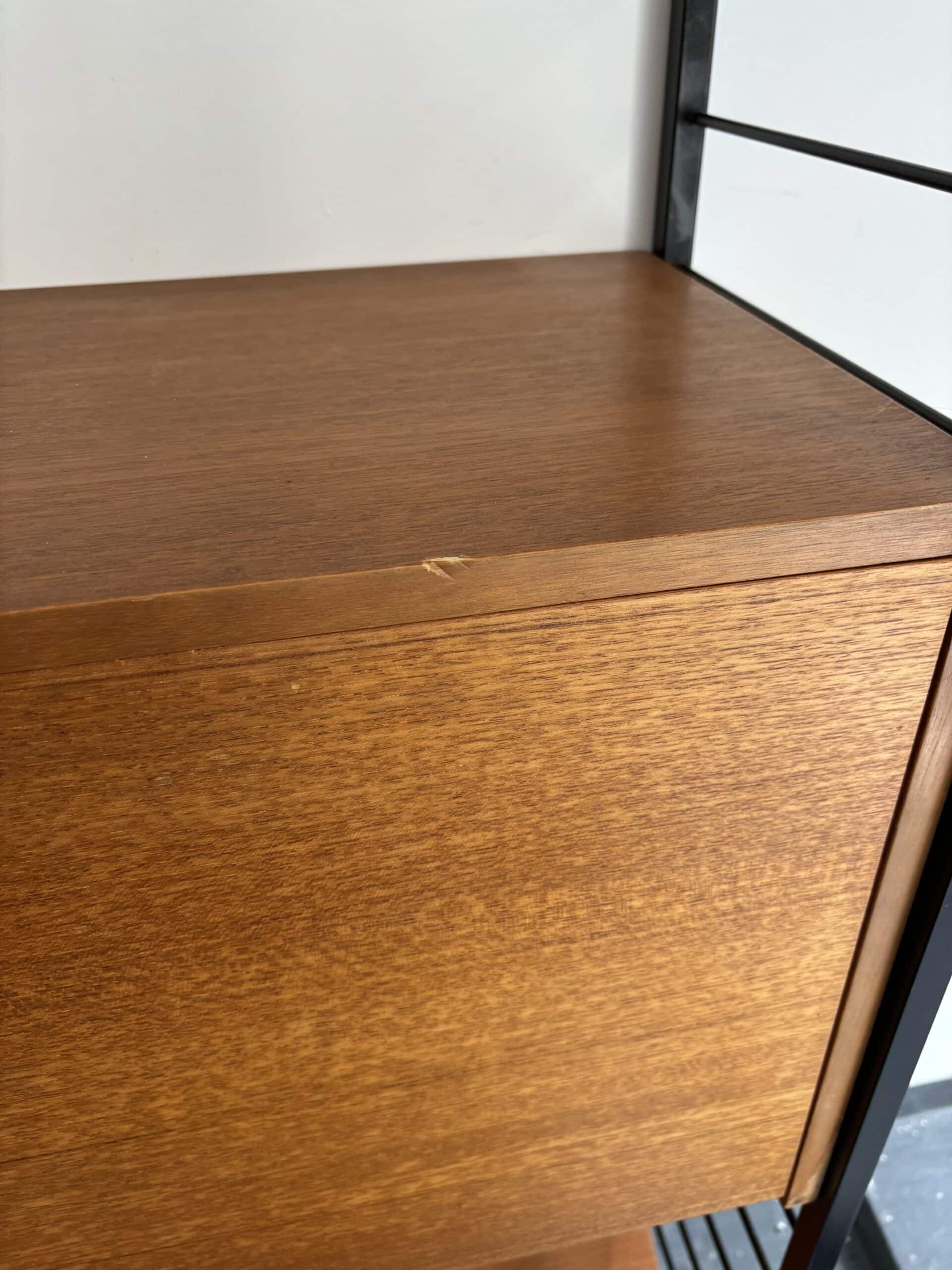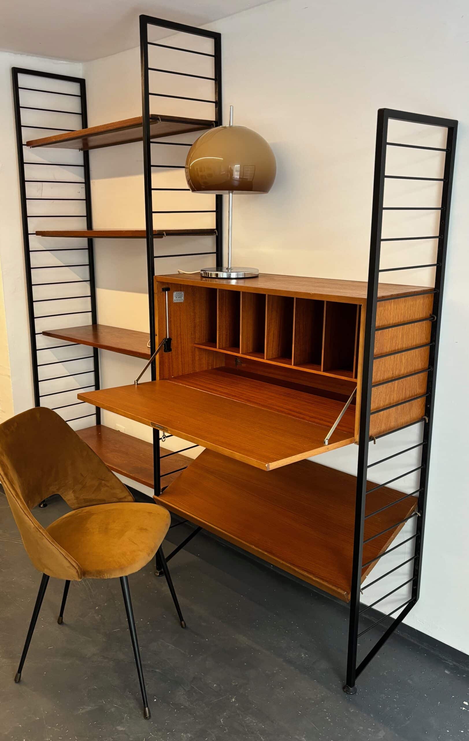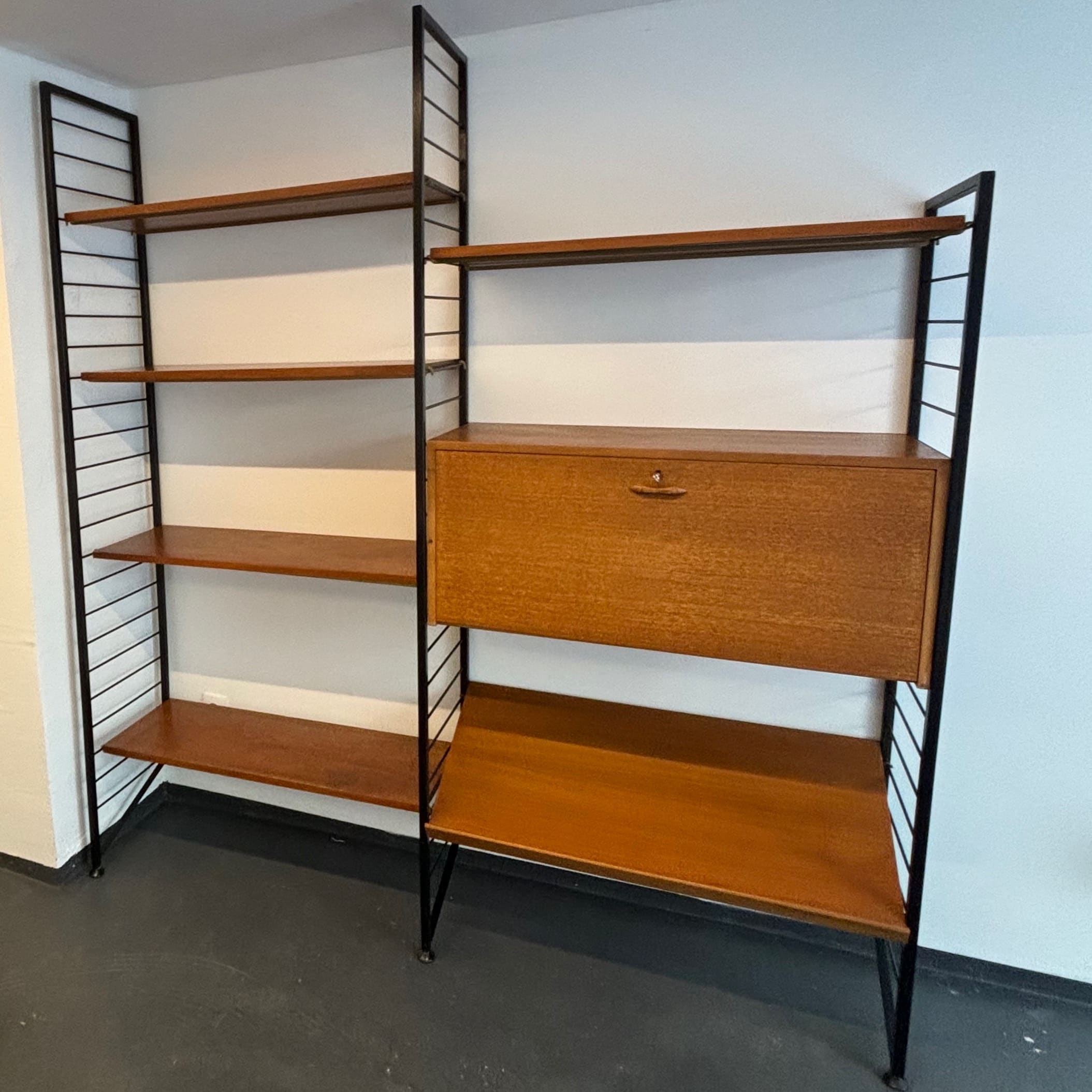 Superbe bibliothèque murale modulable des années 60 en métal noir et en teck. Composée de trois montants, de cinq planches, d’une planche inclinée et d’un caisson secrétaire, vous pouvez créer la combinaison de votre choix et régler toutes les hauteurs selon vos envies et vos besoins. Signé Ladderax, cet ensemble est très élégant et de belle qualité.