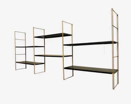 Système d’étagère murale des années 60 avec 4 montants en métal torsadé doré et 6 plaques en métal noir, de sorte que l’on peut choisir la composition en fonction de ses besoins : une grande étagère de près de 150 cm de long ou bien deux étagères décalées, à vous d’imaginer le prochain support de vos poches et bibelots préférés.