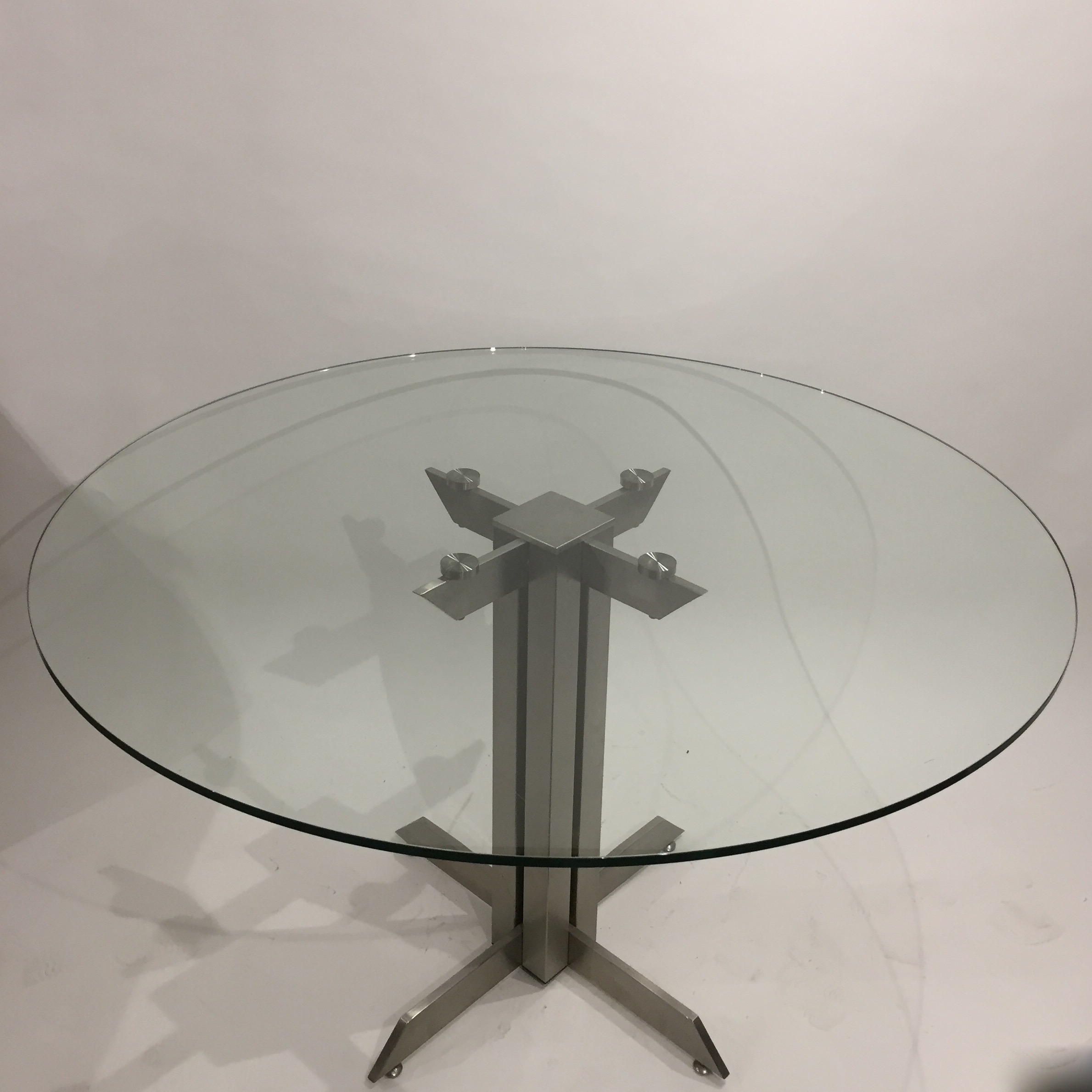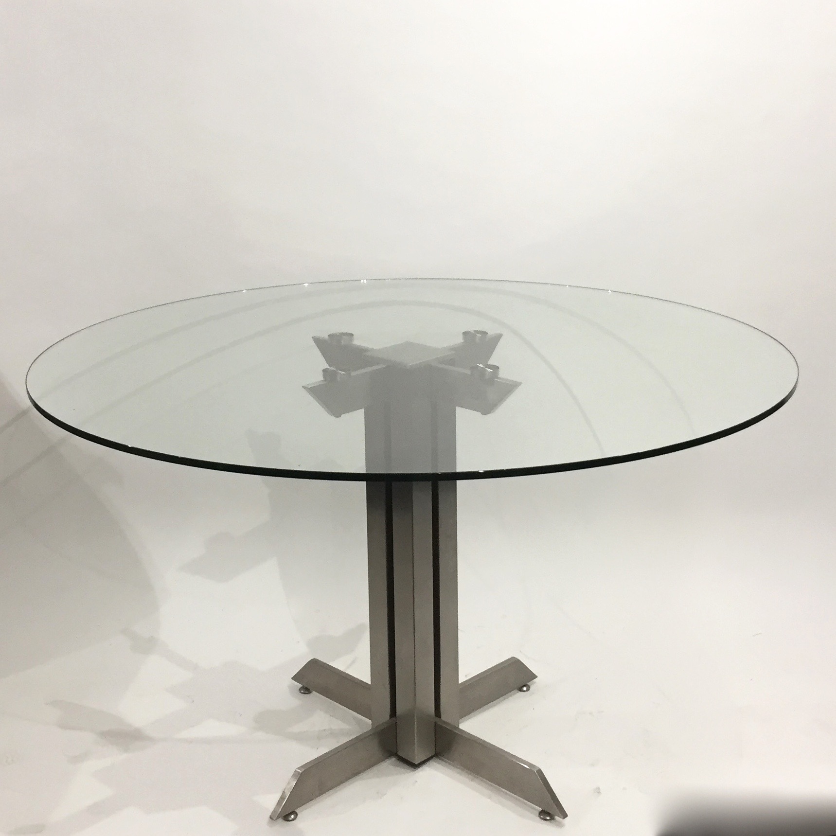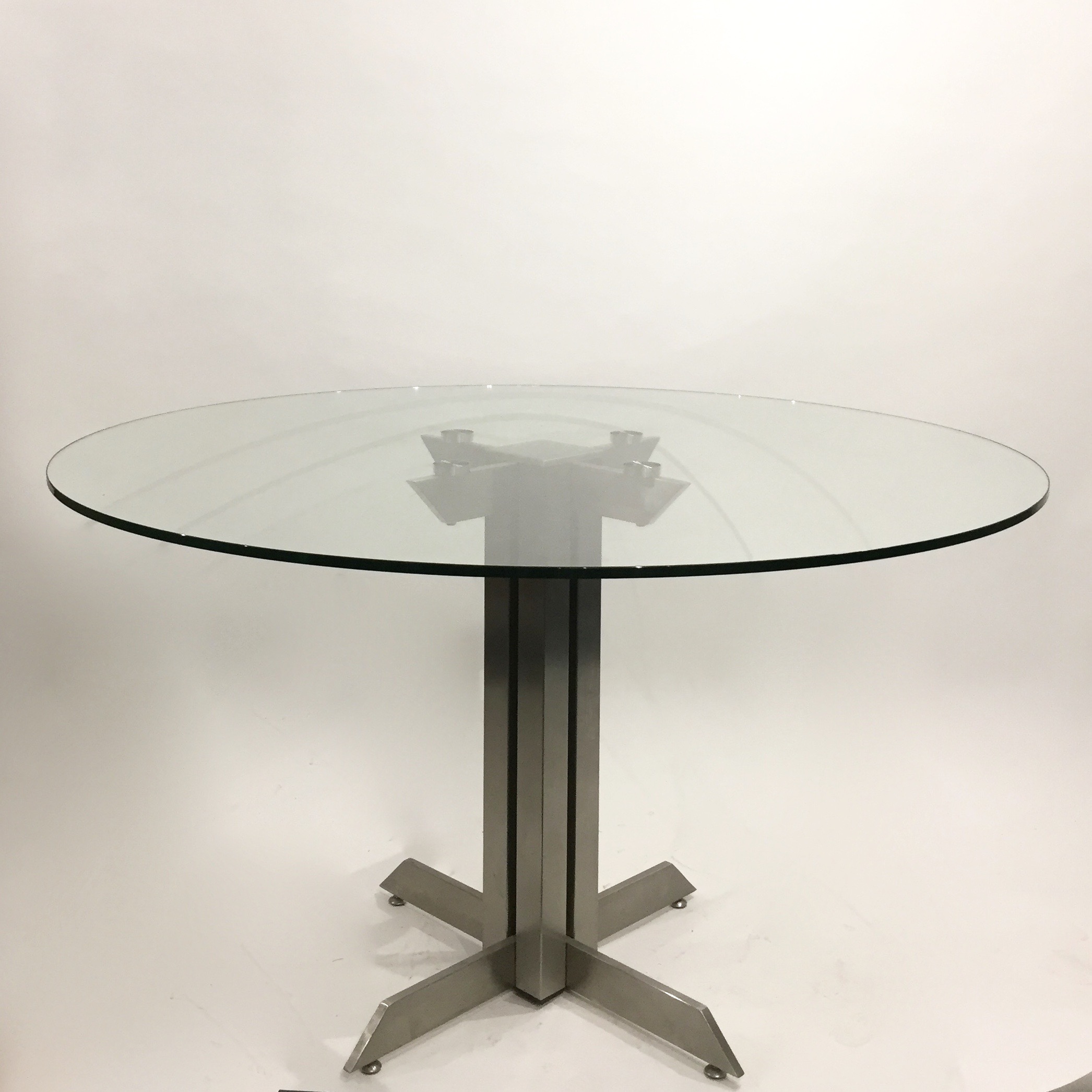 Fan des seventies. Vous allez adorer cette belle table à manger ronde avec un plateau en verre transparent sur un pied central en métal chromé des années 70. C’est une jolie pièce pour la cuisine ou la salle à manger, que l’on peut marier facilement avec tout style de chaises.