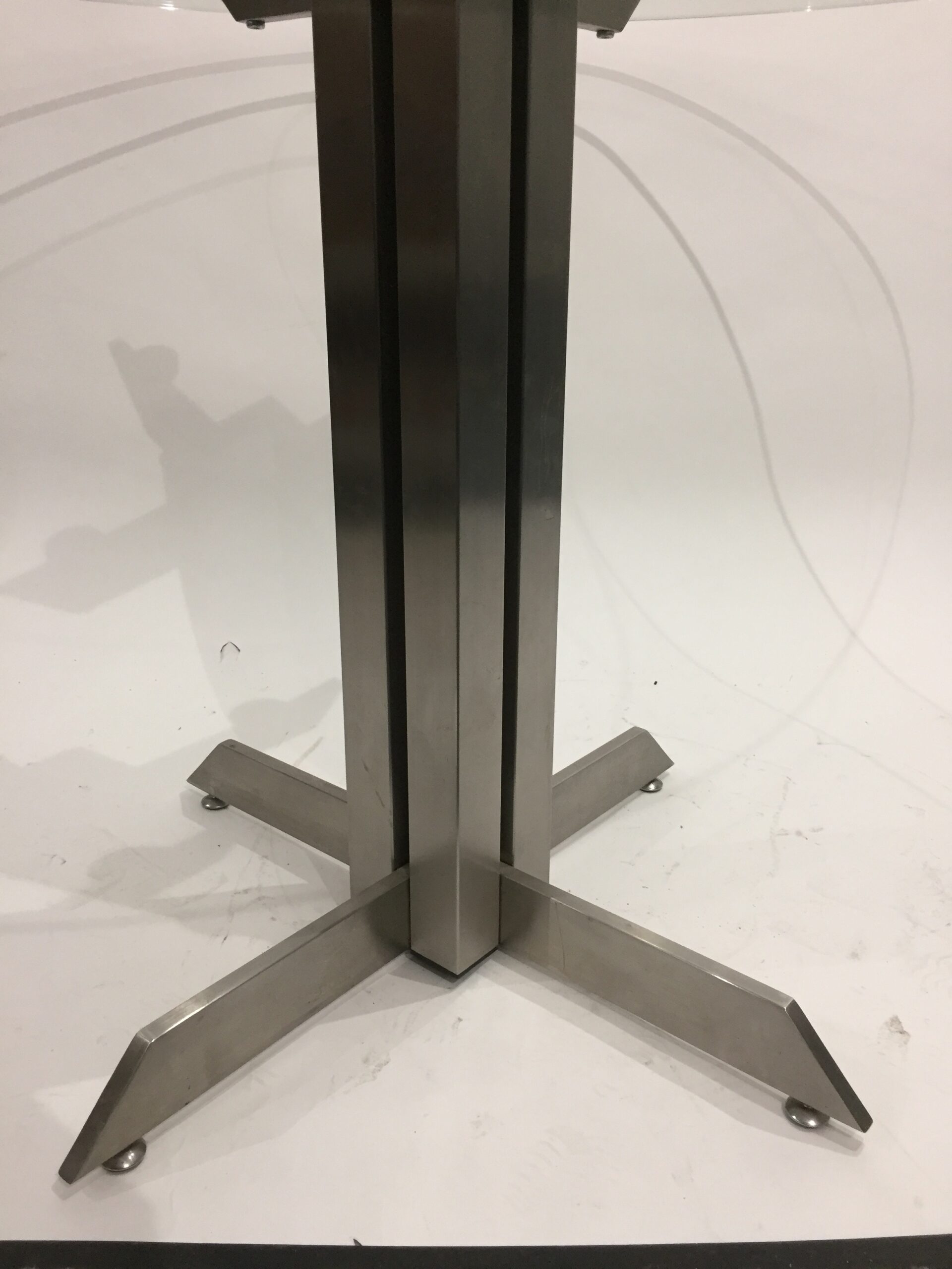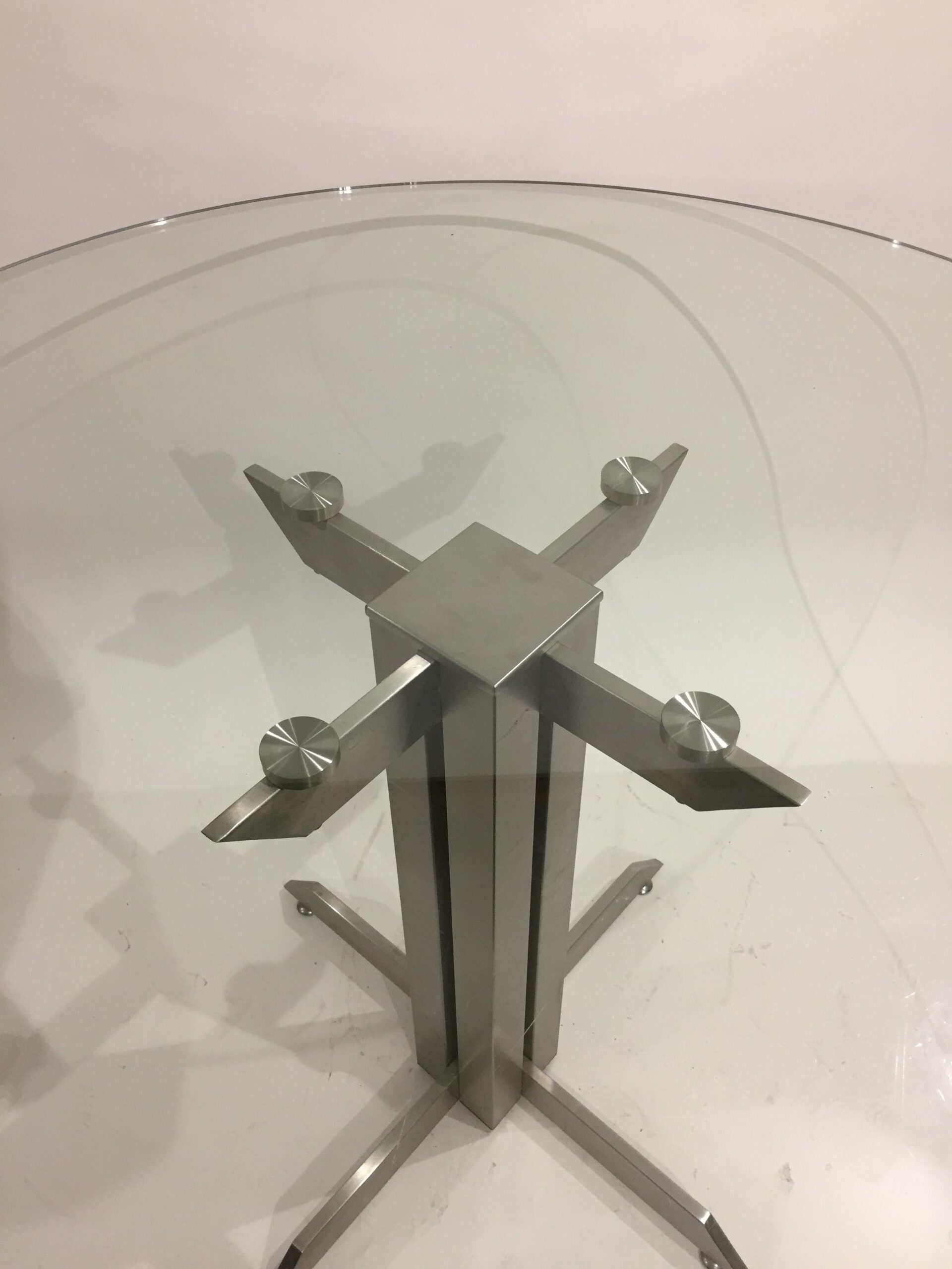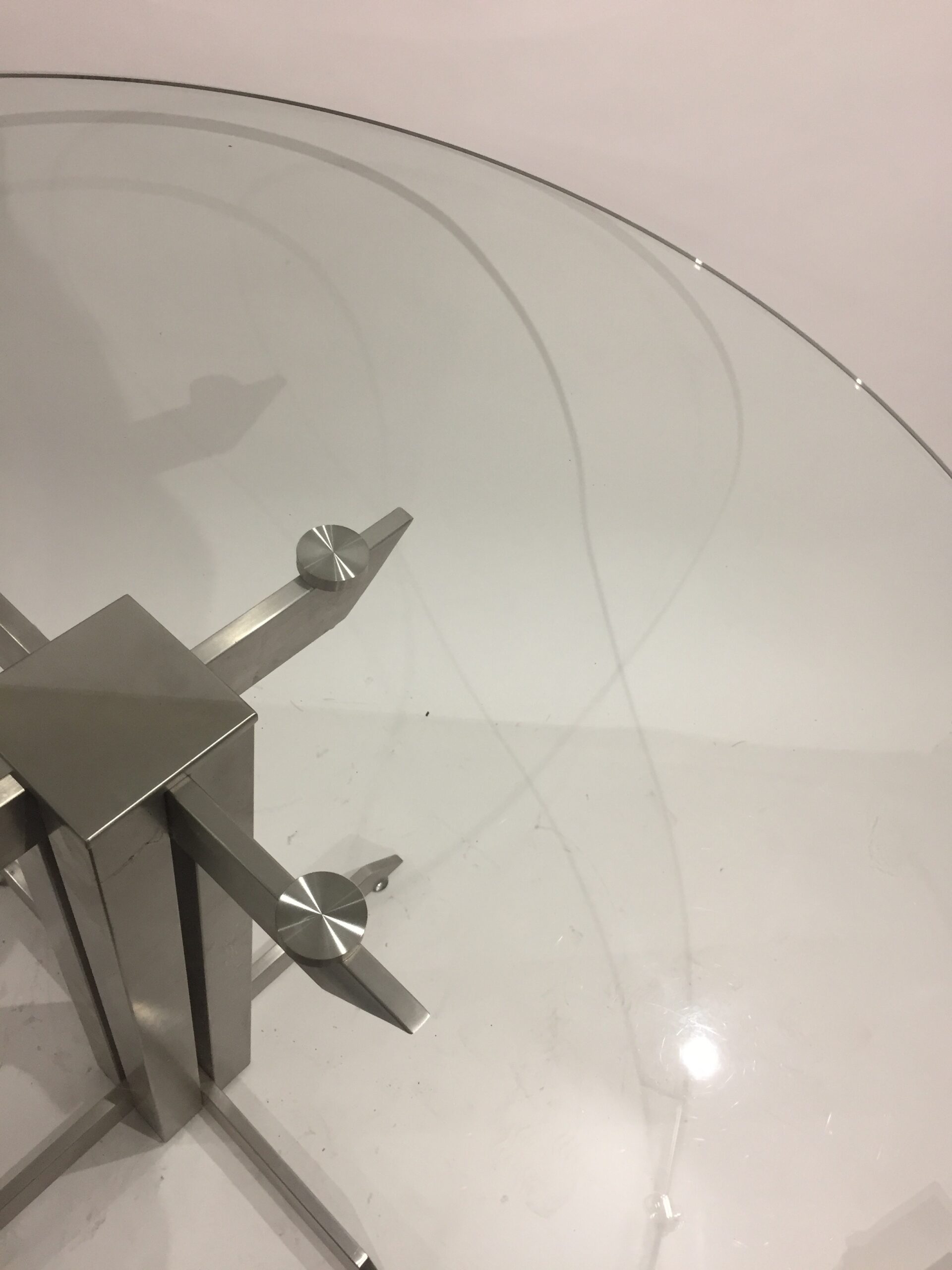 Fan des seventies. Vous allez adorer cette belle table à manger ronde avec un plateau en verre transparent sur un pied central en métal chromé des années 70. C’est une jolie pièce pour la cuisine ou la salle à manger, que l’on peut marier facilement avec tout style de chaises.