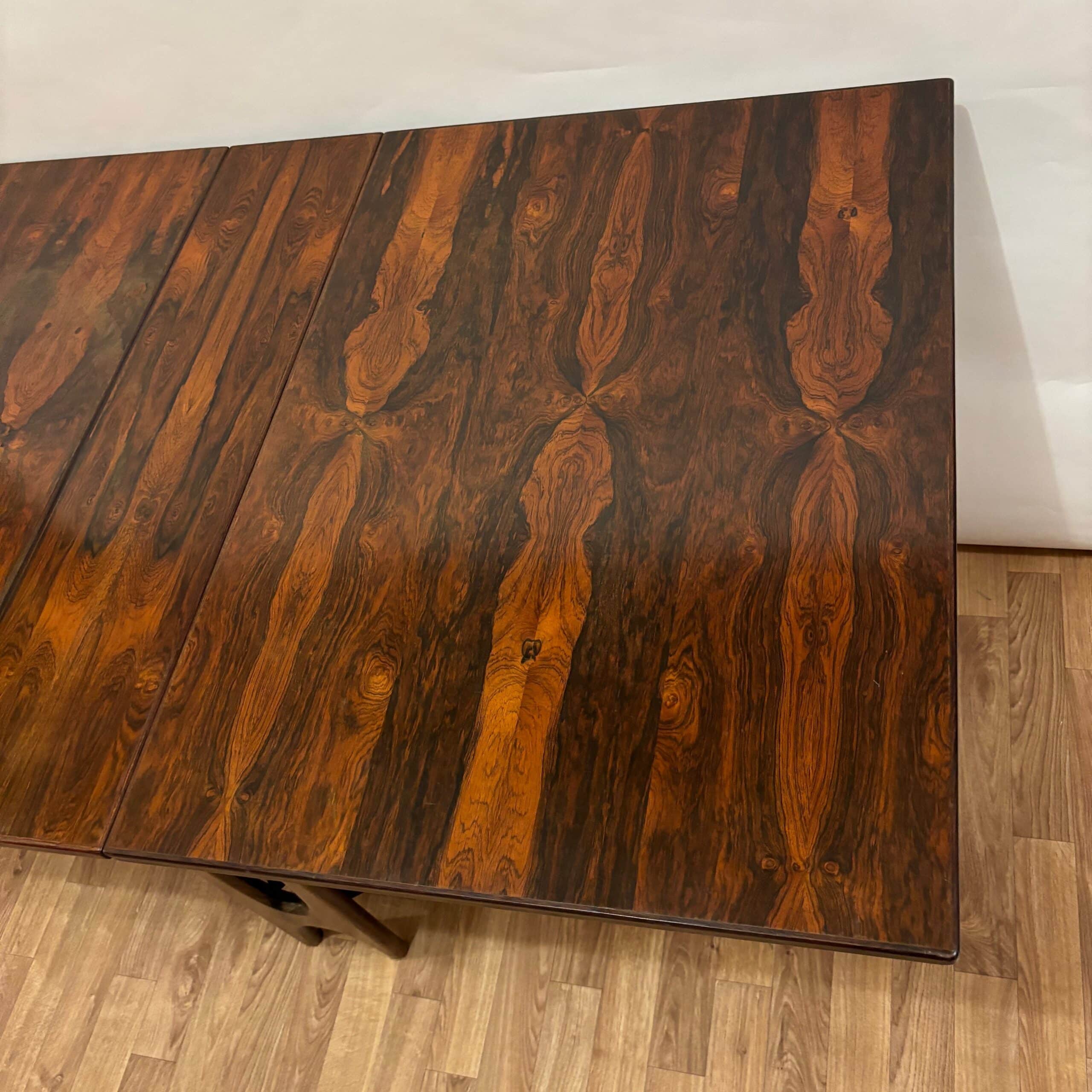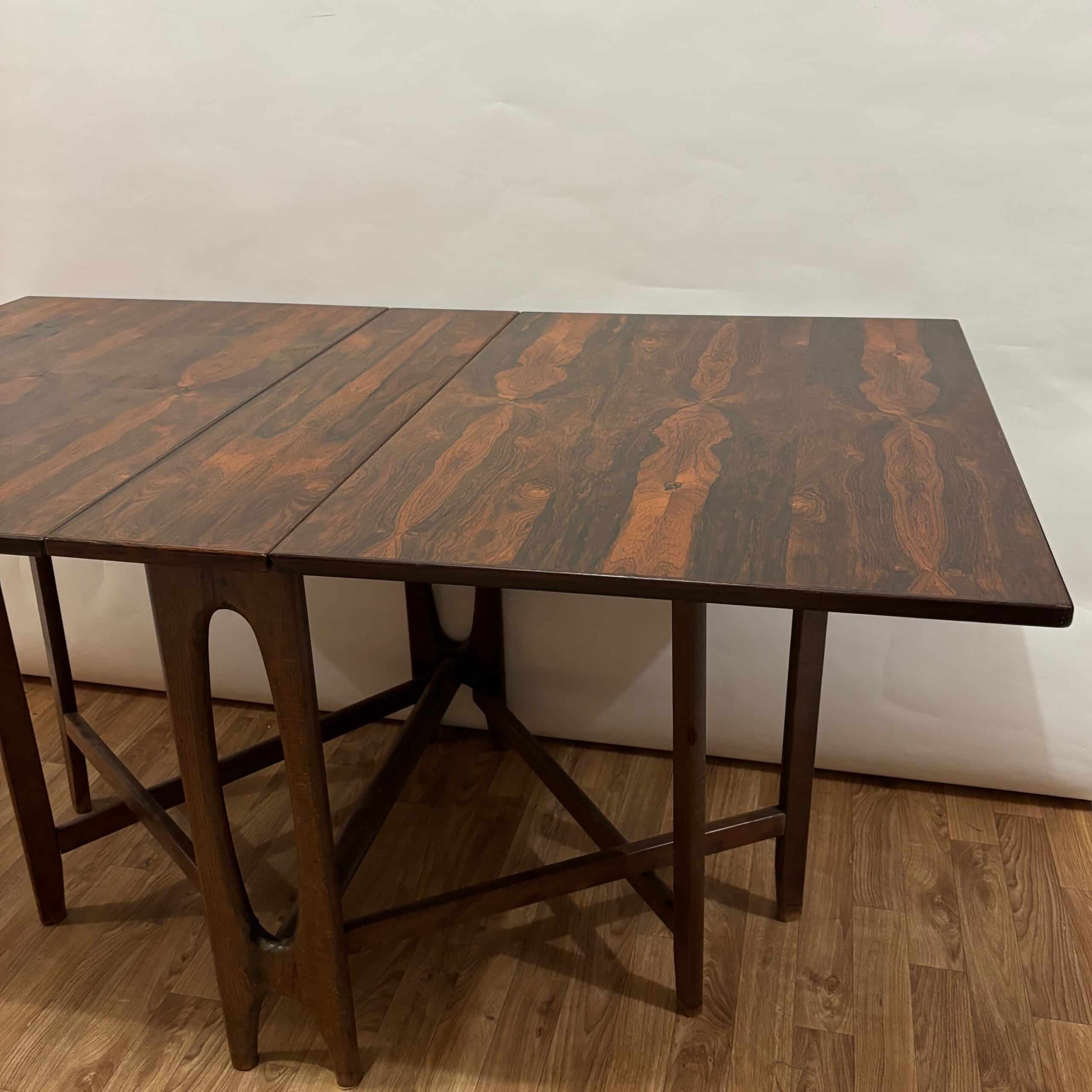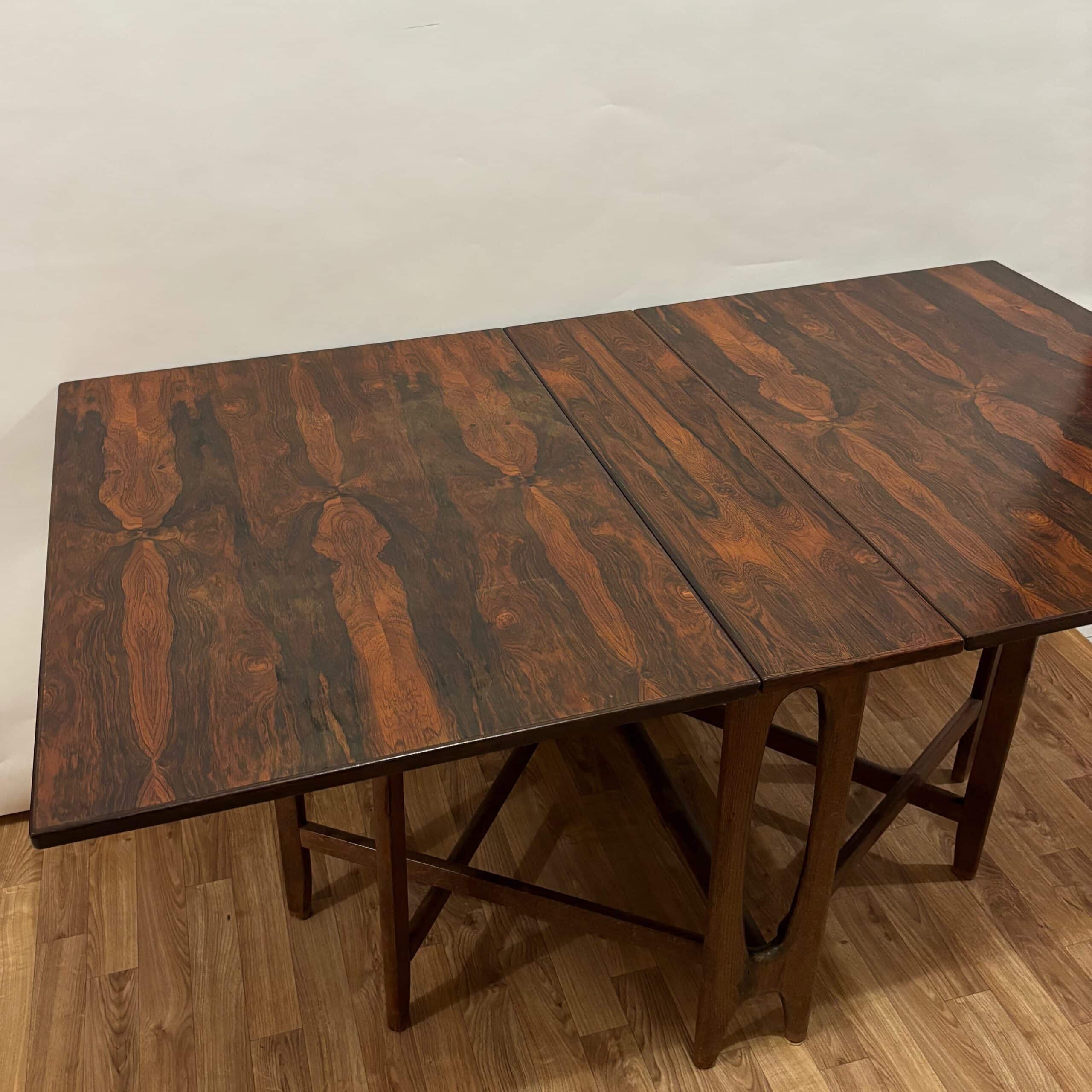 Superbe table à manger de style scandinave des années 60 palissandre de Rio. Très belle pièce pratique car le plateau se plie des deux côtés pour se transformer en console de 30 cm de profondeur.
