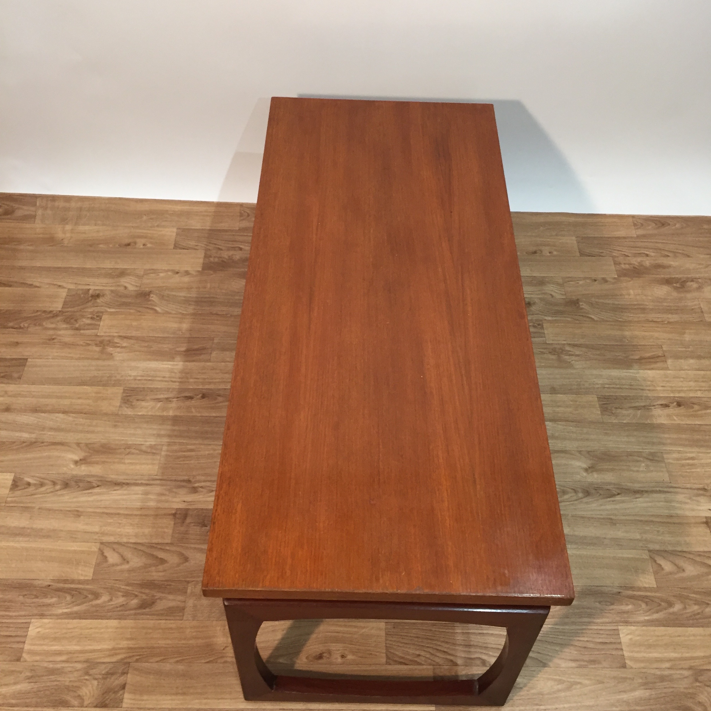 Très belle table basse de l’éditeur GPlan, des années 60, en teck. Ce modèle appelé Quadrille offre une belle surface et des lignes épurées tout en longueur, idéale pour trôner au milieu du salon. On peut également l’utiliser en bout de lit dans la chambre.