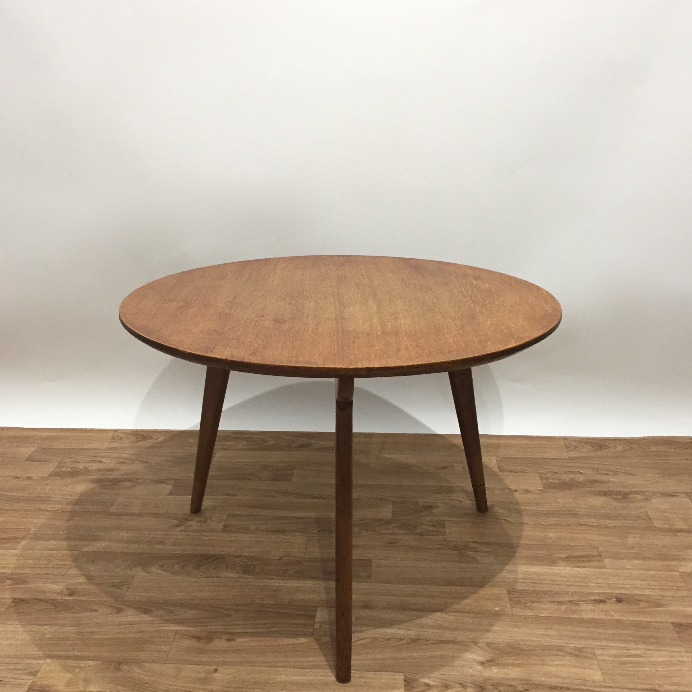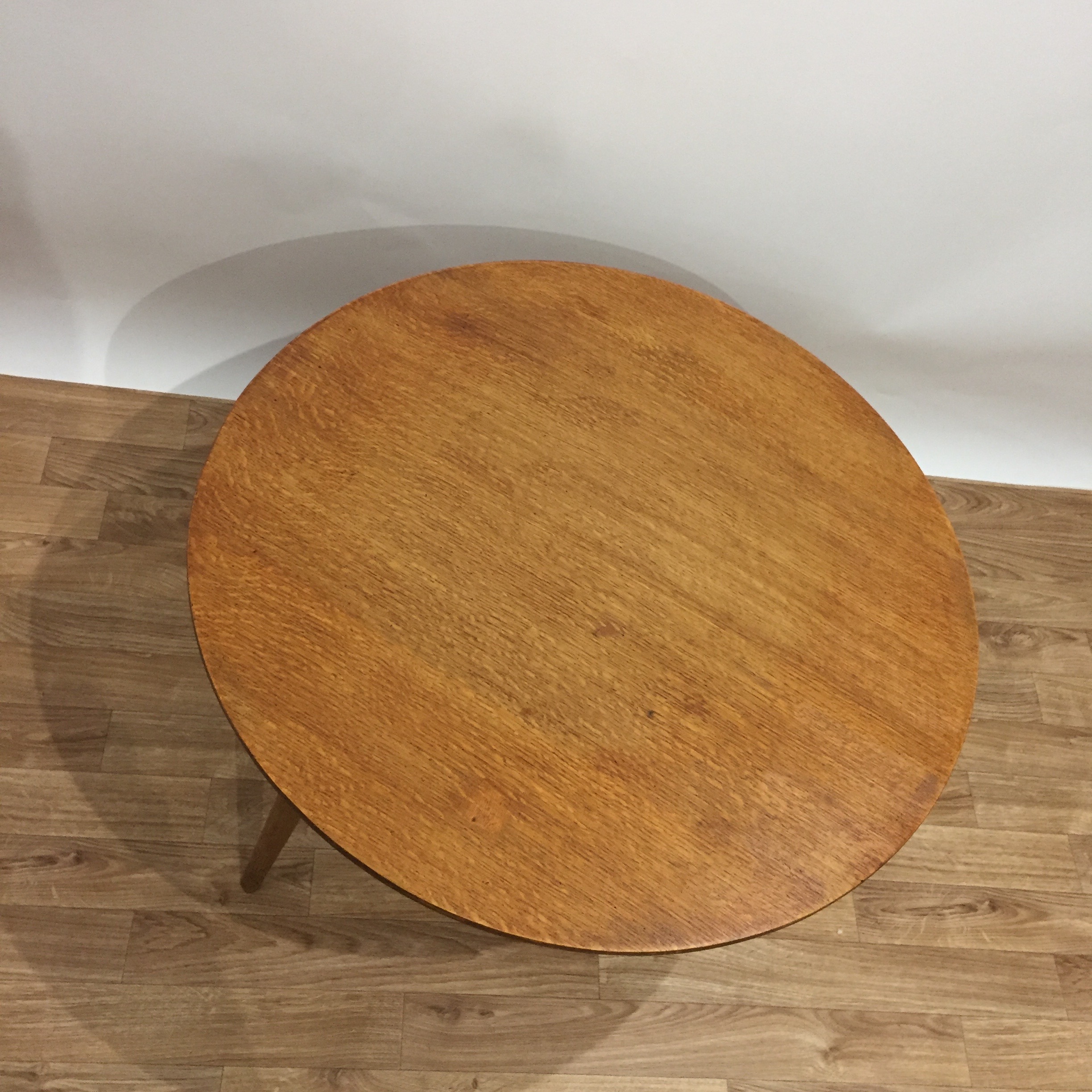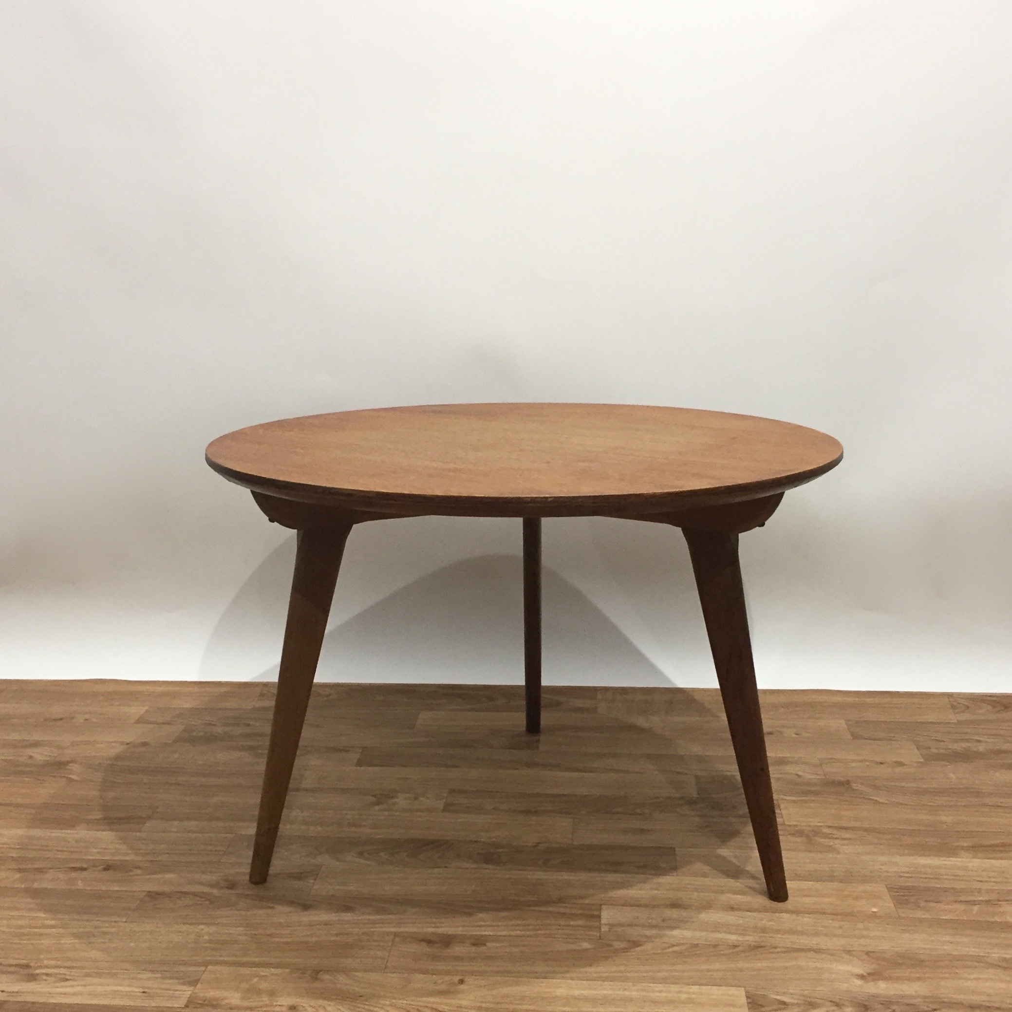 Très jolie petite table basse des années 50, ronde, en bois blond, avec des pieds compas. Toute simple et très élégante, elle est parfaite près d’un fauteuil dans le salon.