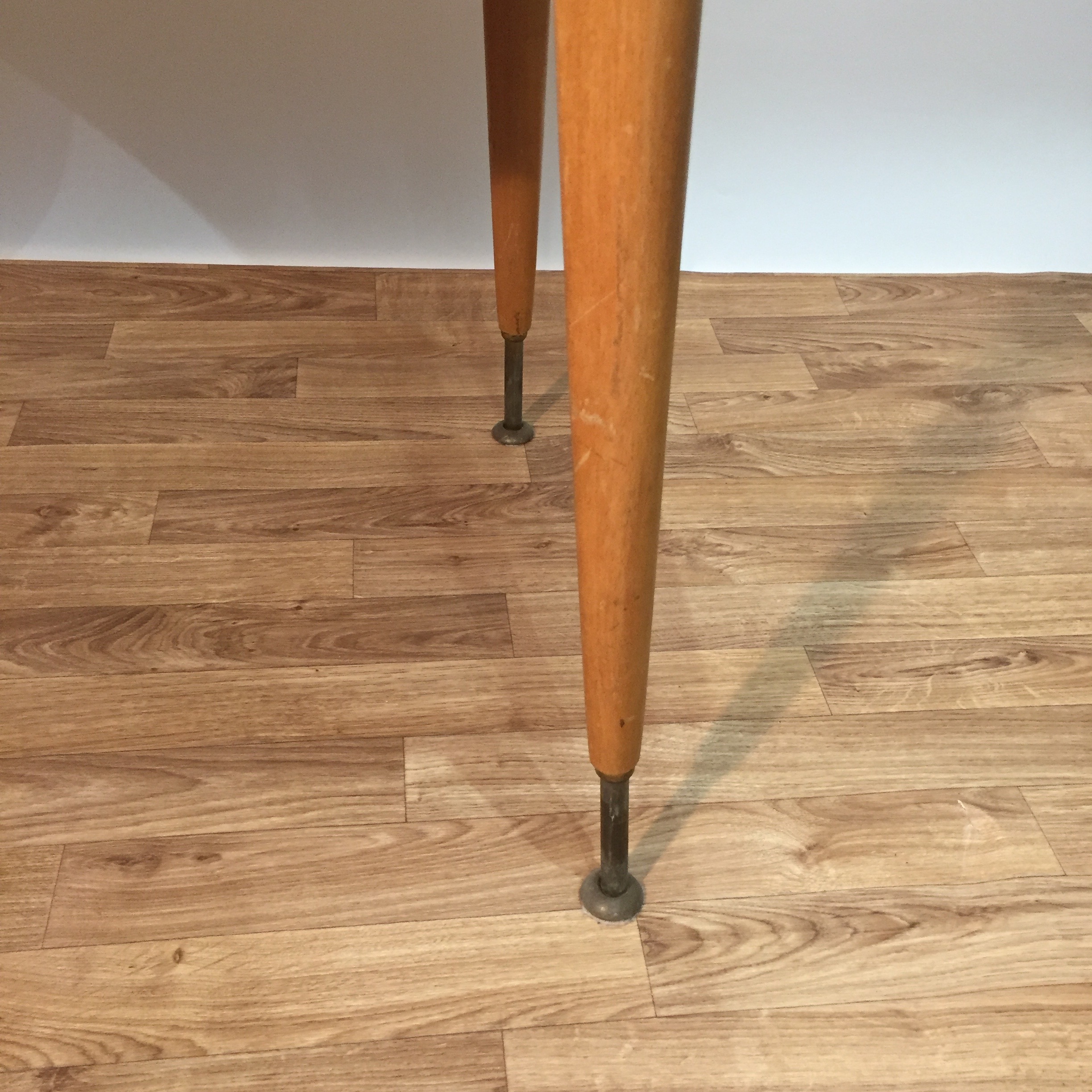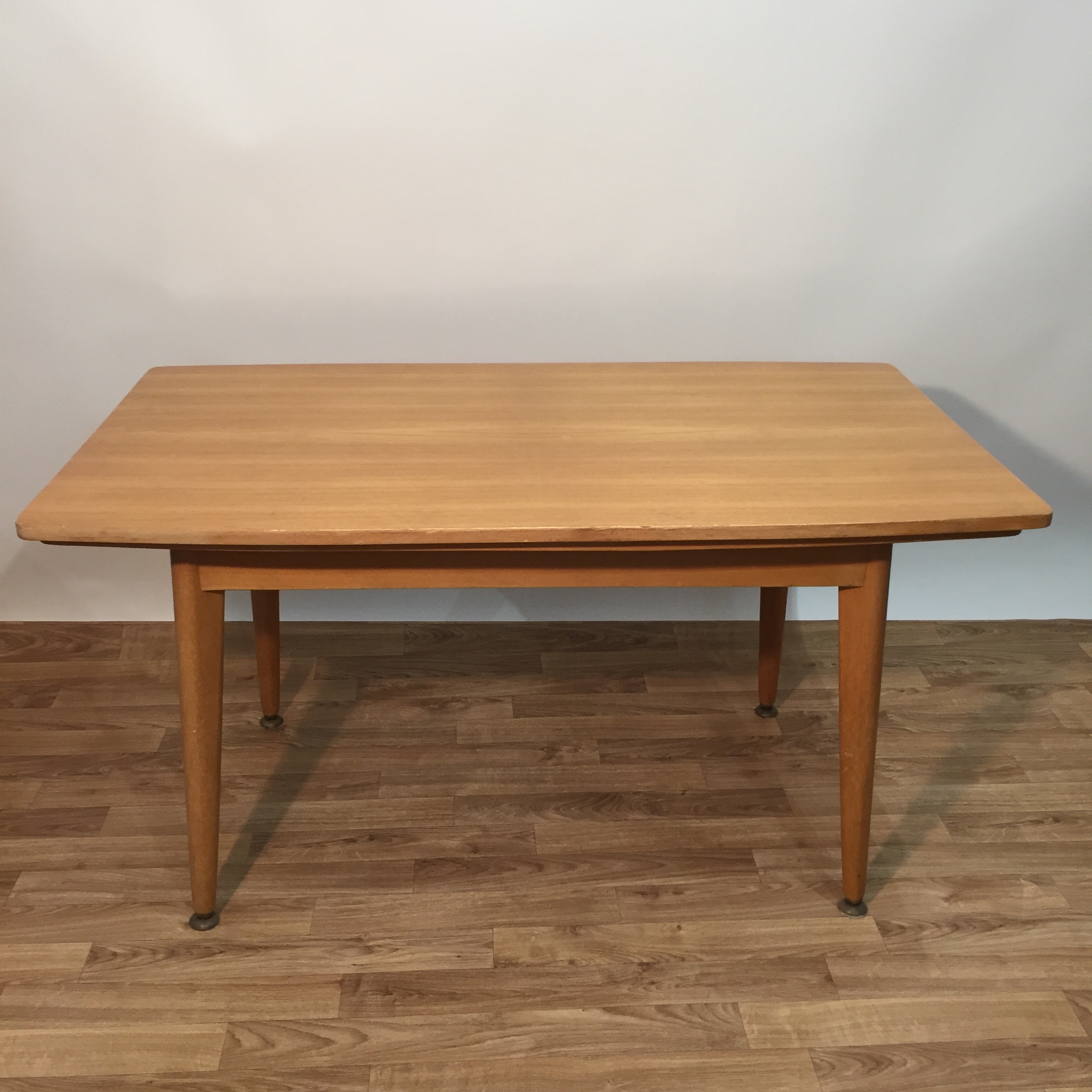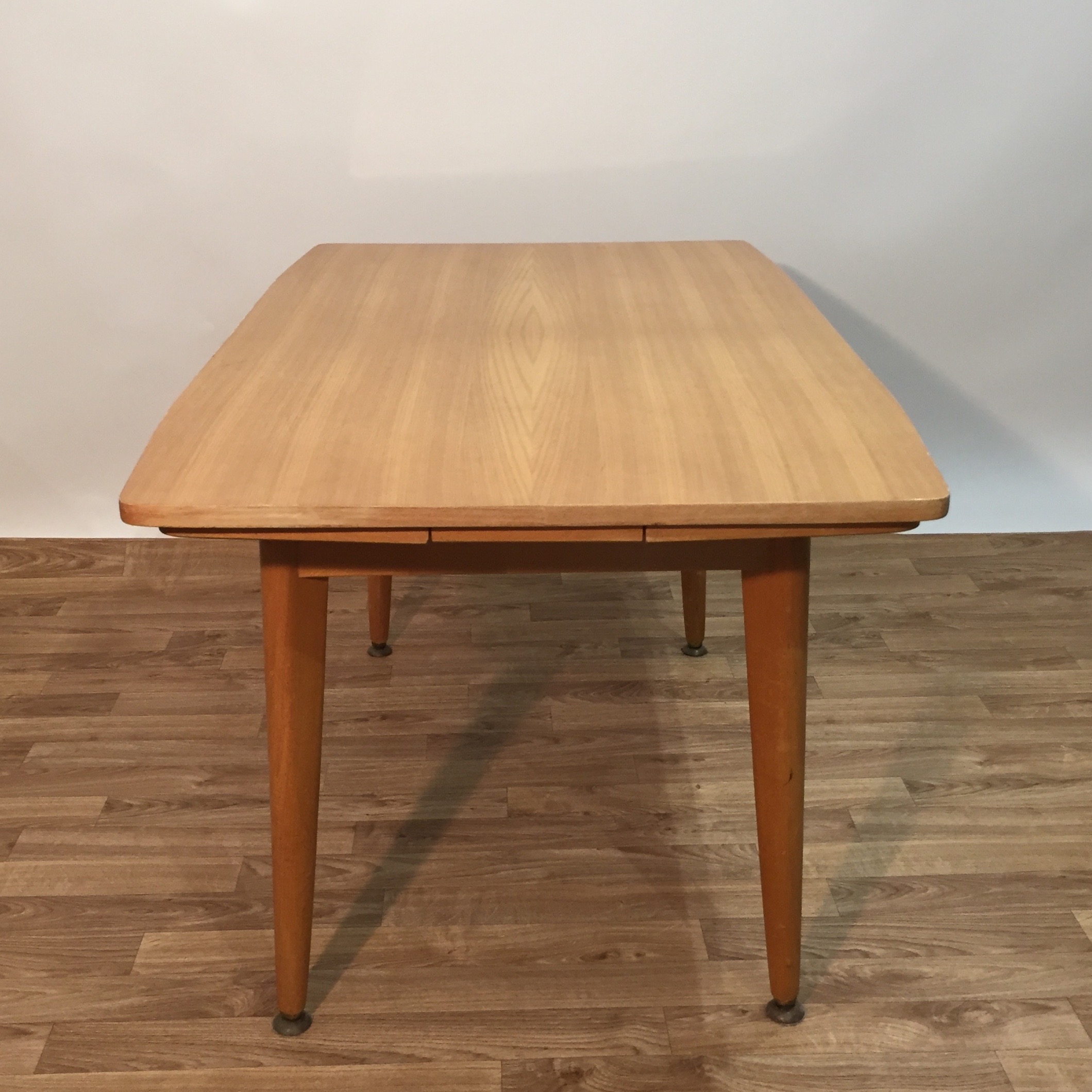Très jolie table des années 60 en bois blond avec un système très ingénieux sous le plateau qui permet d’augmenter ou de diminuer la longueur des pieds en laiton. On a donc une table basse et une table à manger, avec en plus des rallonges de part et d’autre du plateau. Il faut tourner une manivelle, le mécanisme fonctionne bien.