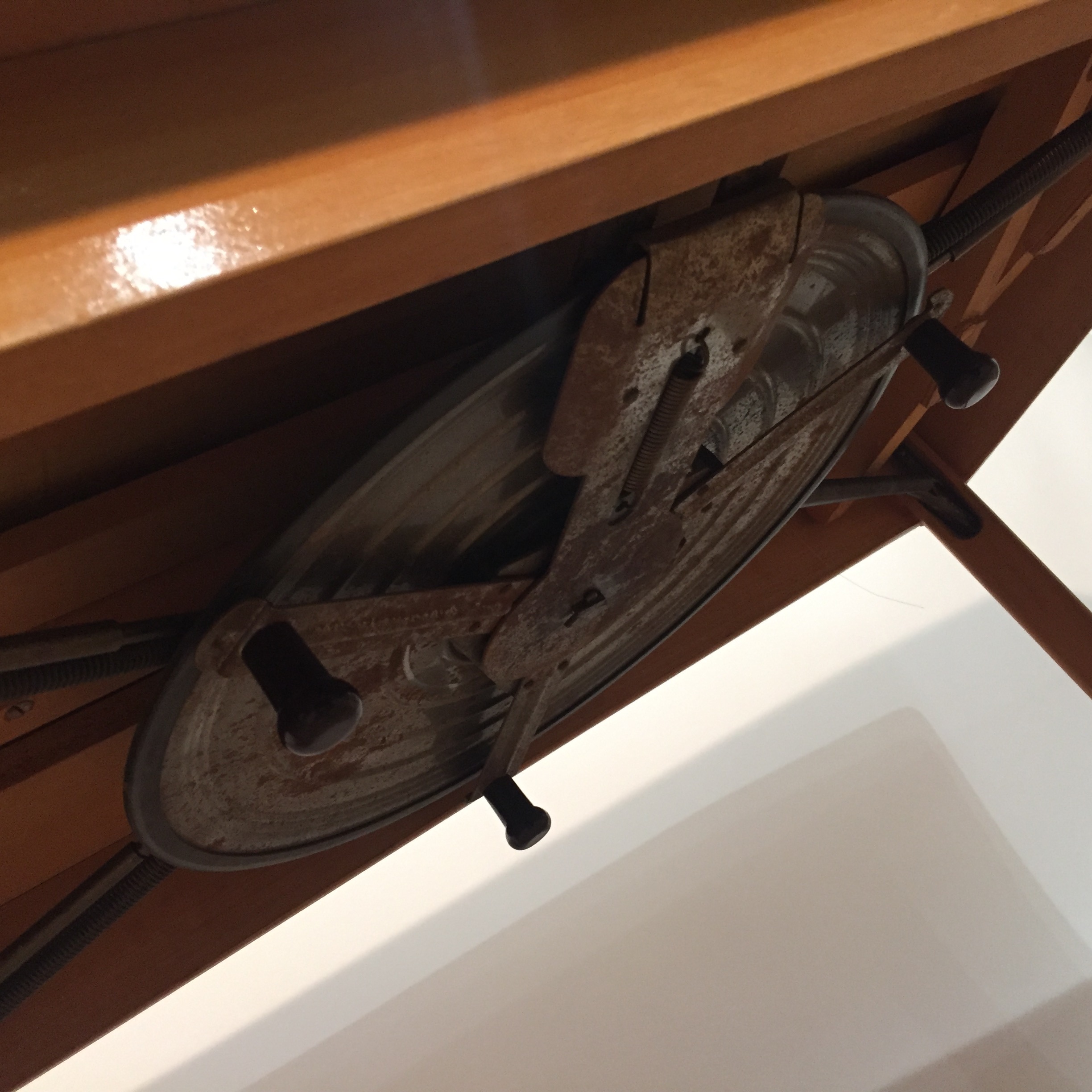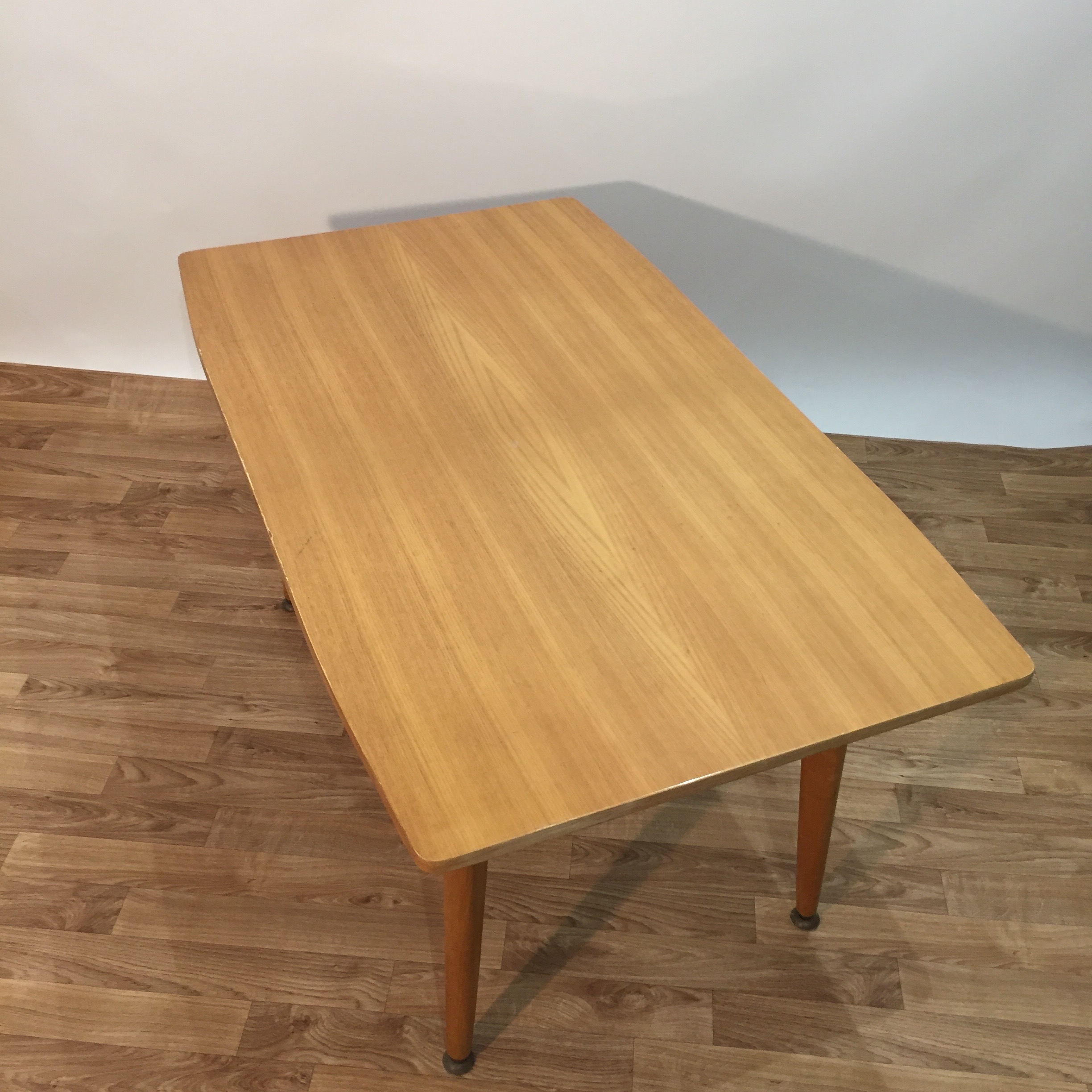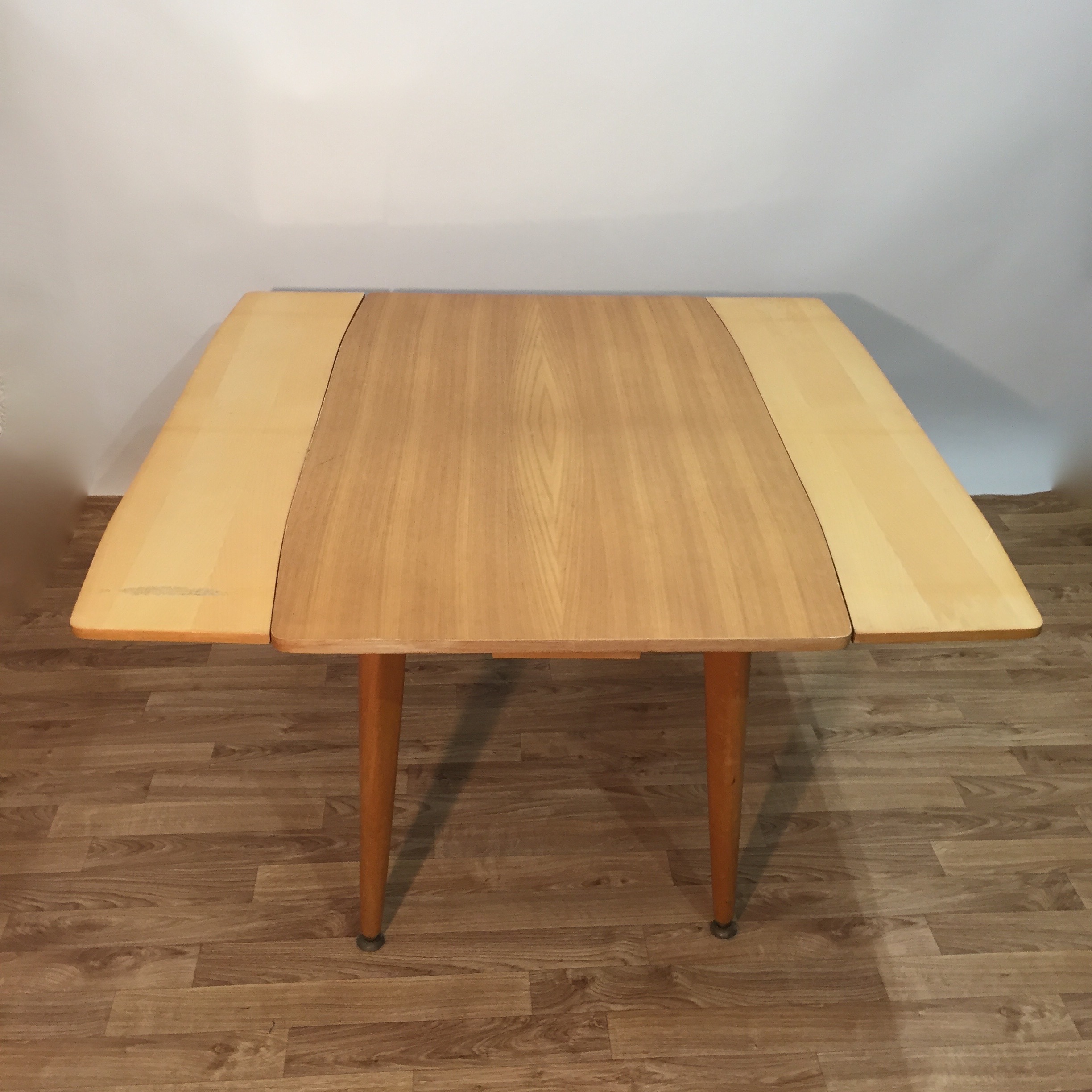 Très jolie table des années 60 en bois blond avec un système très ingénieux sous le plateau qui permet d’augmenter ou de diminuer la longueur des pieds en laiton. On a donc une table basse et une table à manger, avec en plus des rallonges de part et d’autre du plateau. Il faut tourner une manivelle, le mécanisme fonctionne bien.