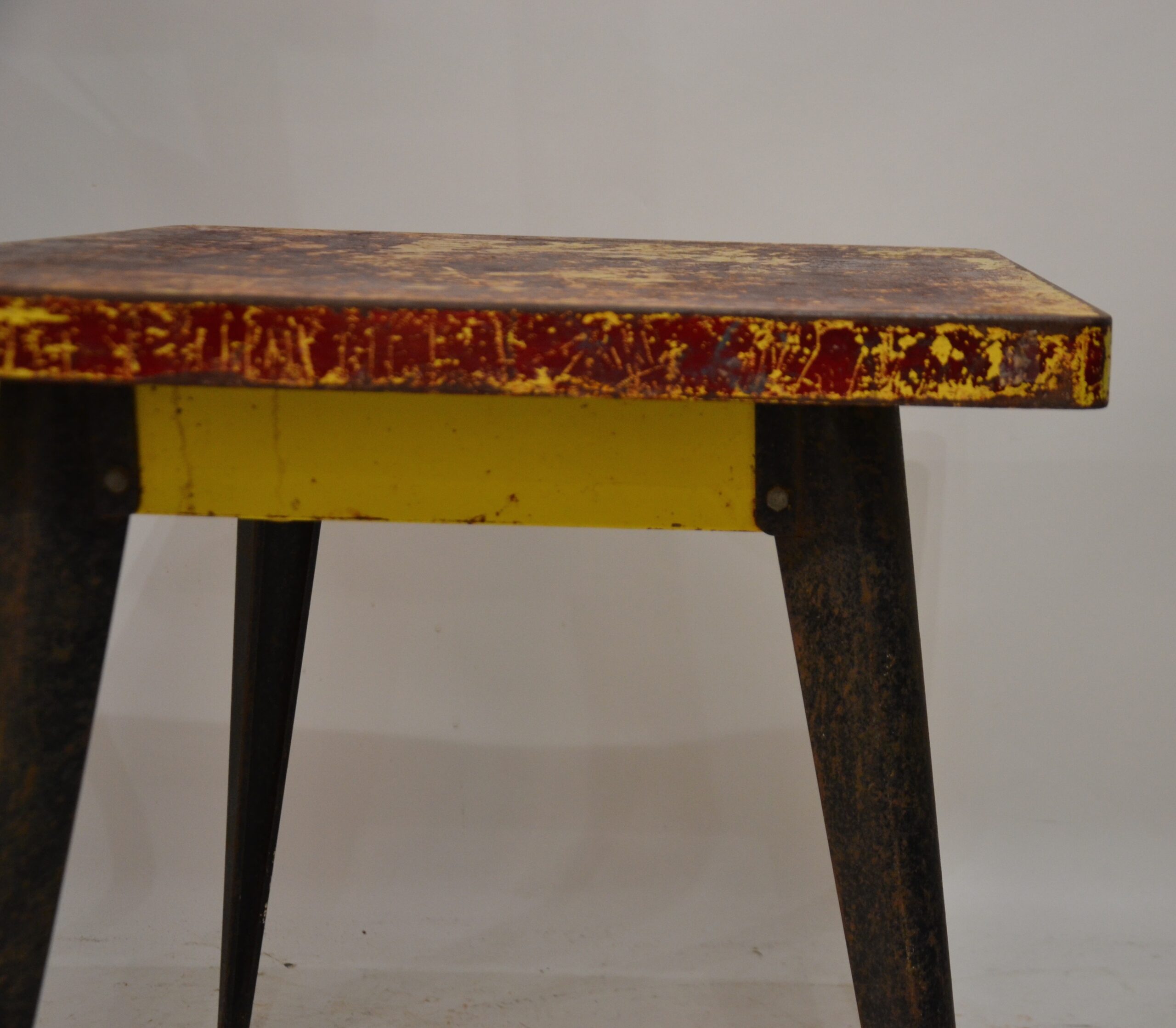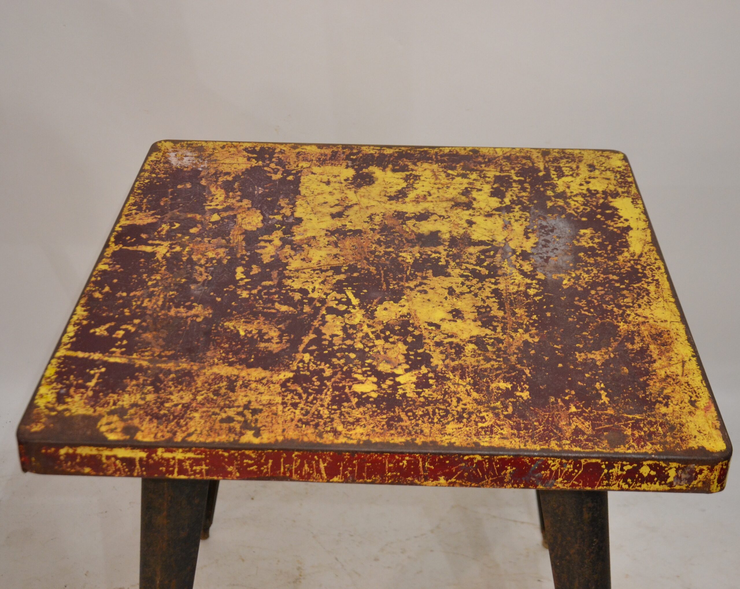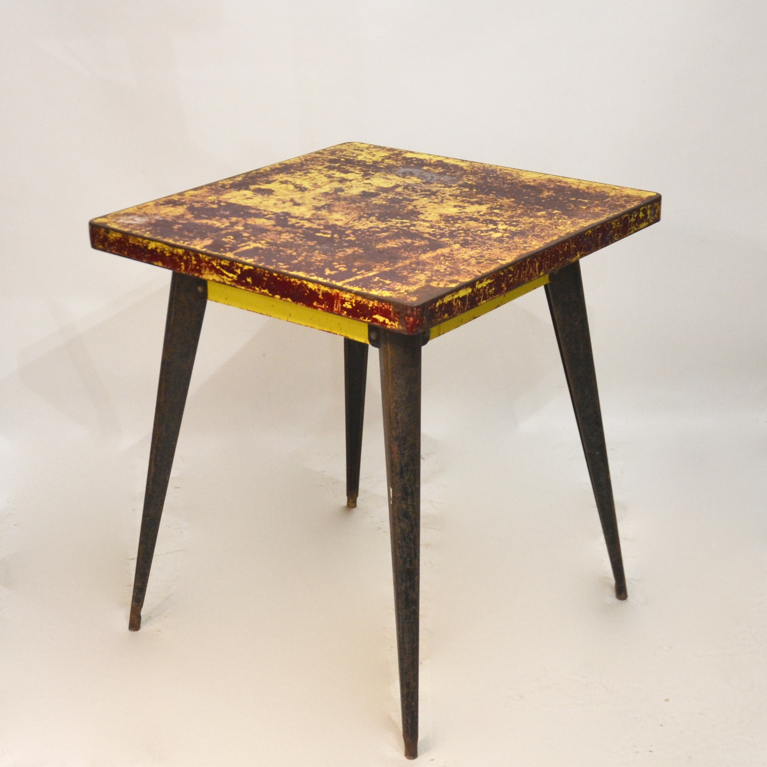 Très belle table ancienne de Xavier Pauchard pour Tolix, tout en métal, de petites dimensions et carrée pour se caser dans la cuisine ou dans le séjour sans encombrer l’espace. On peut l’utiliser à l’extérieur.