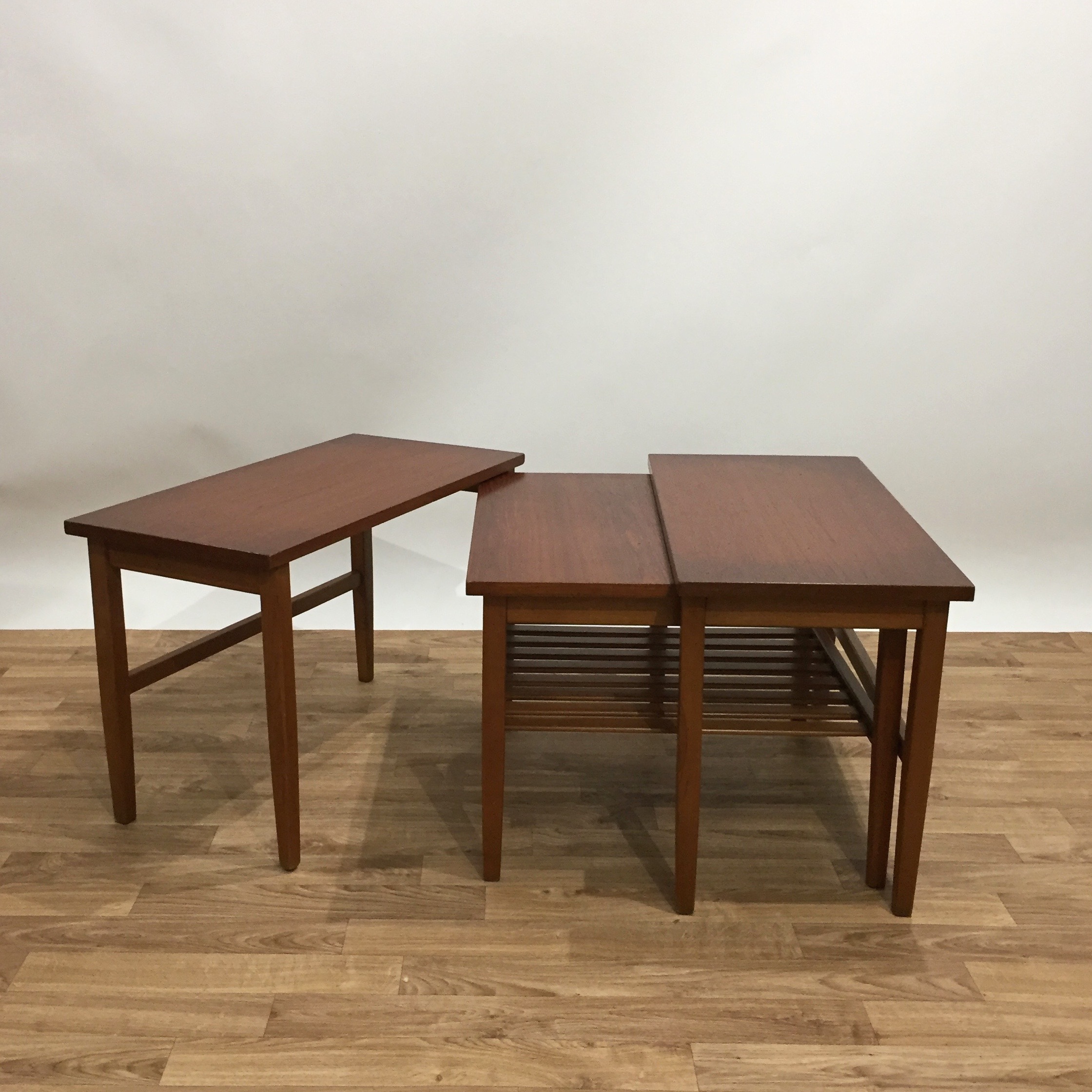 Superbe modèle de table basse gigogne scandinave des années 60 en teck. Une petite table basse principale se range sous deux autres tables que l’on peut donc dispatcher en bout de canapé ou placer à côté des invités quand on reçoit. On peut également les utiliser comme chevets dans la chambre.