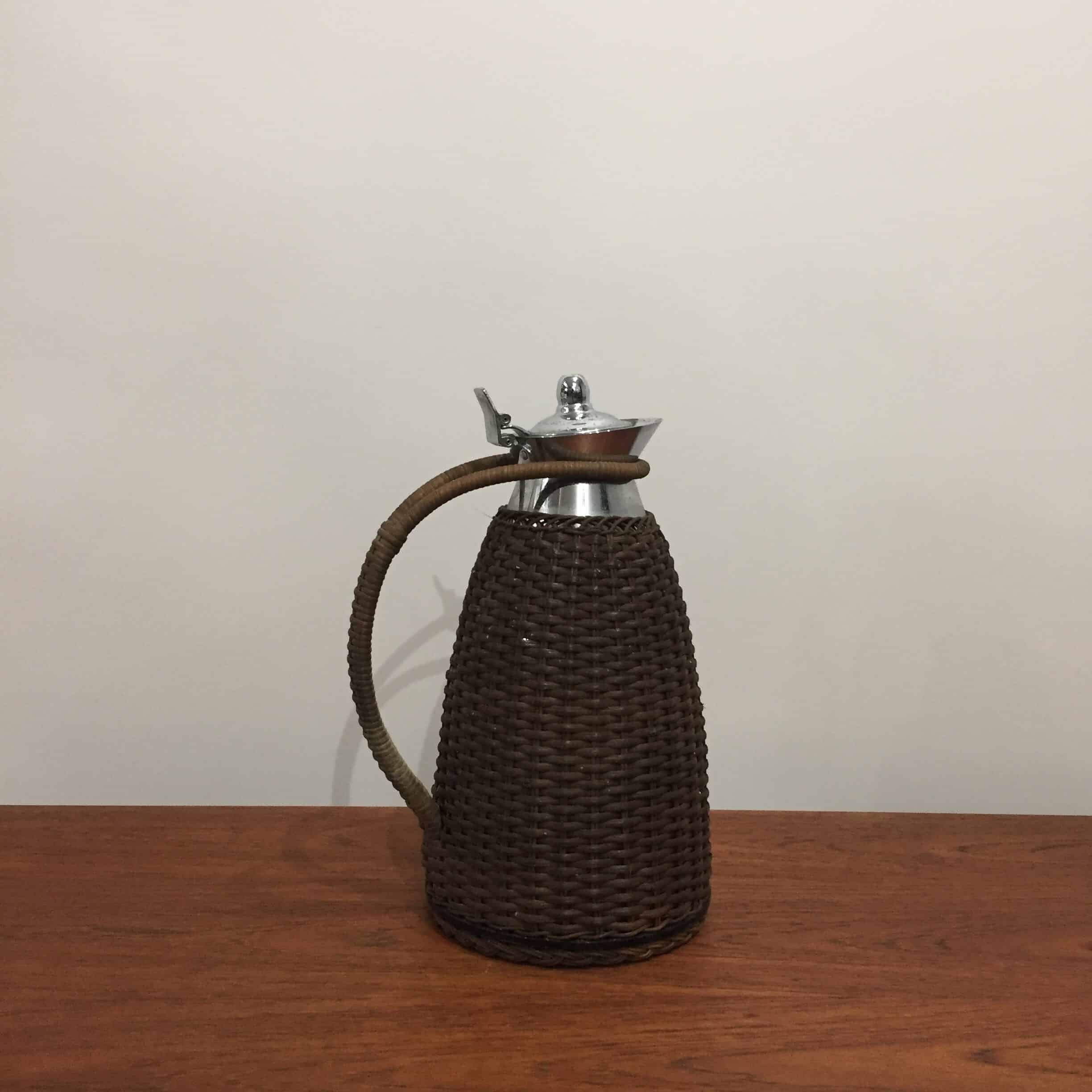 Thermos des années 70 décoré d’osier, pour garder son thé ou café au chaud.