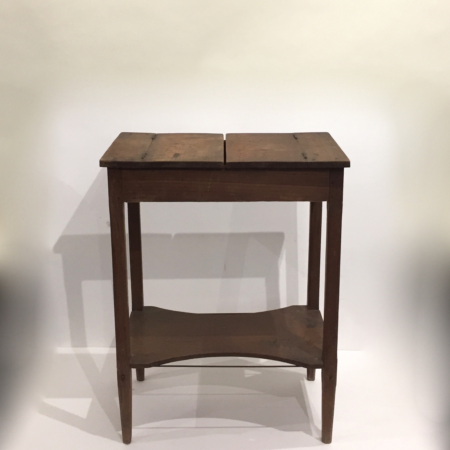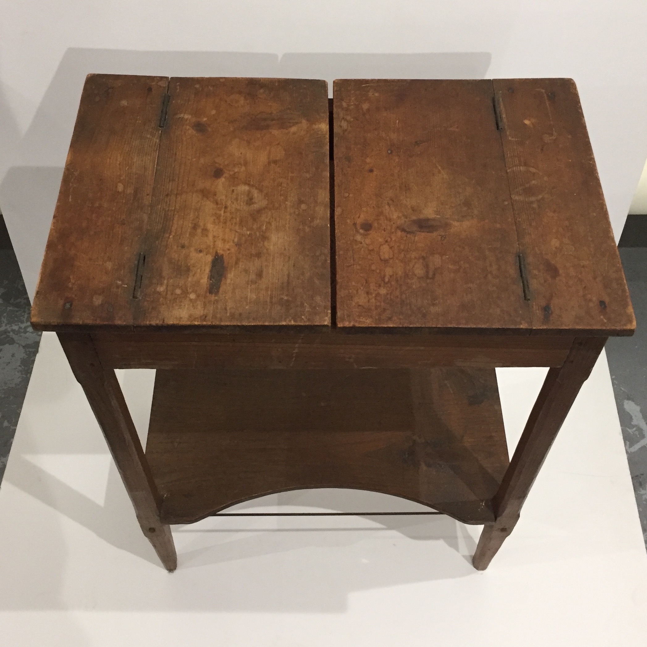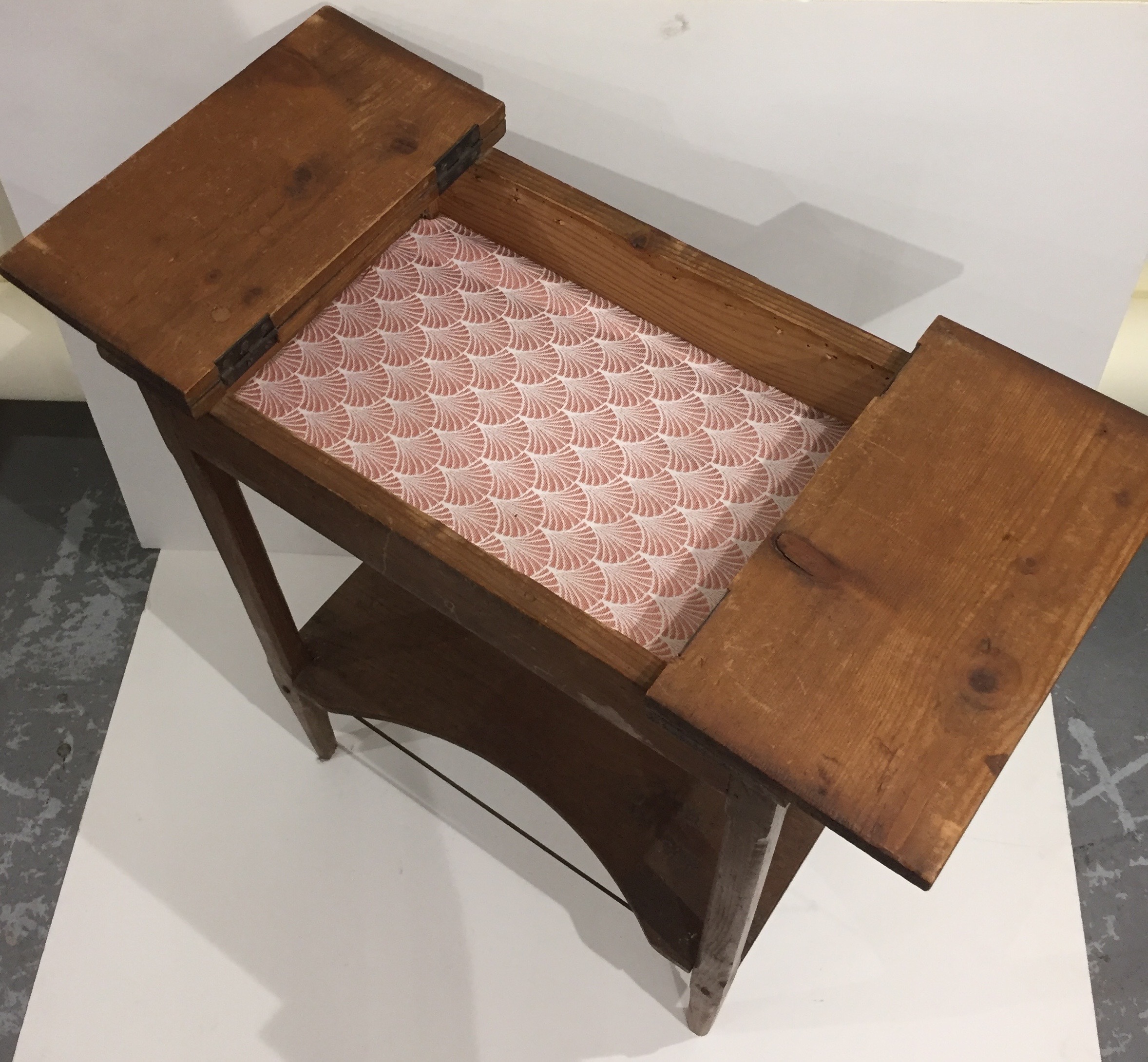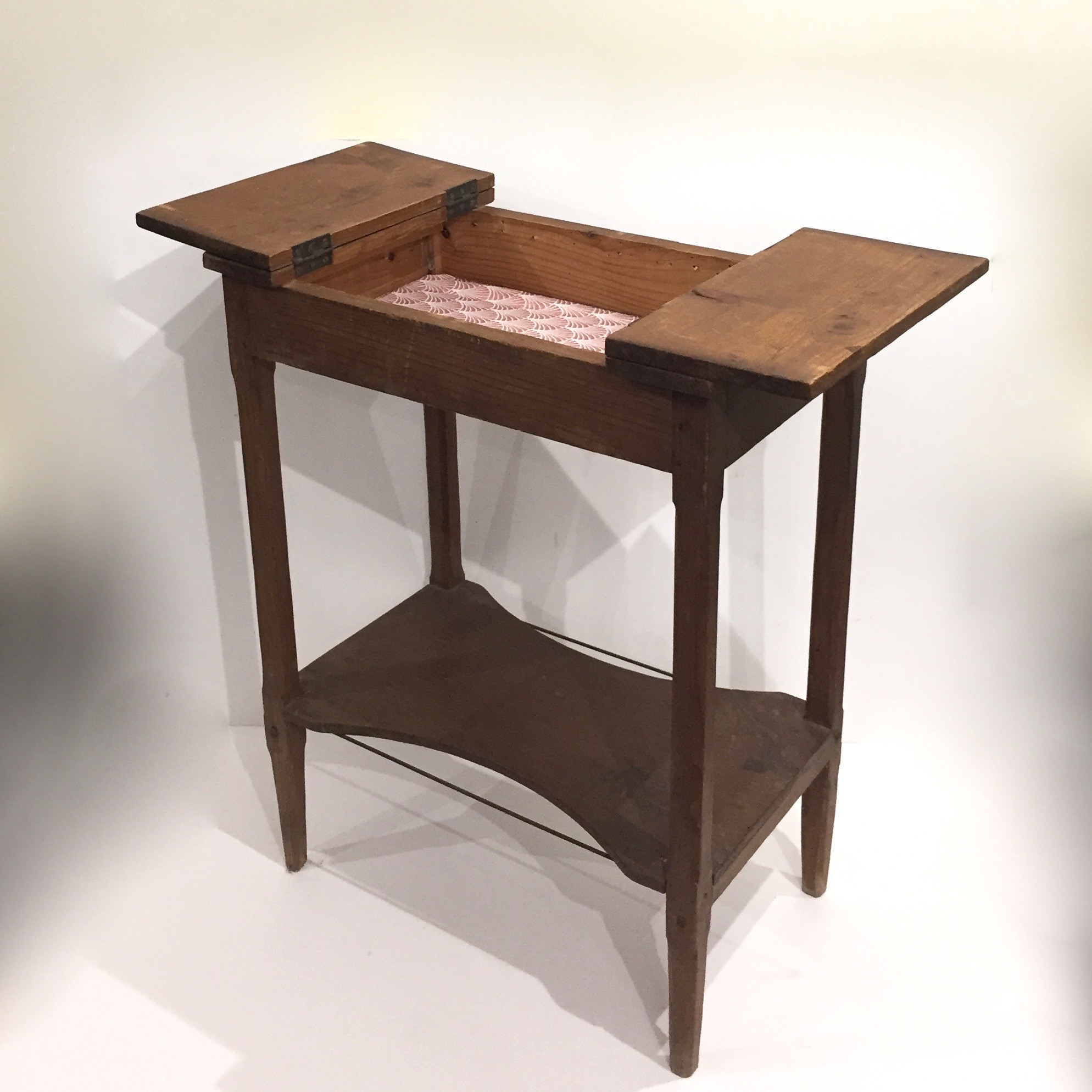 Jolie travailleuse ancienne en bois et tissu, sur laquelle on réalisait ses travaux de couture et dans laquelle on rangeait les aiguilles et tout le matériel. Aujourd’hui, cette charmante table d’appoint peut trouver sa place dans l’entrée ou en chevet dans la chambre. Le compartiment à l’intérieur est constitué par un tissu suspendu, donc on ne peut pas y mettre de choses trop lourdes mais c’est parfait pour les clés ou des bijoux.