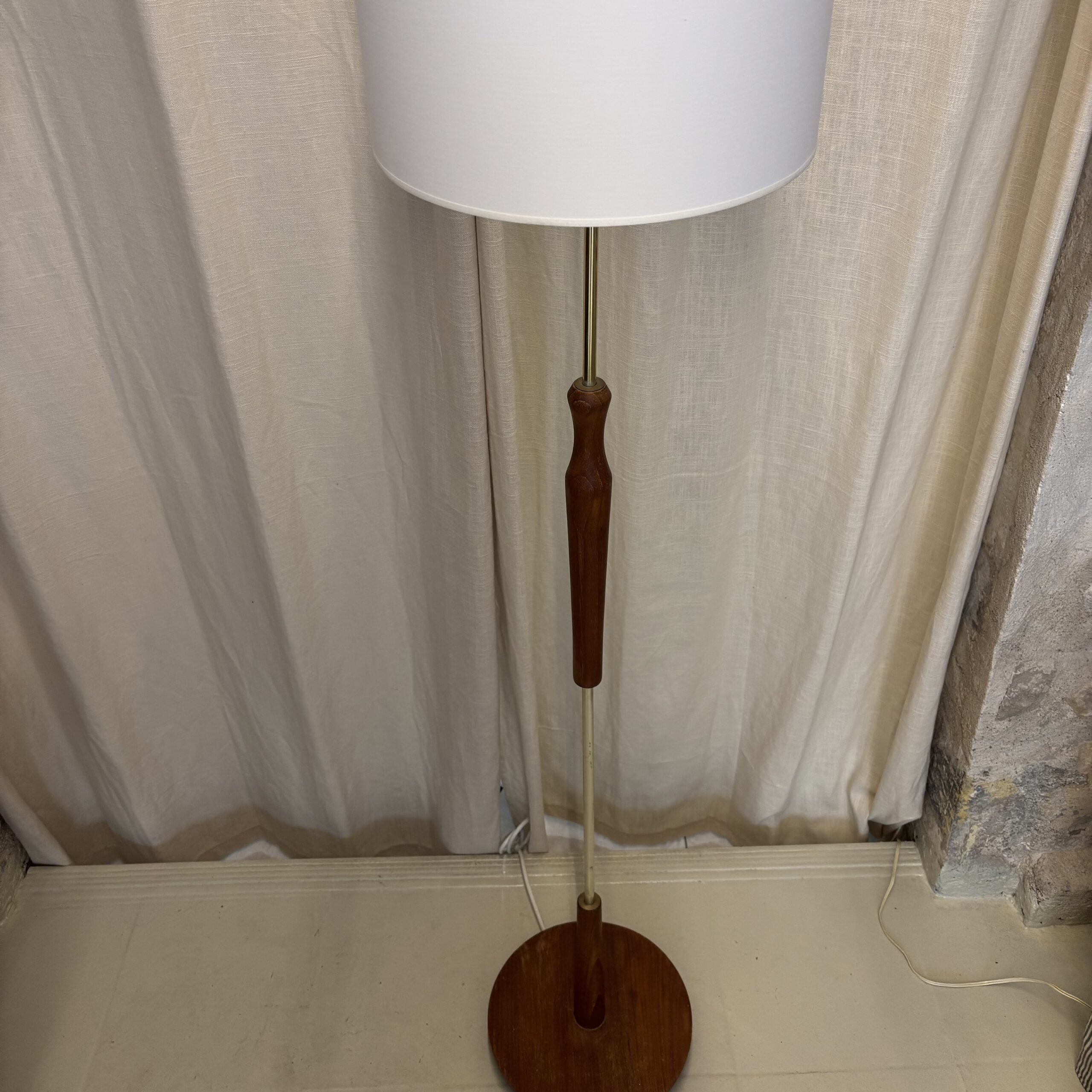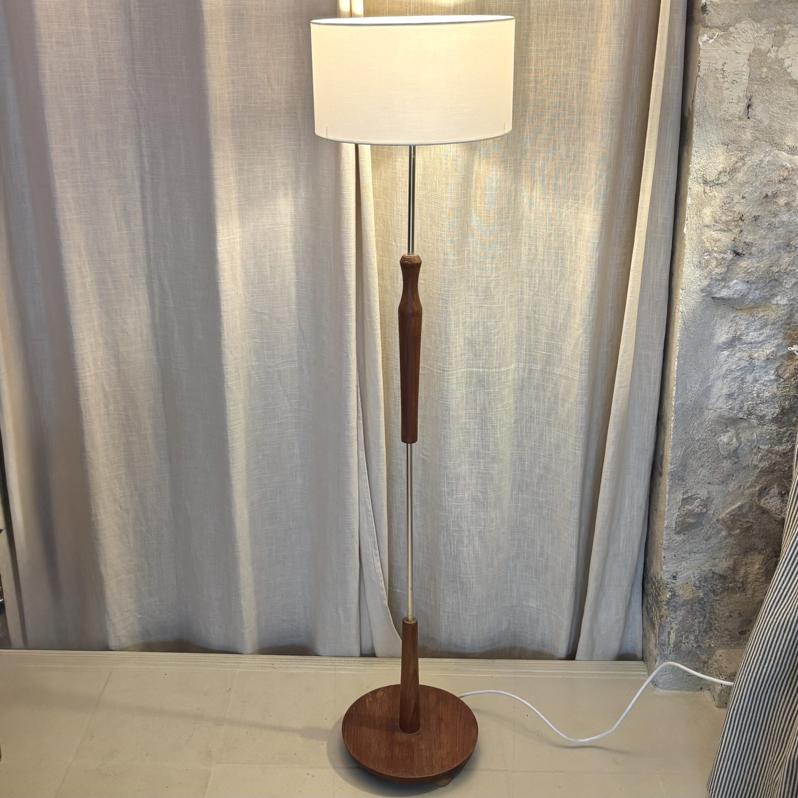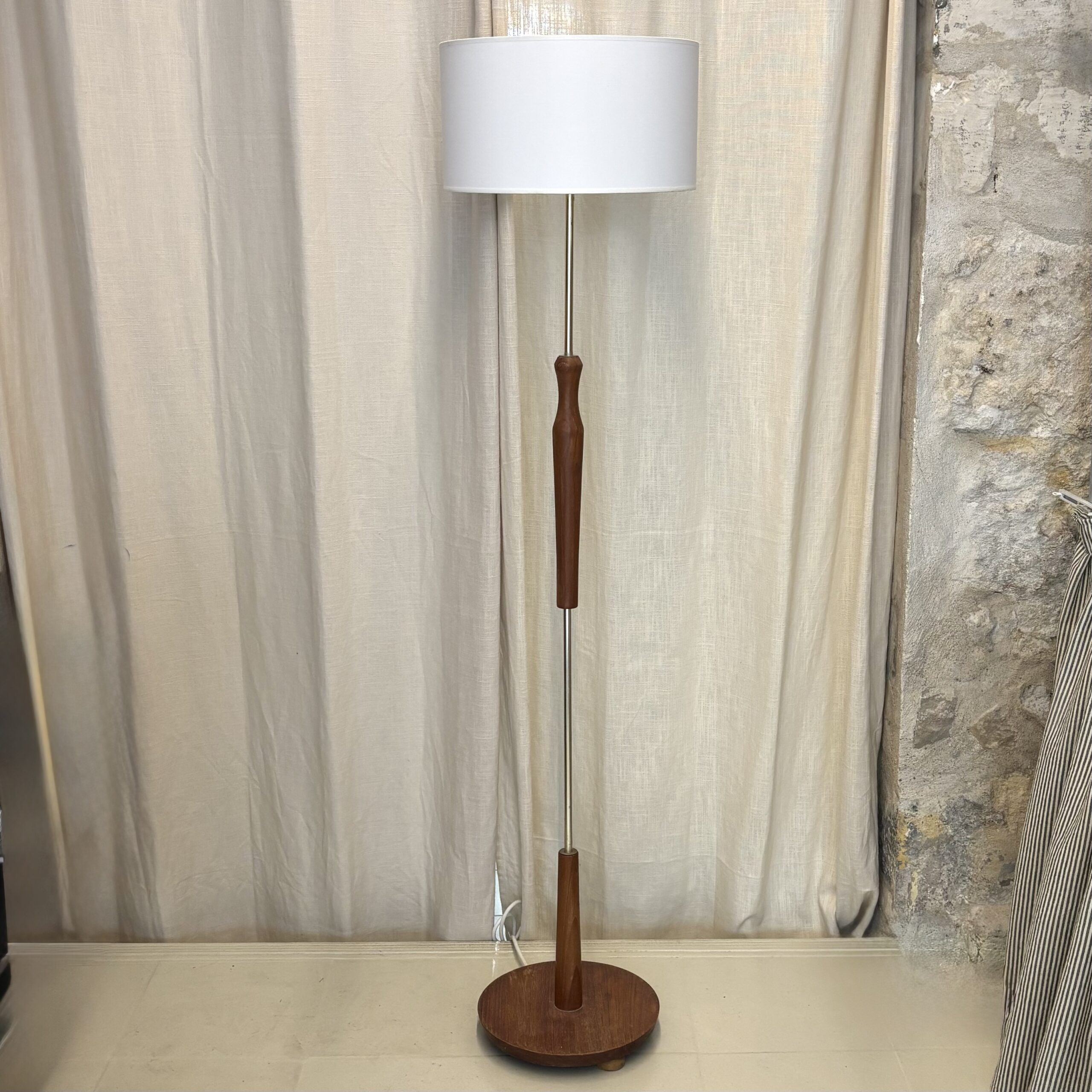 Très joli lampadaire des années 60 avec un pied en métal doré et teck de style scandinave et un abat-jour blanc crème neuf de fabrication française.