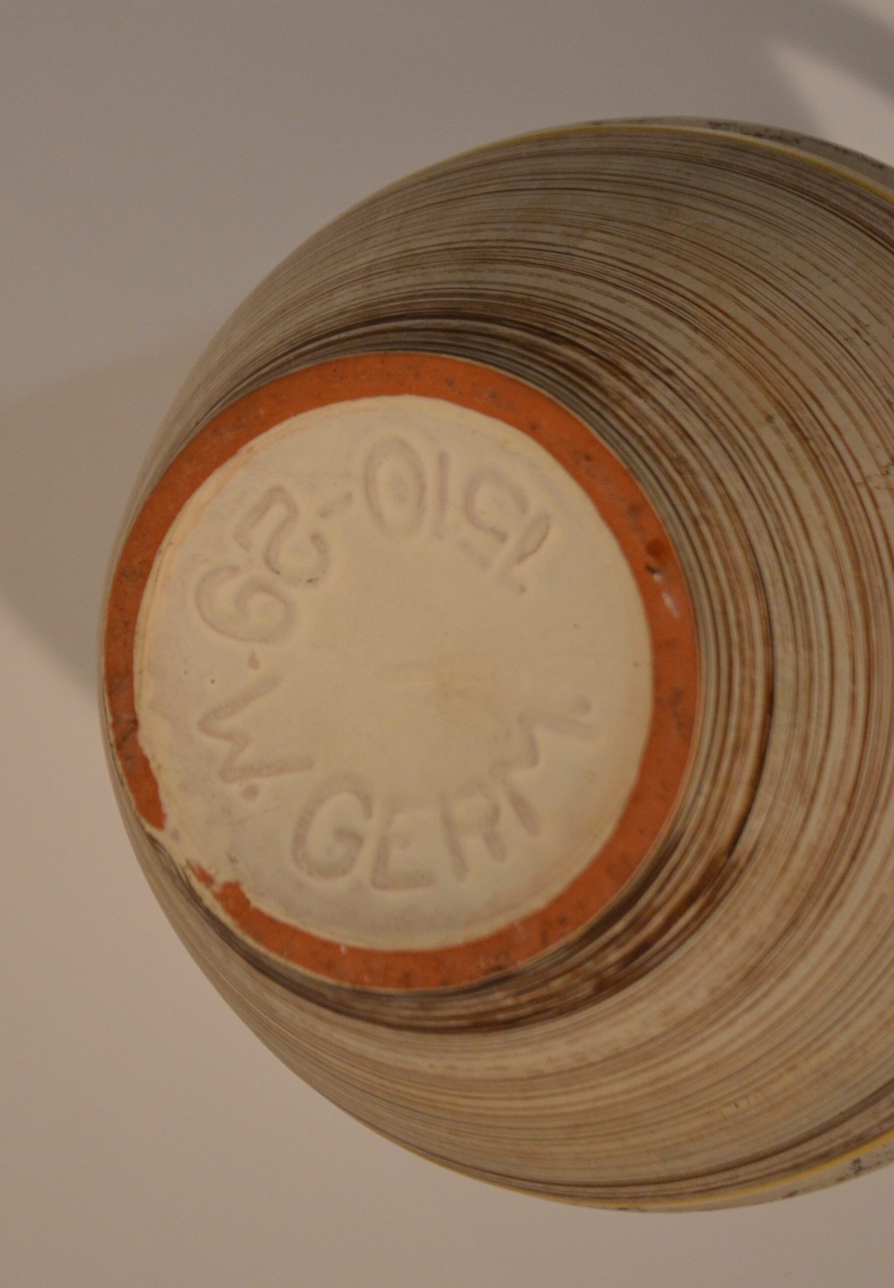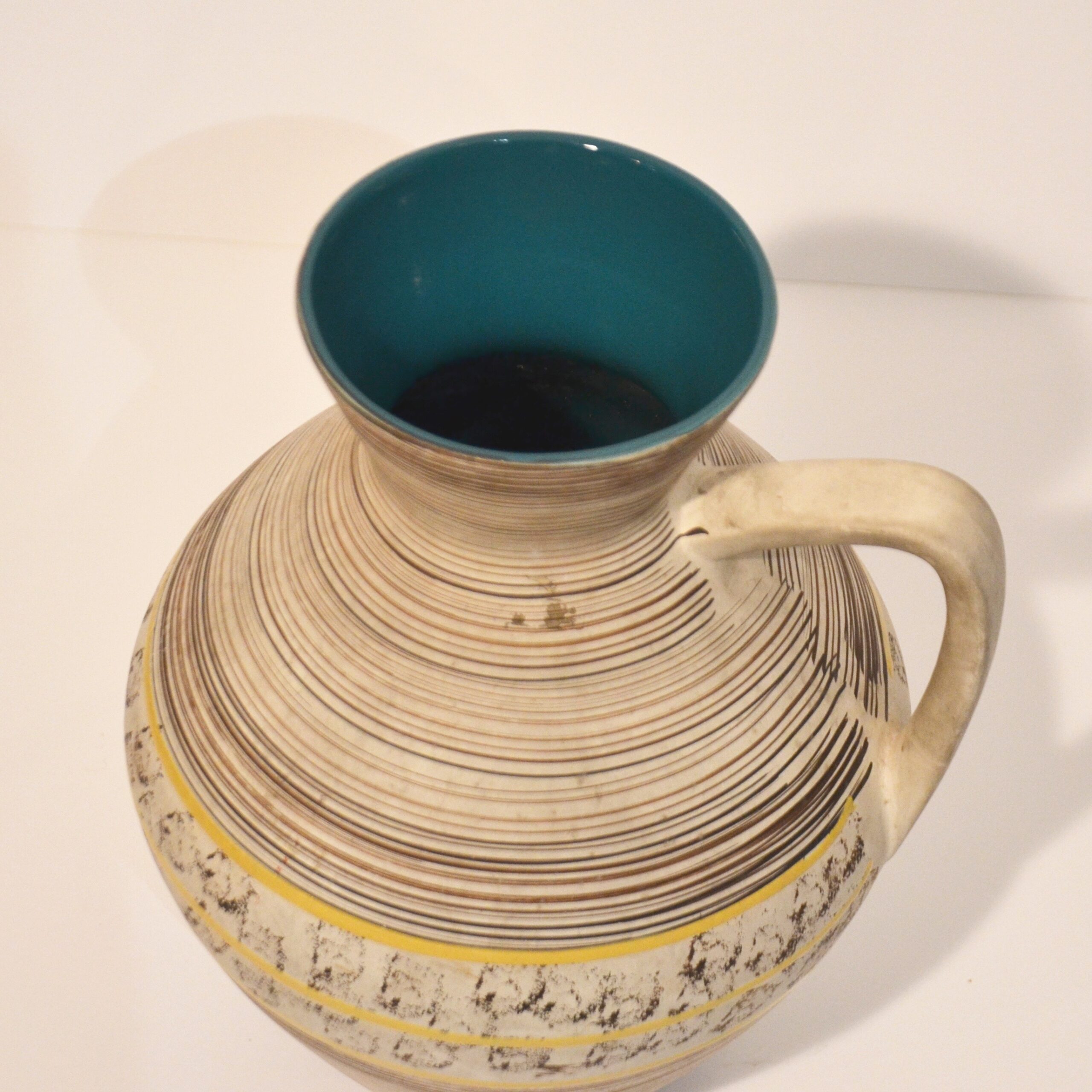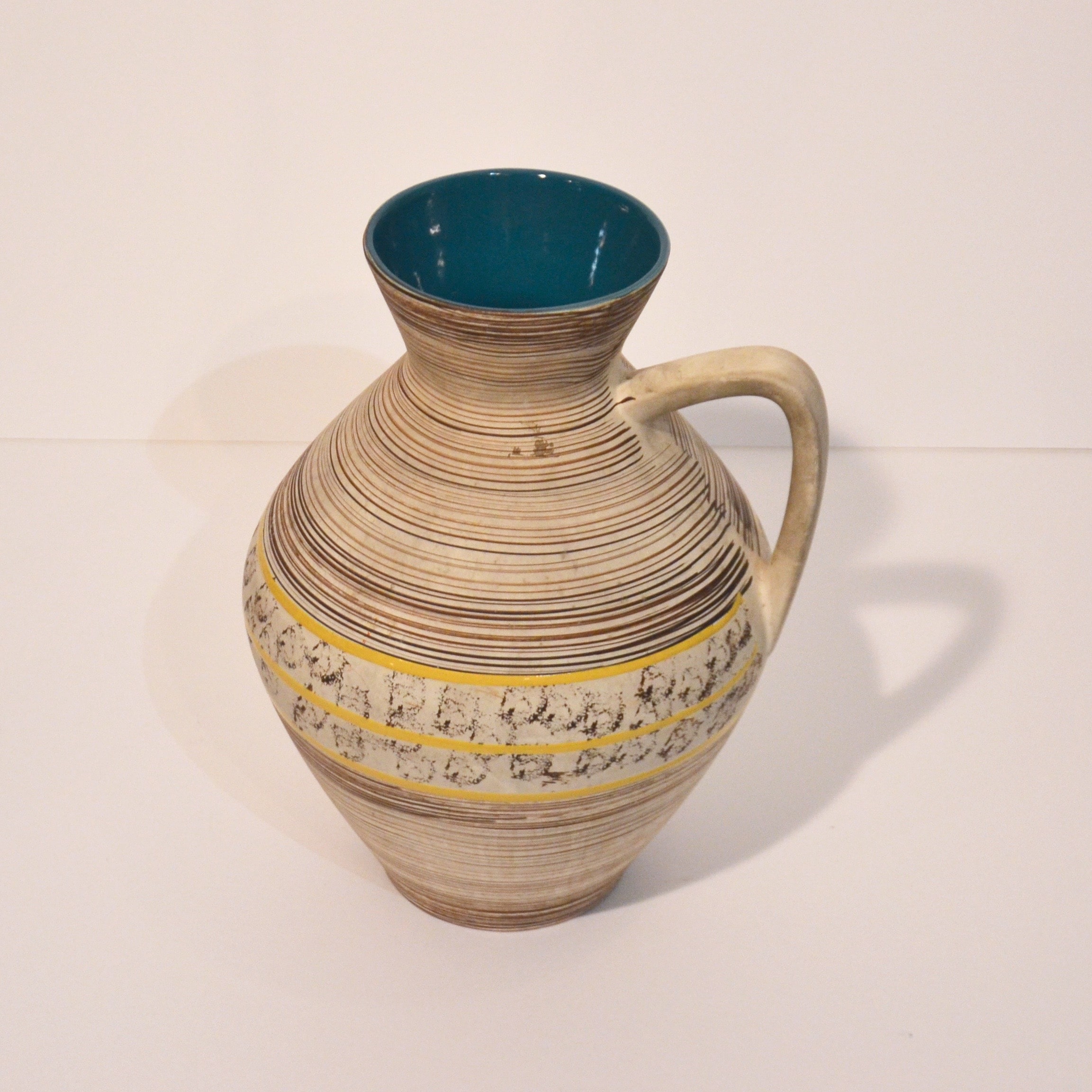 Joli vase West Germany des années 60 en céramique, de couleur beige et jaune à l’extérieur et vernissé bleu à l’intérieur. Seule avec un bouquet de fleurs séchées ou associée à d’autres céramiques, elle a déjà toute sa place sur votre enfilade ou la table du séjour.