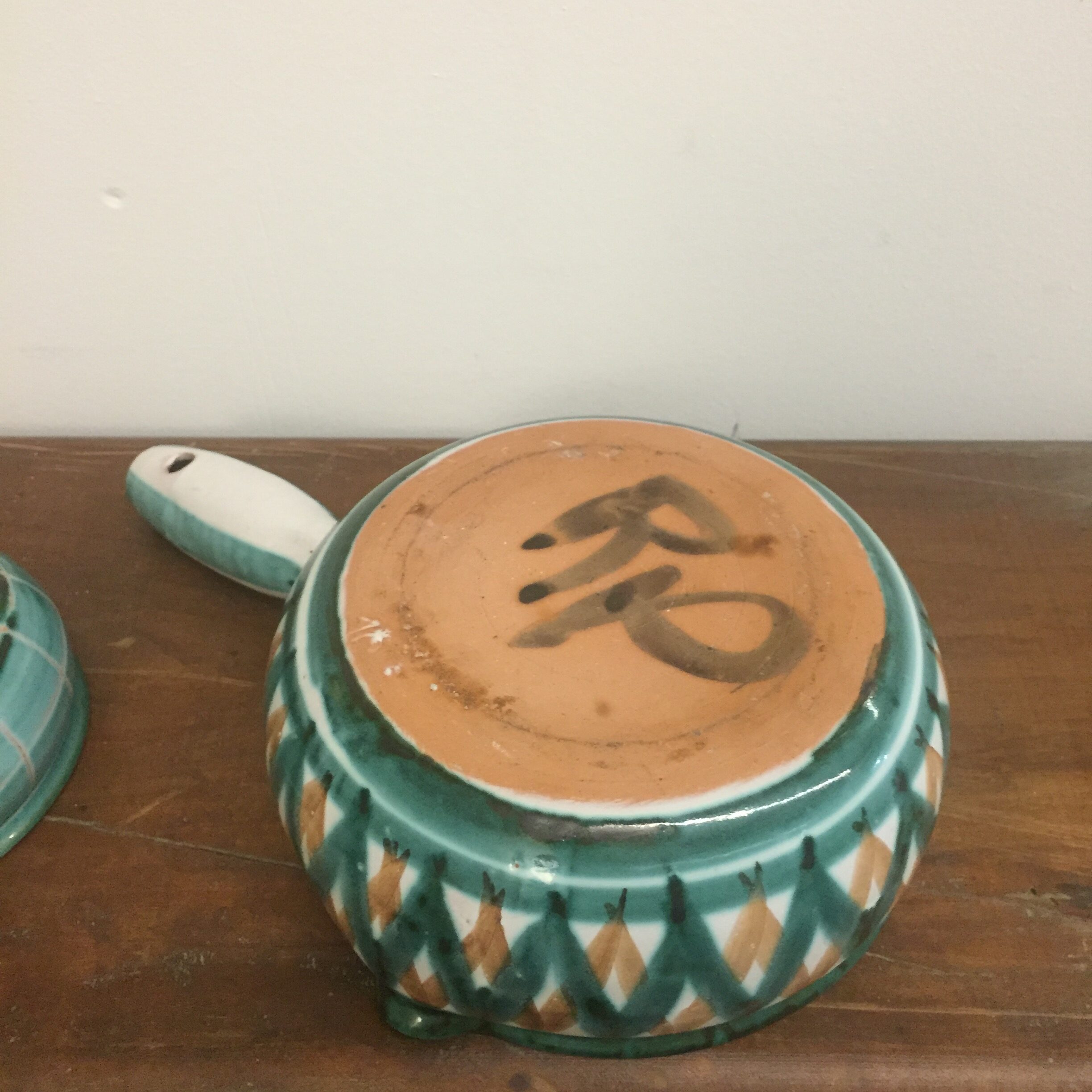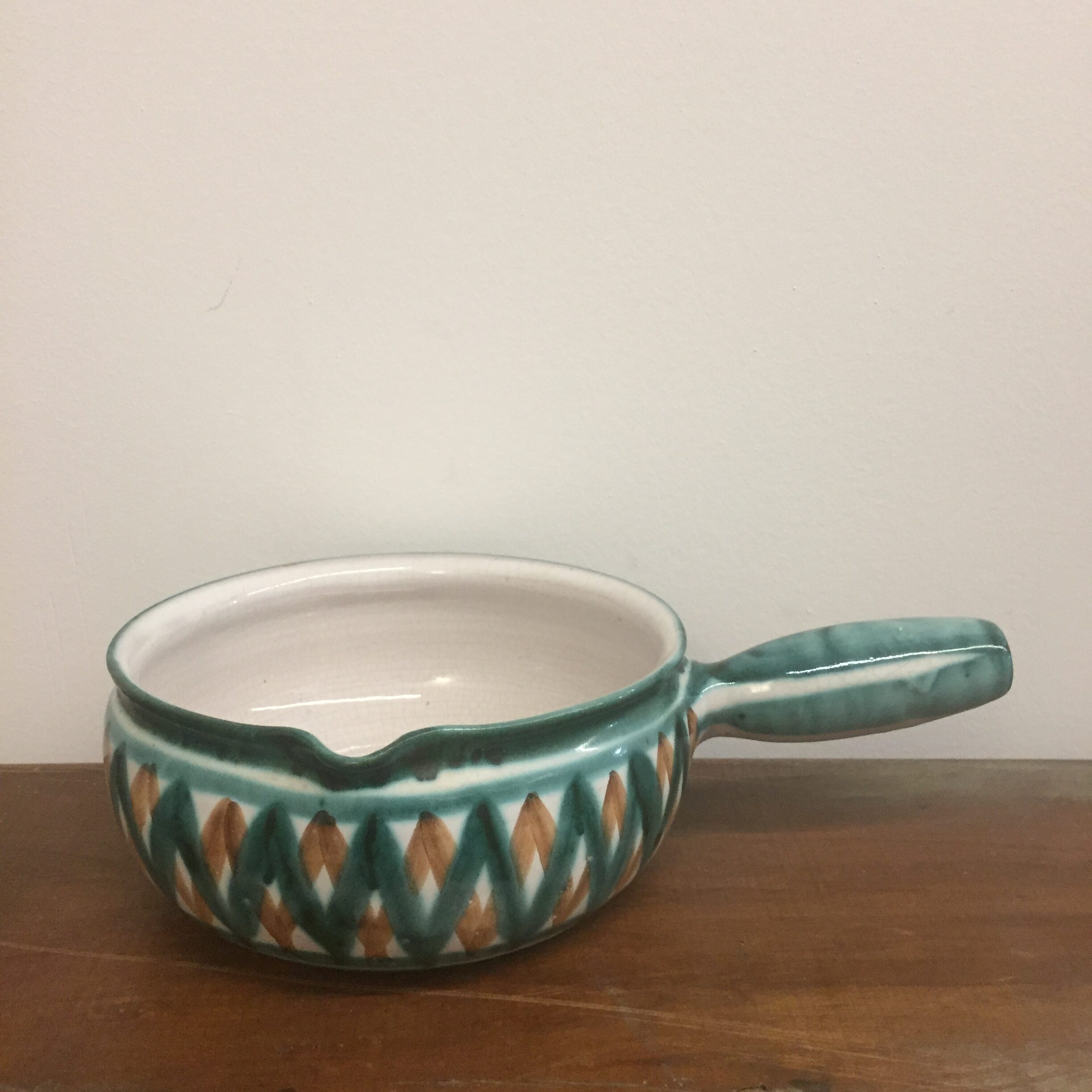 Céramiste des années 60 à Vallauris, Robert Picault a décliné ses motifs géométriques verts et bruns sur une multitude de céramiques émaillées utilitaires. Voici le caquelon, monogrammé RP au revers.