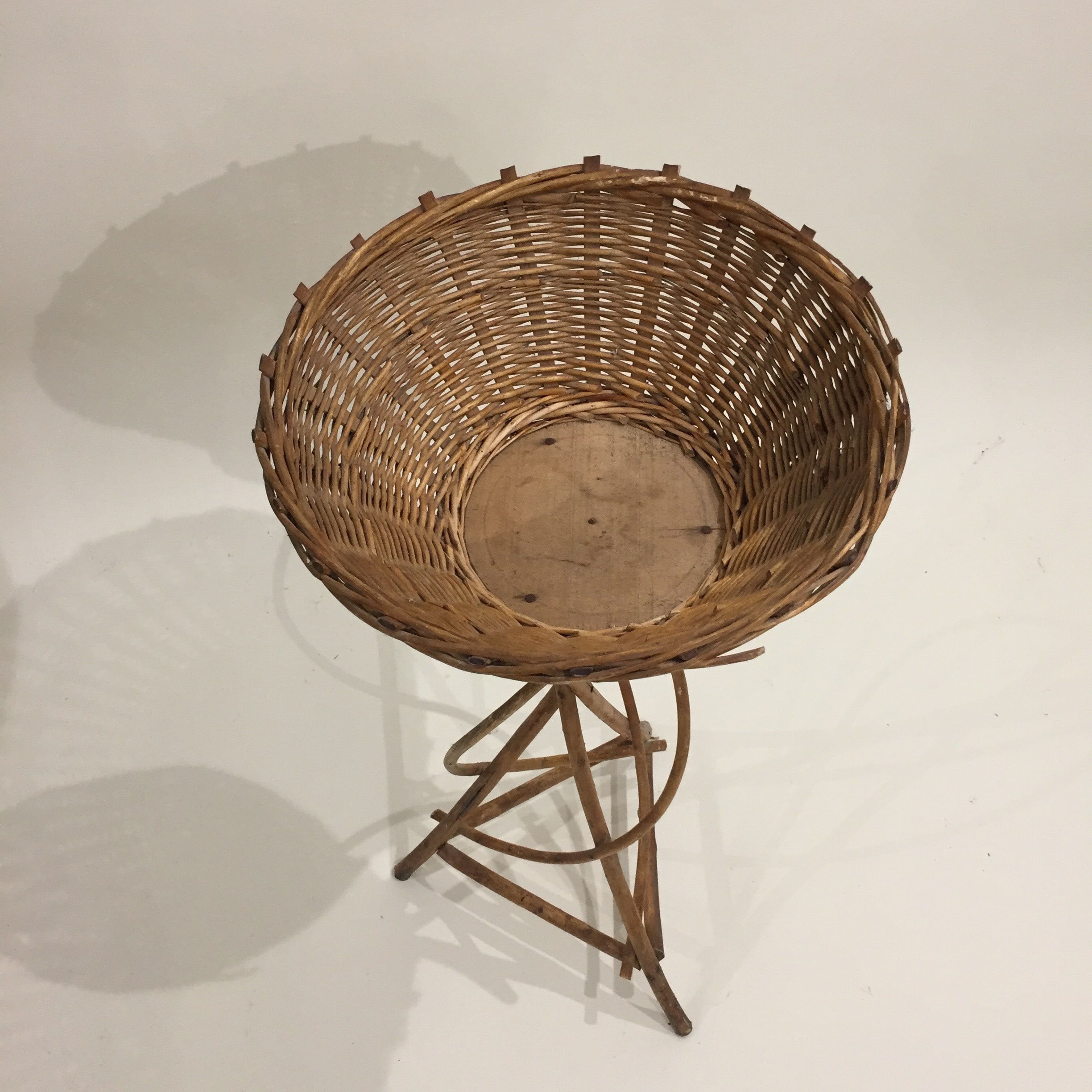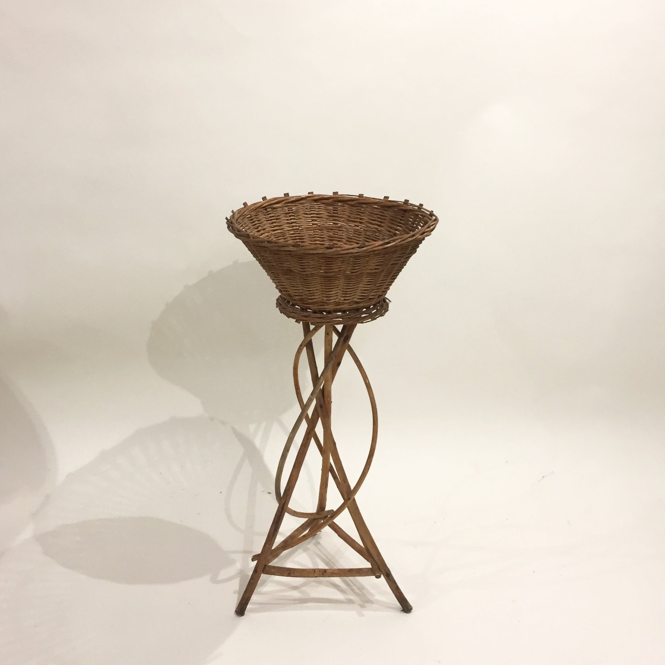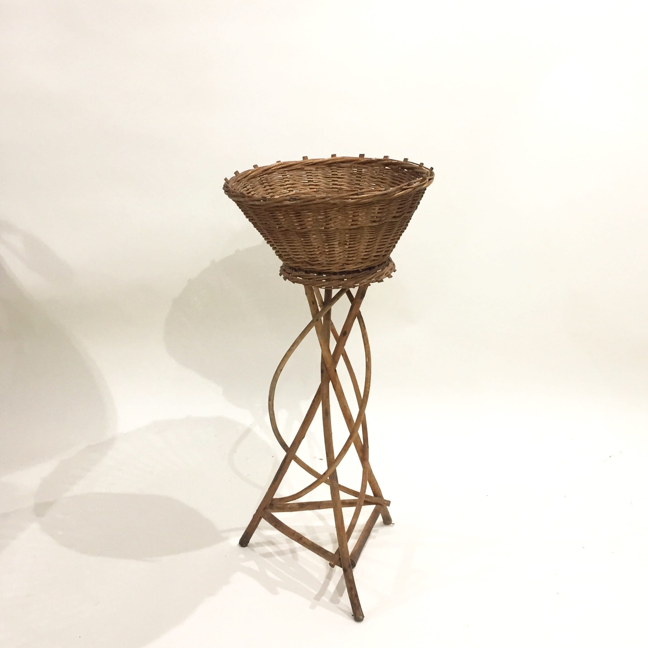 Porte-plantes en rotin des années 60, avec un panier central pour accueillir votre plante sur un pied tressé comme une liane. C’est très joli avec une plante retombante comme un lierre par exemple.