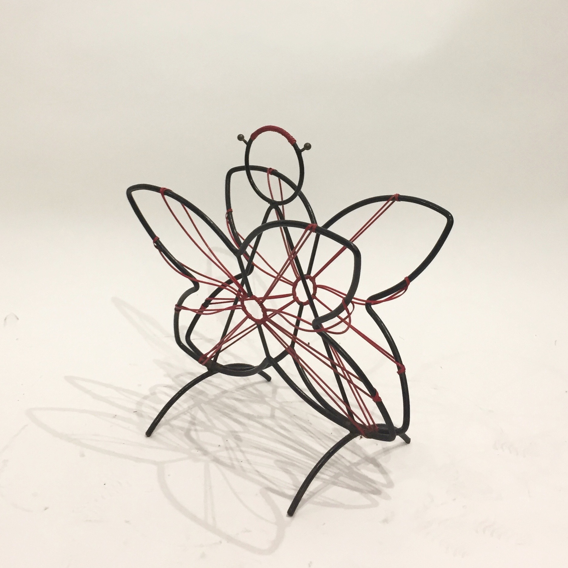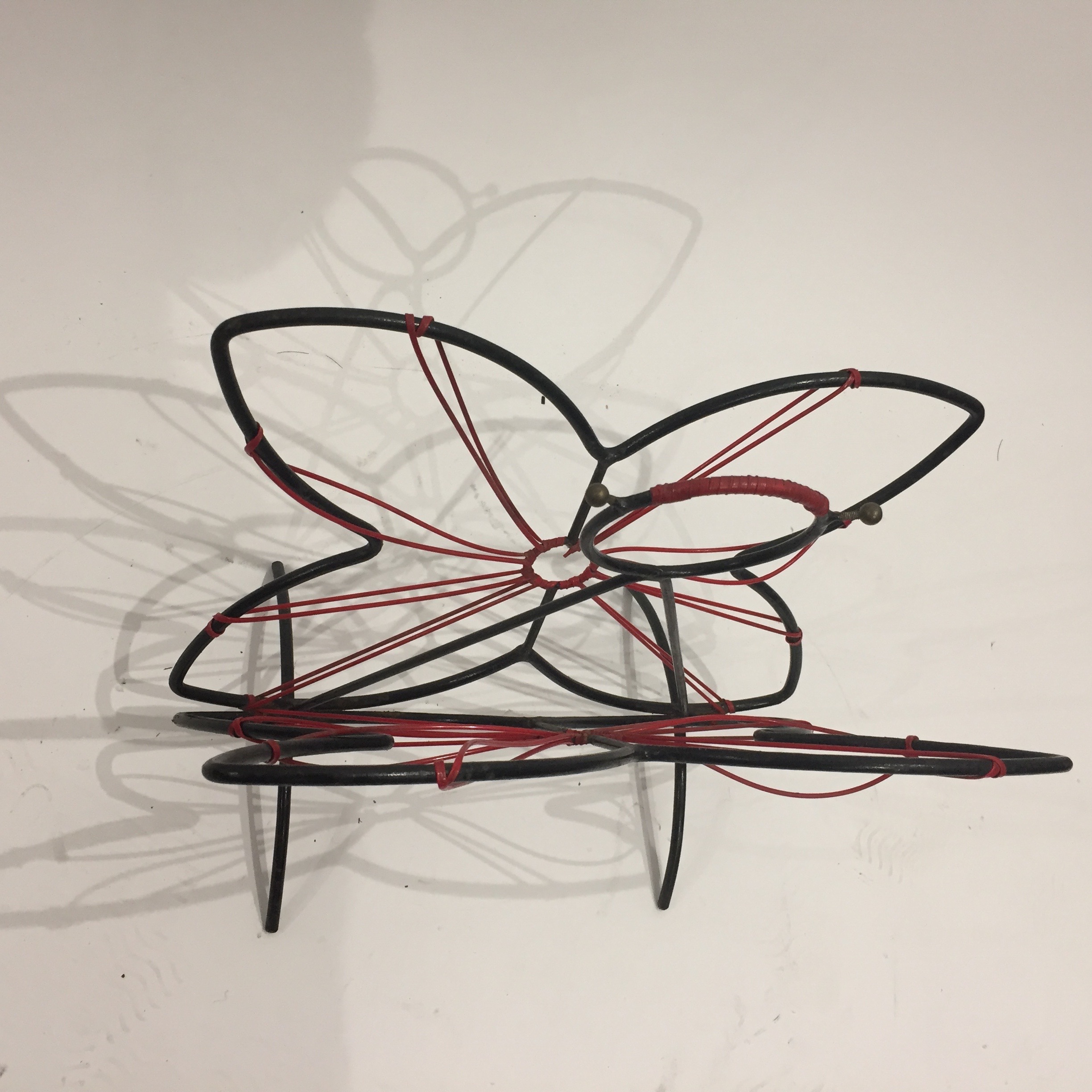 Joli porte-revues des années 50 en métal noir et fil scoubidou rouge en forme de papillon, mignon non?