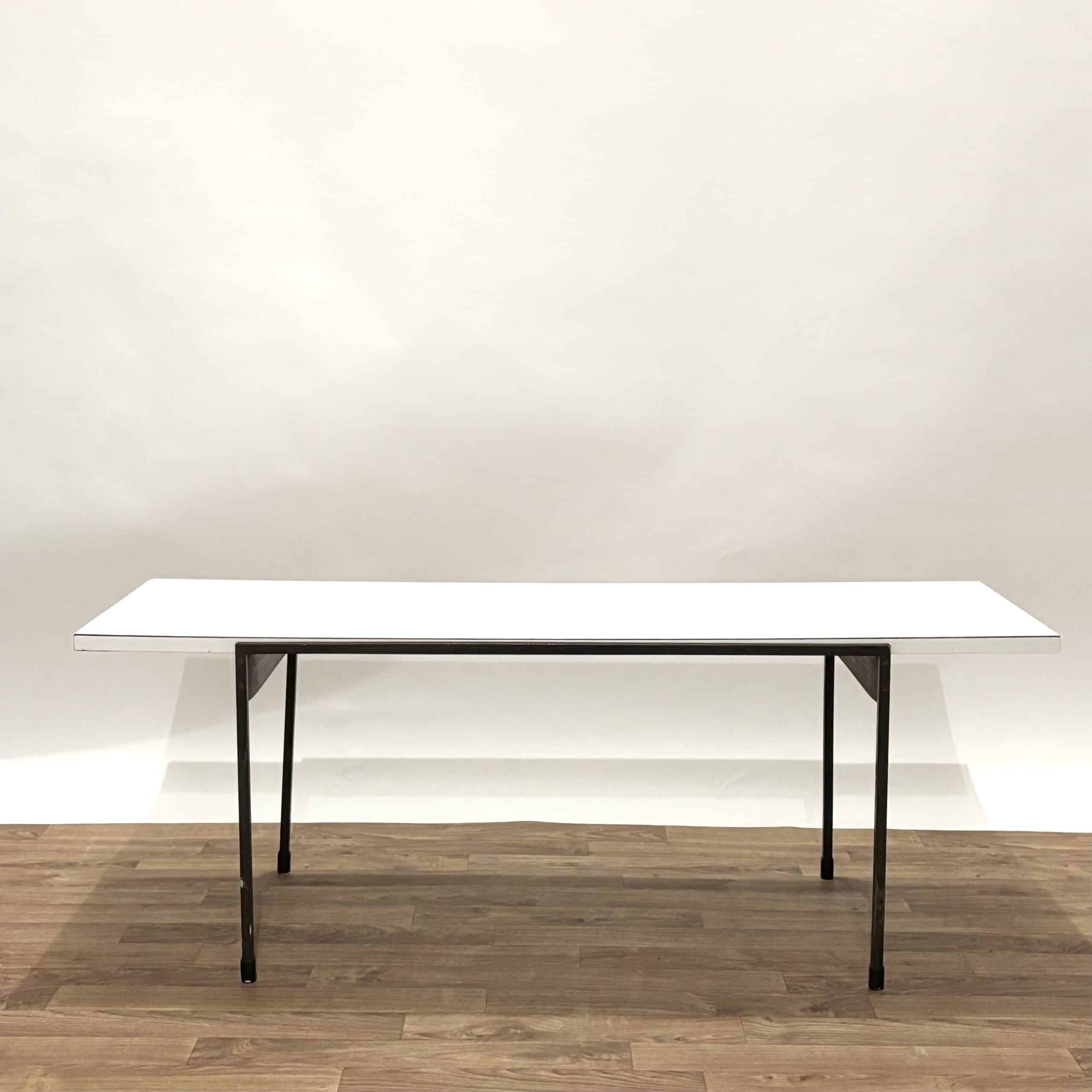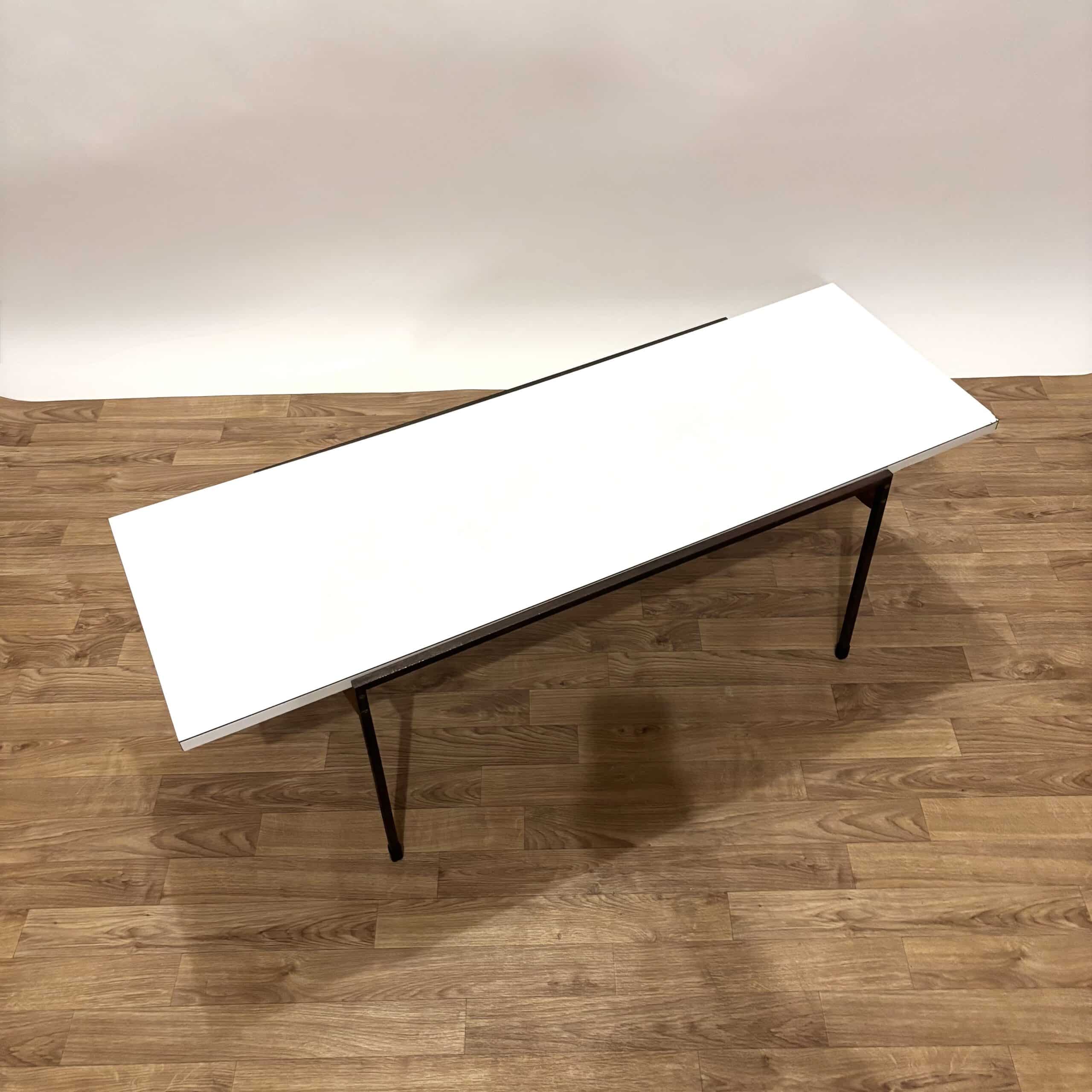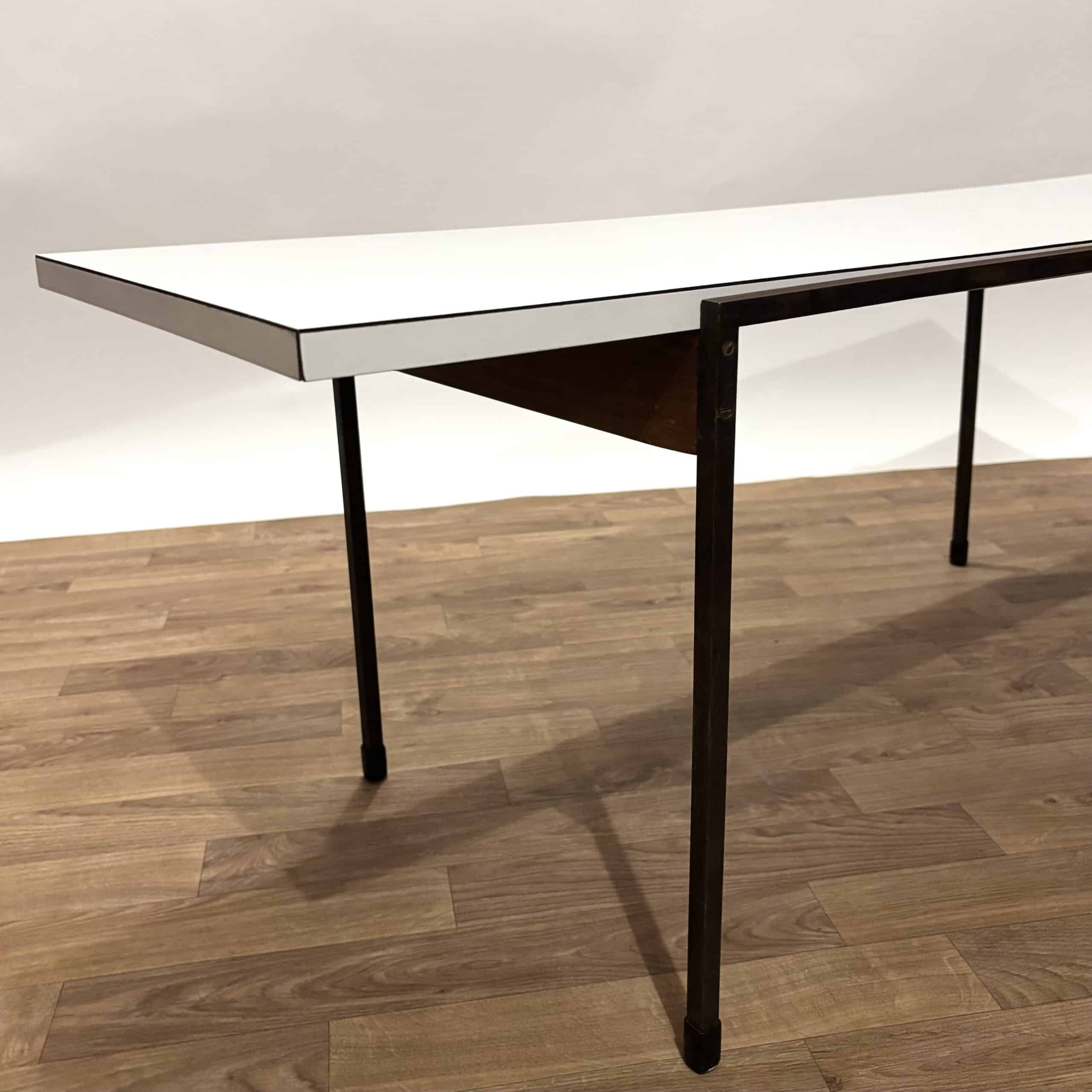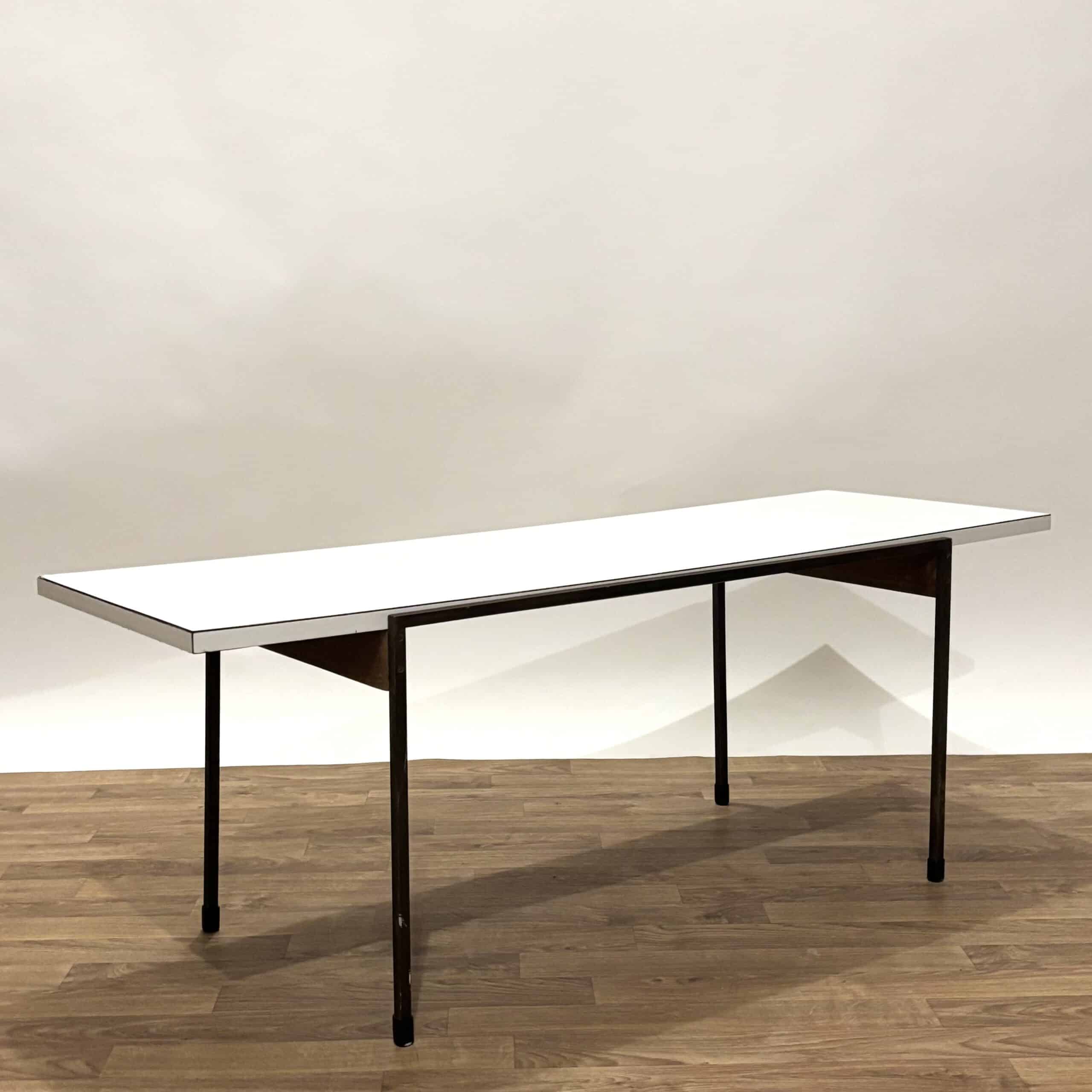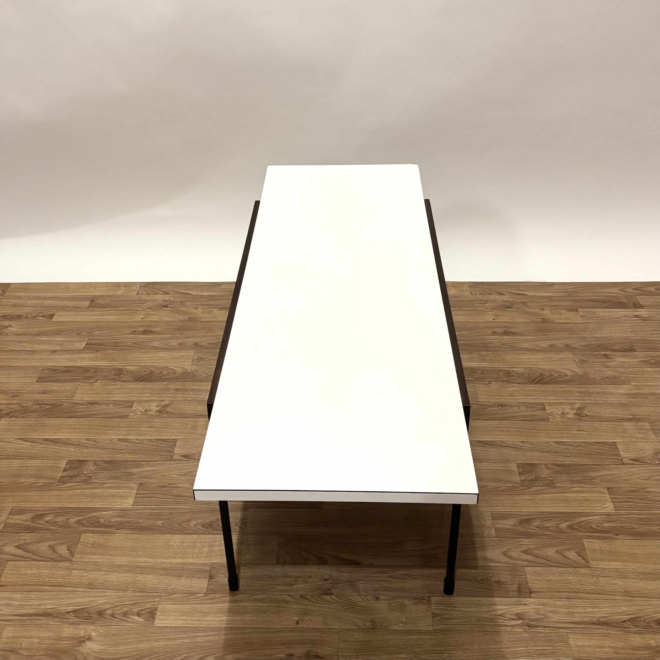 Superbe table basse des années 60 de style moderniste, avec une structure en métal et un plateau mélaminé blanc. Impossible de déchiffrer l’étiquette en dessous, mais ce modèle rappelle ceux du designer Cees Braakman pour Pastoe.